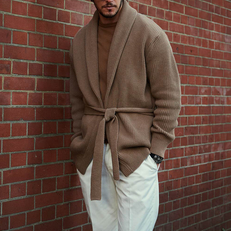 Our men's fashionable knit cardigan with belt and deep collar Skorter is the ideal choice for style-conscious men who value comfort and elegance. This cardigan is made from high-quality, breathable wool that ensures a pleasant wearing experience while keeping you warm. The textured knit pattern gives the cardigan a special touch and provides a sporty-elegant look.