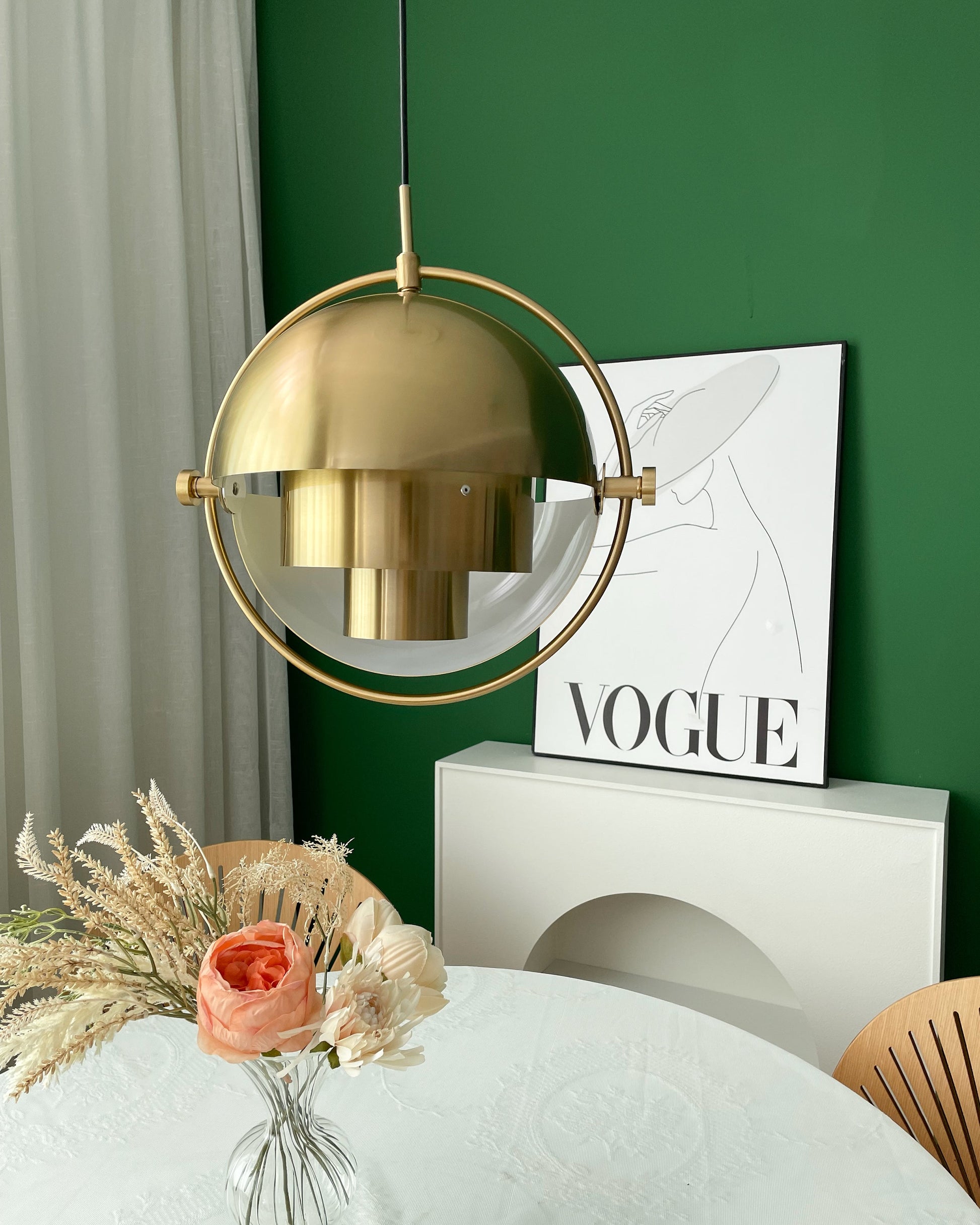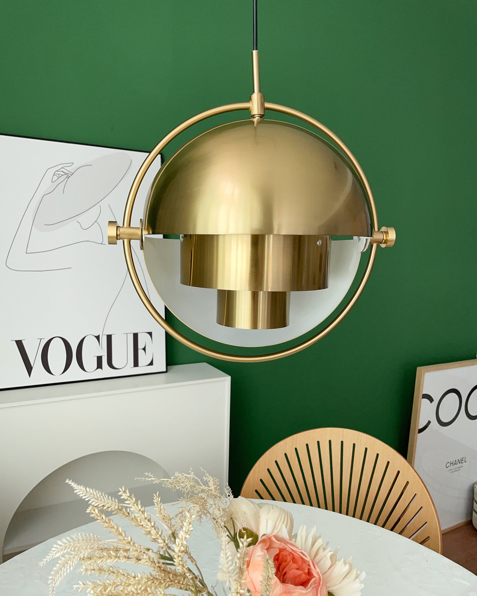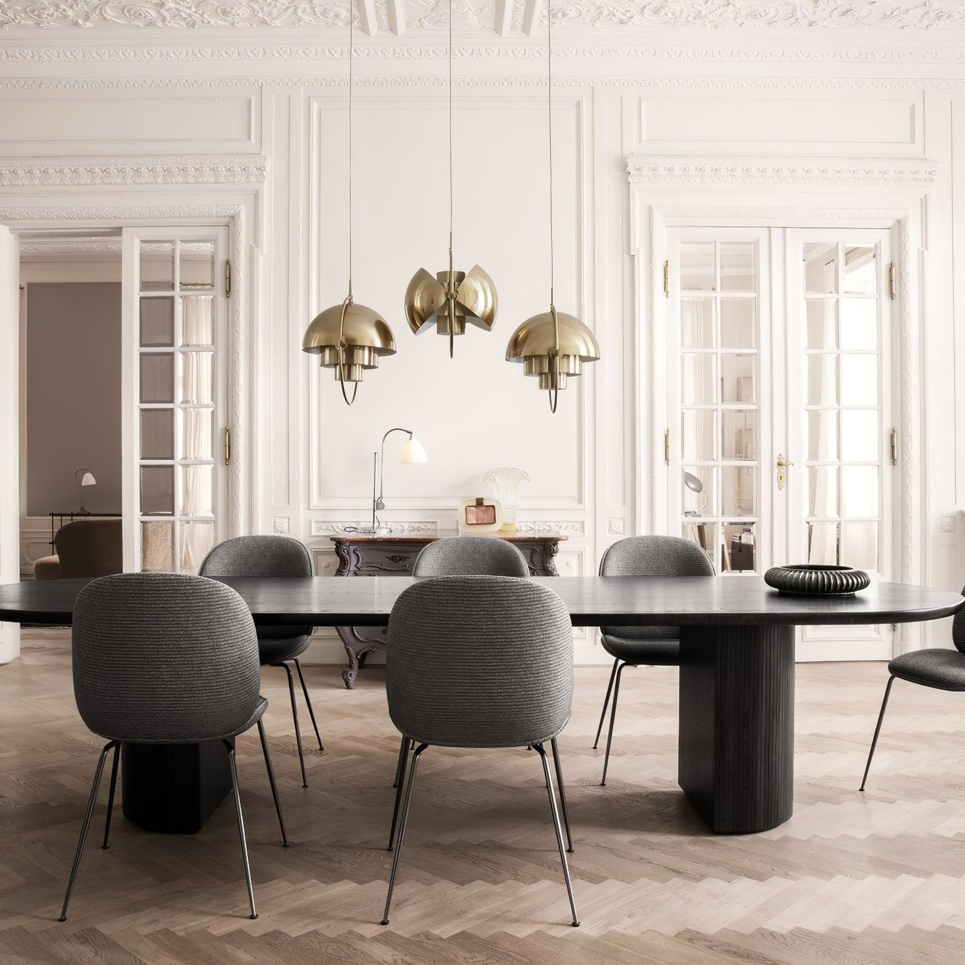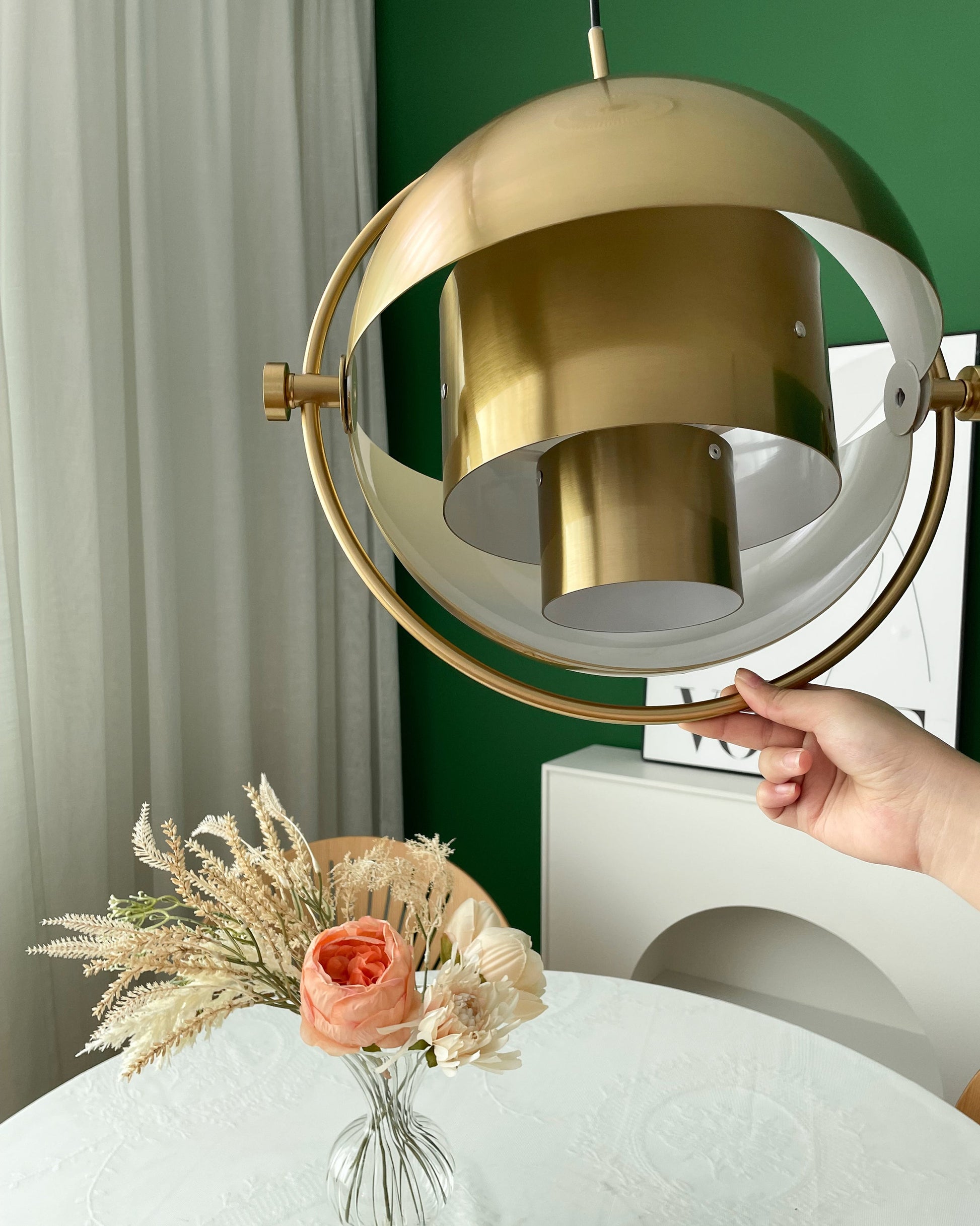 Lowering both halves directs the light towards the ceiling, creating a warm ambiance. Raising them generates downward light, perfect for illuminating a dining table. Positioning the halves in opposite directions disperses light indirectly, transforming the lampshade into a sculptural masterpiece.