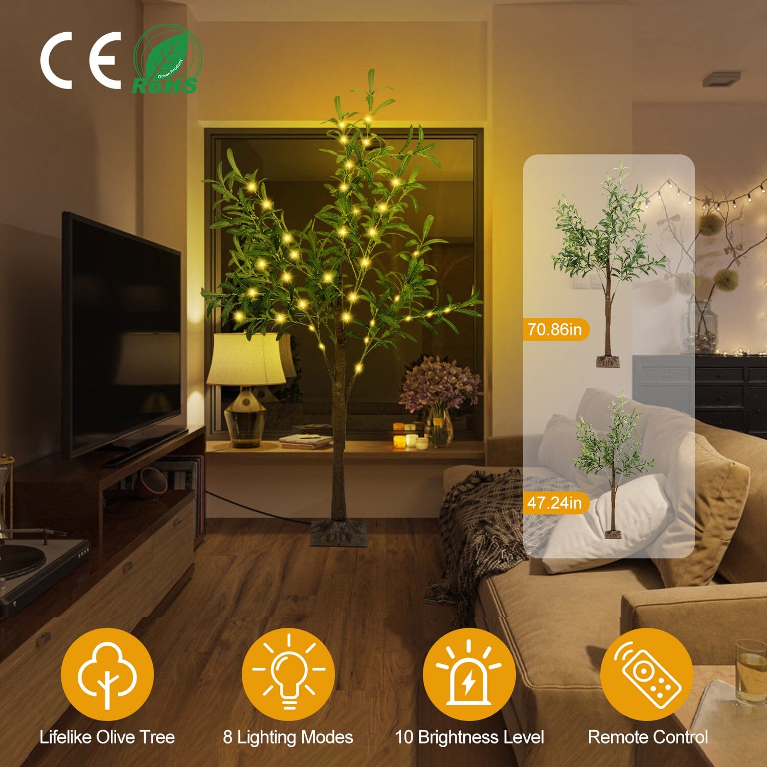Do you wish your living space could benefit from a hint of nature, energy, and warmth? Our realistic glowing olive tree is created with exceptional and detailed craftsmanship. Featuring 8 distinct lighting modes and 10 levels of brightness, it provides a variety of options to establish a warm and enchanting atmosphere. With two types of controls, it facilitates ease of use in daily routines. This artificial tree comes with a timer feature, enabling it to switch on and off automatically. It's a perfect ornament for both indoor and outdoor environments, including your living room, bedroom, patio, garden, and more.