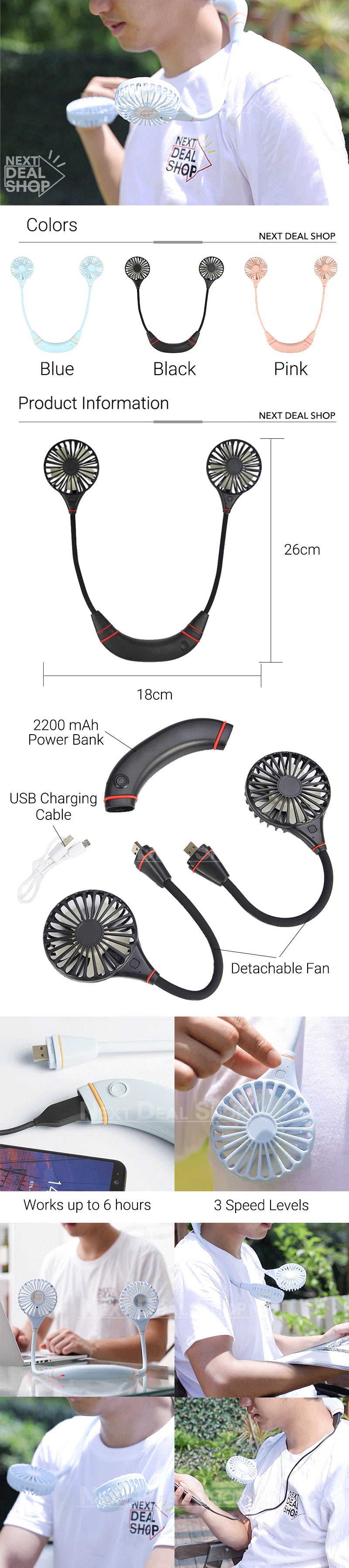 Beat the heat with this convenient Hands-Free Fan. There’s no need to manage your items while you operate the fan. Just wear it around your neck to keep your face cool and comfortable! This fan also features a power bank capability, allowing you to charge your phone while you are on the go. It's user-friendly and recharges via USB.