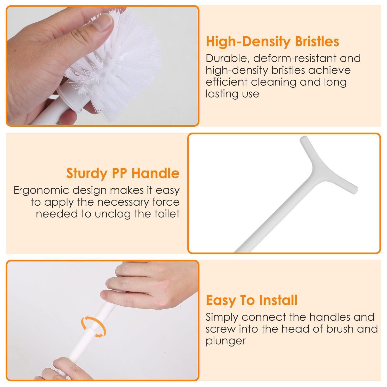 Our 2-in-1 toilet cleaning kit includes a toilet brush, a strong plunger, and a convenient holder, designed to ensure your bathroom is cleaned thoroughly and efficiently, resulting in a fresh and hygienic space for you and your loved ones. The durable plunger creates a secure seal around the drain, effectively eliminating any clogs that may slow down water flow, while the high-density bristle toilet brush easily navigates the most stubborn spots under the toilet rim, leaving the toilet bowl sparkling and free of debris. The holder is equipped with air ventilation holes, which facilitate quick drying and help stop water from pooling. This 2-in-1 toilet cleaning kit is a must-have tool and a dependable choice for any home.