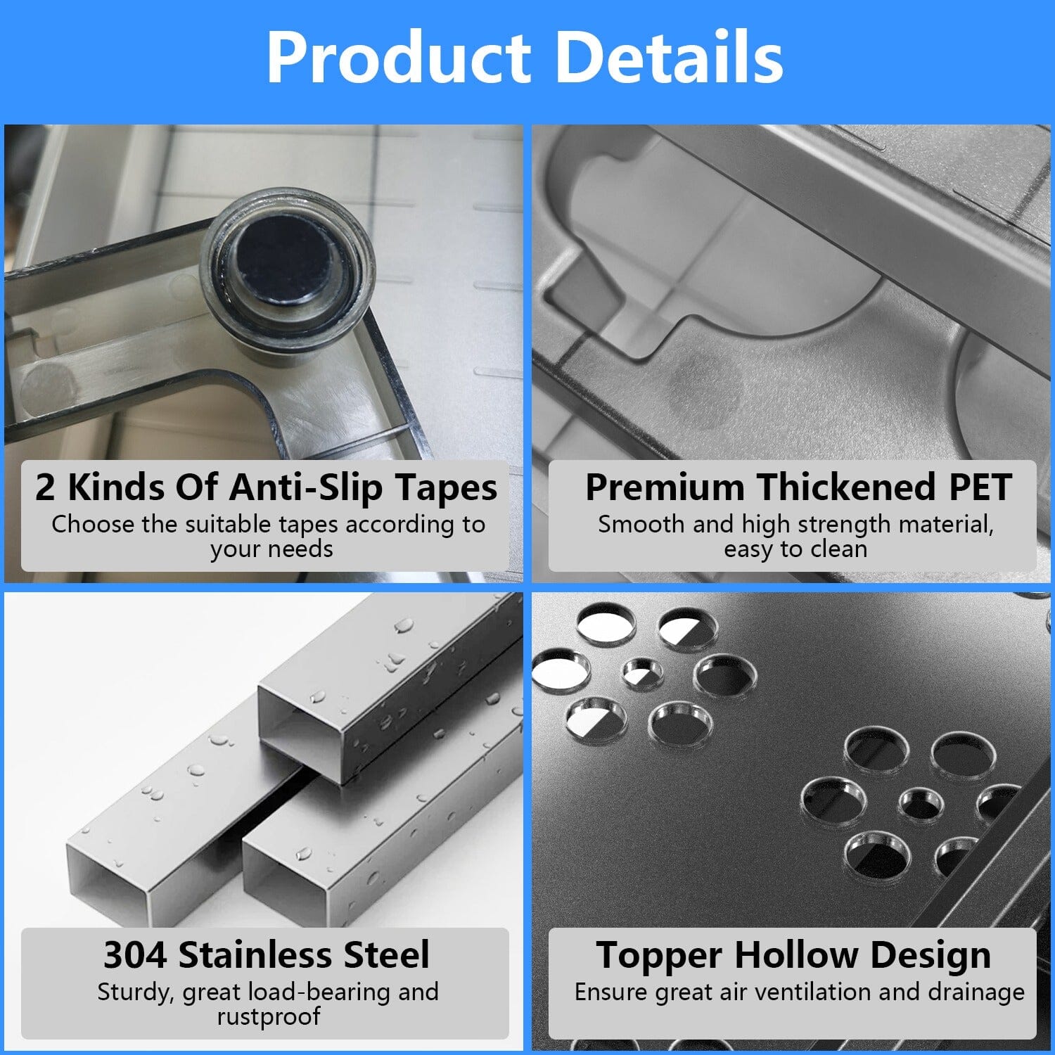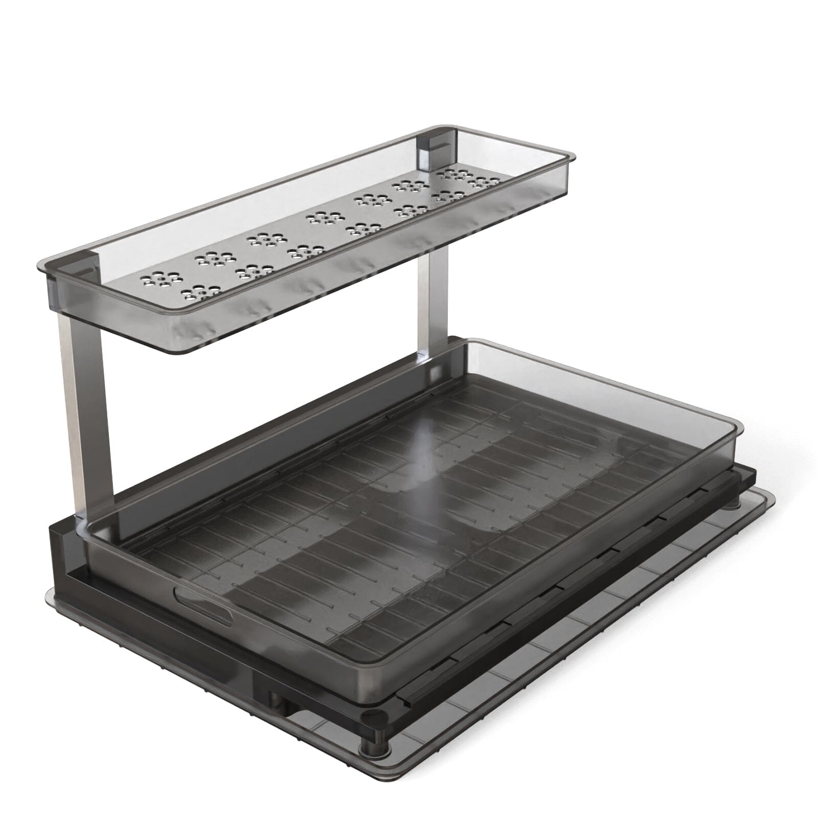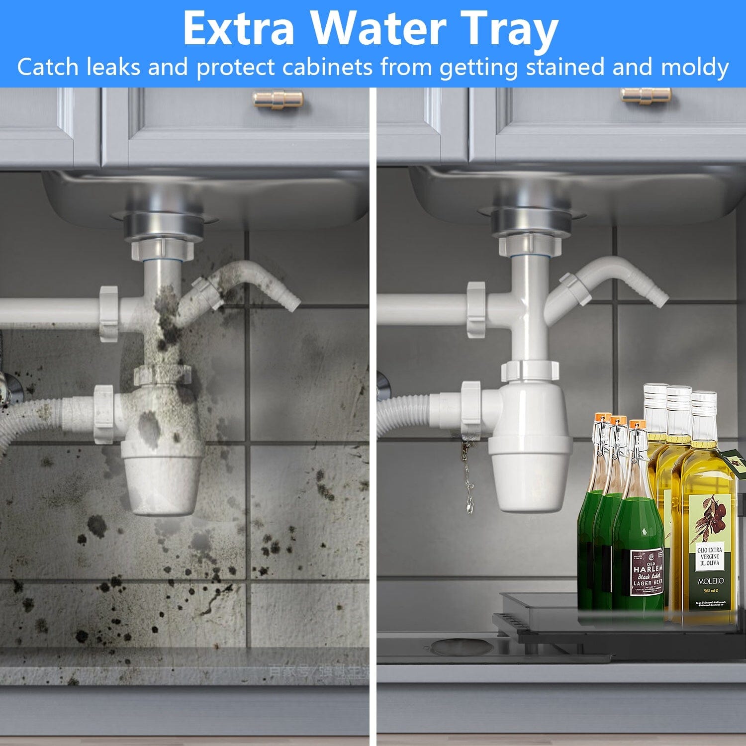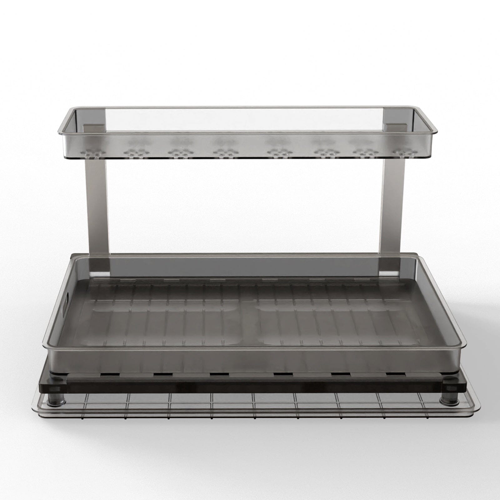 Our under-sink storage solution with dual tiers optimizes available space through its unique L-shaped design, efficiently using vertical storage while accommodating plumbing fixtures. It's ideal for organizing cleaning products in various settings, including bathrooms, kitchens, pantries, and offices. The upper fixed basket ensures easy access to smaller items, while the lower pull-out basket allows convenient retrieval of bulkier essentials from either side. Made from robust PET material and stainless steel pipes, it is built to last, resistant to rust, and has a considerable load-bearing capacity. Moreover, the top basket features a perforated design for excellent water drainage. Assembling it is straightforward and requires no tools; simply connect the top basket to the base using the stainless steel pipes and insert the drawer, and you'll be set up in just a few minutes.
