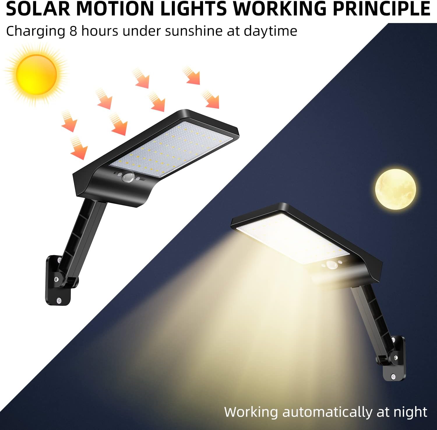 This solar floodlight allows for a 180° vertical tilt to adjust the motion sensor angle. It can be mounted directly on a wall, with an ideal installation height of 8-10 feet to ensure that the waterproof solar lights provide optimal illumination.