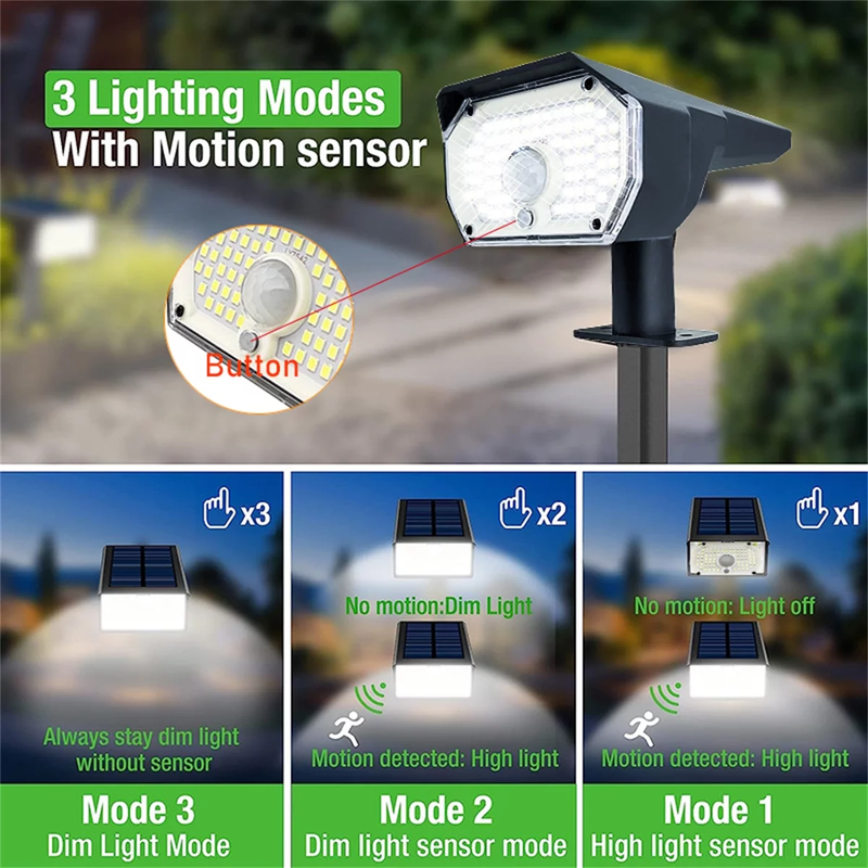 - Super bright & PIR Motion Sensor: Our upgraded solar spotlights for outdoor use feature 76 LEDs each, producing a powerful cold light up to 6500K in darkness, lighting up your garden and a larger area of your landscape. The integrated sensitive PIR motion sensor with a 120° detection angle guarantees secure, prompt, and effective lighting when people, pets, or vehicles pass nearby.