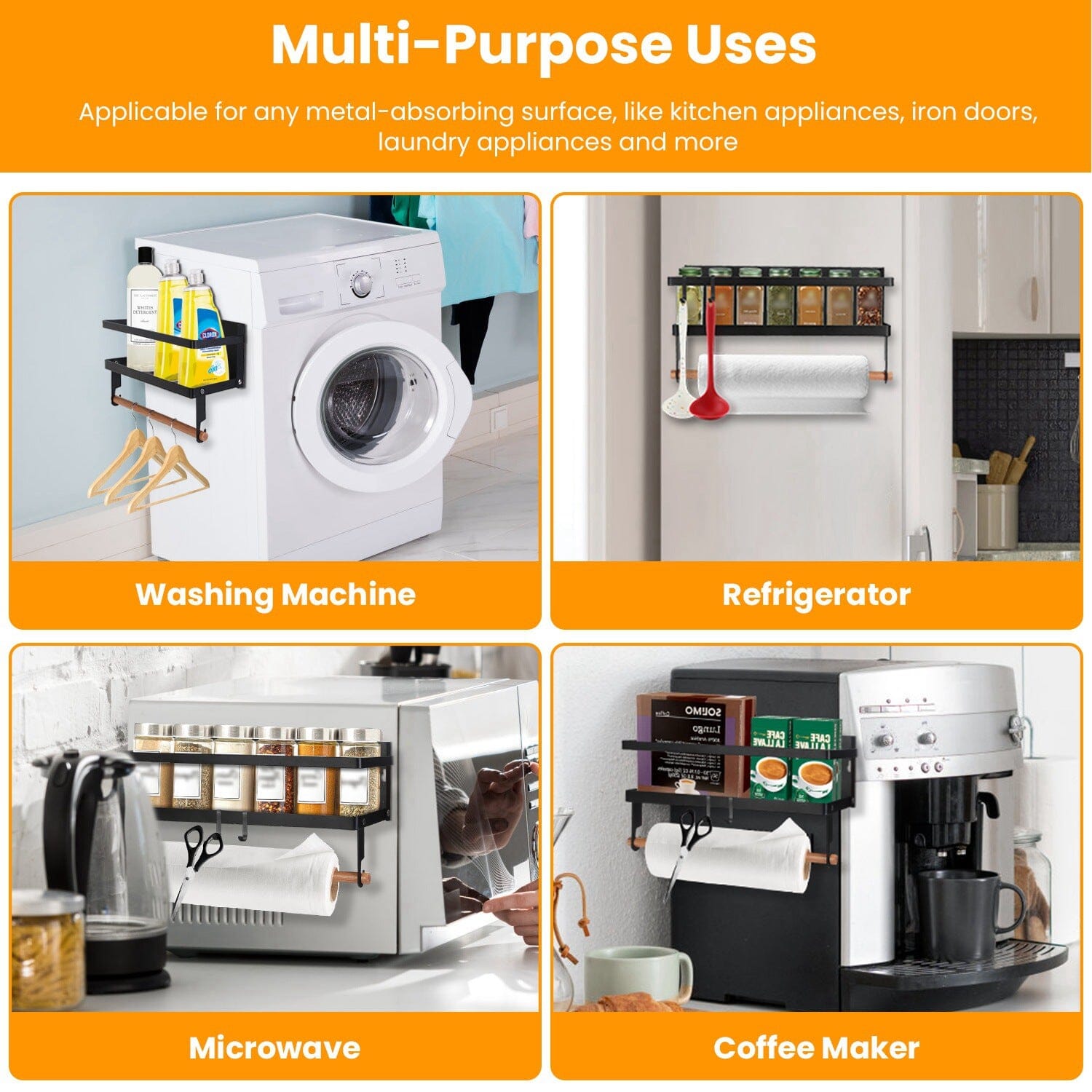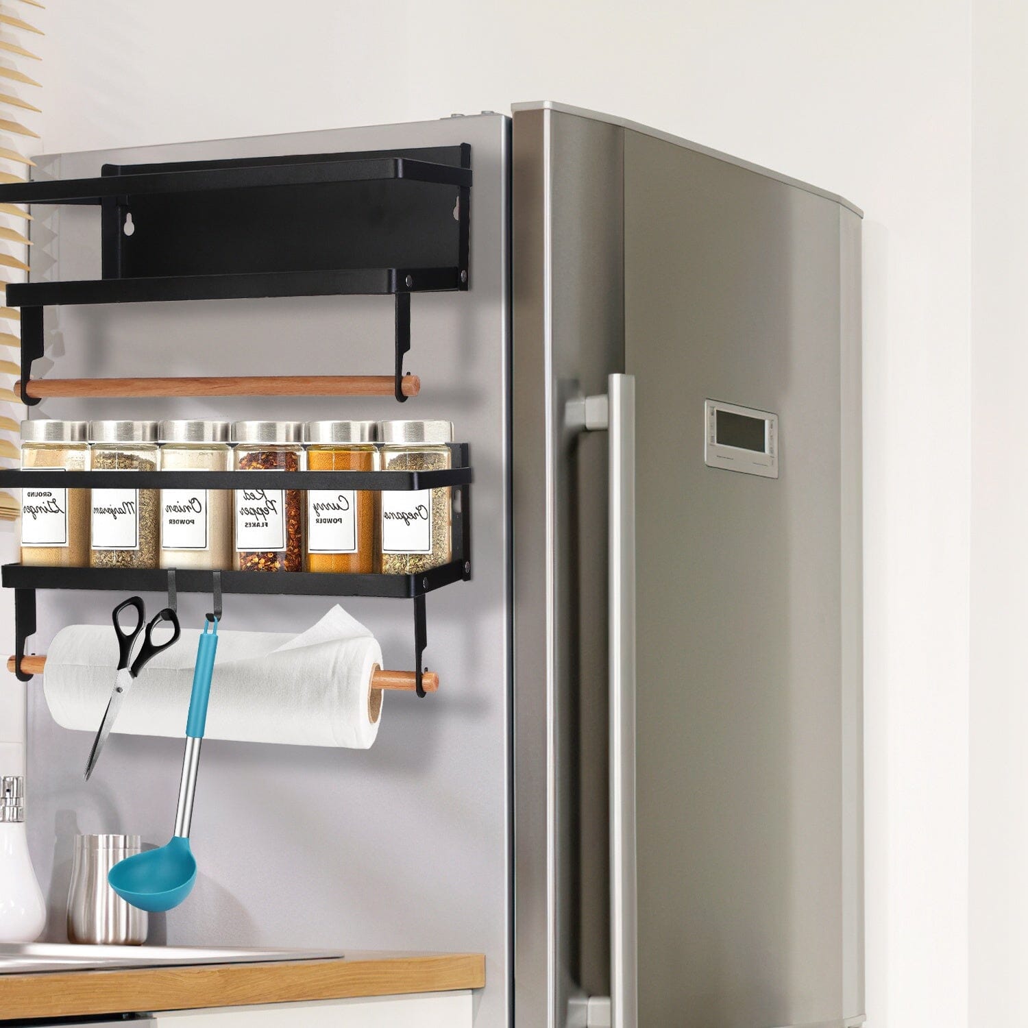 It's not unusual to find yourself short on kitchen counter space, especially in smaller apartments or cozy kitchens. Our dual-piece magnetic spice rack designed for the fridge offers a smart and efficient way to keep your spices neatly arranged. Plus, the hanging hooks and wooden rods provide a place for paper towels, cling film, scissors, and other essential tools. With a strong magnet at the back, it can securely hold a maximum weight of up to 5 kg, ensuring your glass containers stay safe and stable. Constructed from stainless carbon steel, this product promises durability and is easy to clean. It adheres flawlessly to any metal surface that attracts magnets, including refrigerators, washers, coffee machines, microwaves, and more.