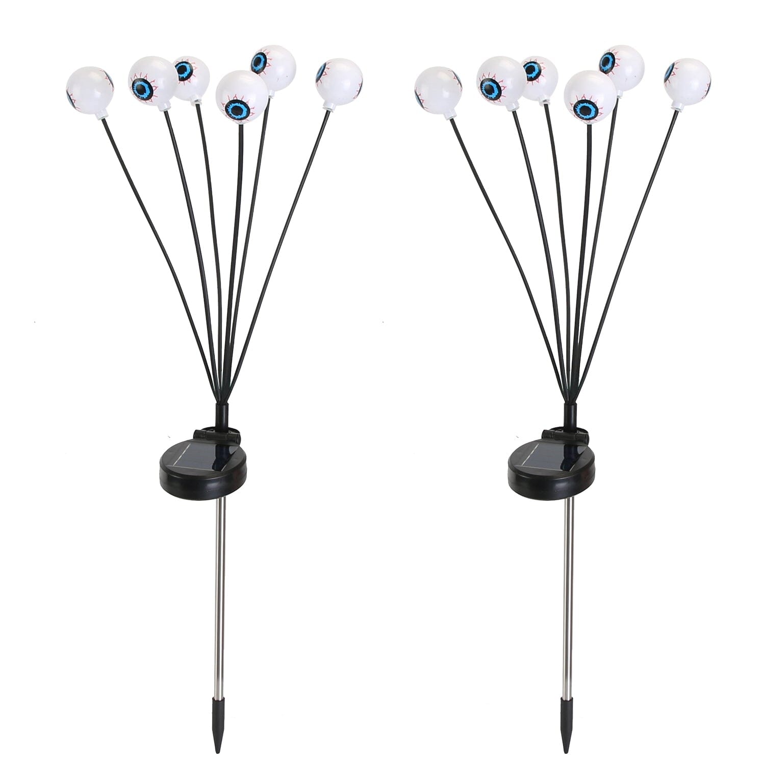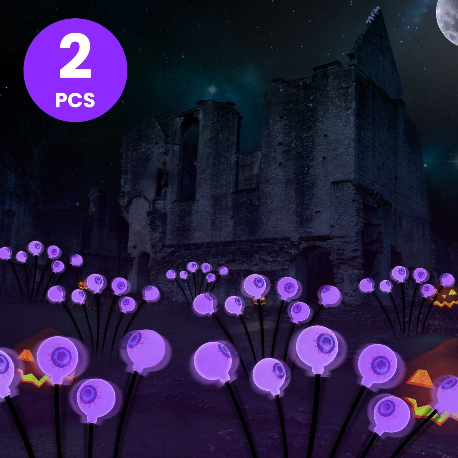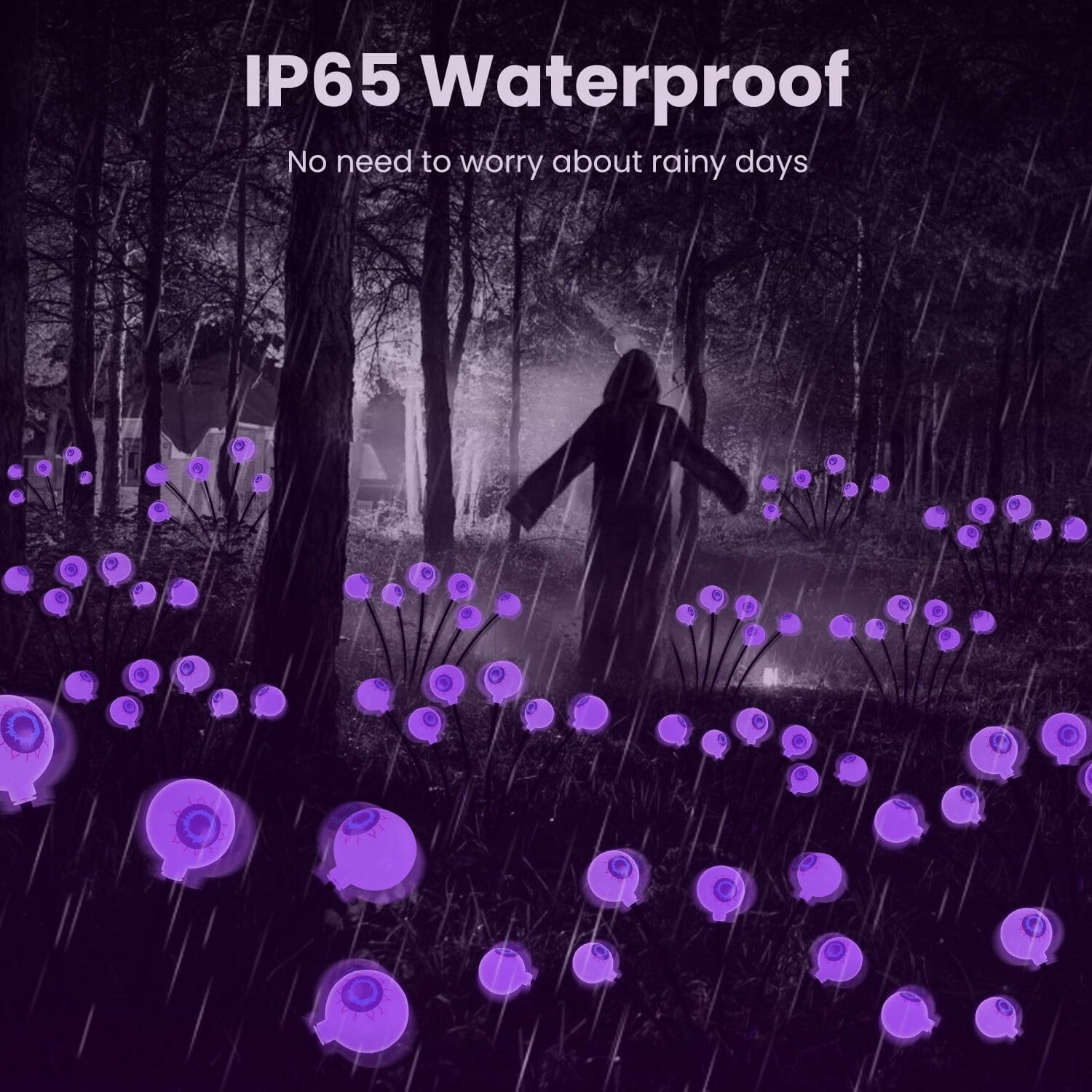 Our Halloween lights come in sets of two, featuring a total of 12 LED spooky eye lamps that appear to float. They are perfect for enhancing your Halloween festivities and giving a fright to neighbors and passersby! The 3D eye design combined with the levitating look adds a vivid touch that brings them to life. The bloodshot eyes work seamlessly with the haunting green and purple illumination, effortlessly setting an eerie mood! You can select between a steady light mode or a flashing mode depending on your preference. After being charged for approximately 6-8 hours during the day, they can shine for over 10 hours at night. With an IP65 waterproof rating, they are ideal for outdoor settings without concerns about rain. They're fantastic for placement in gardens, landscaping, patios, and at the front of your home, among other areas.