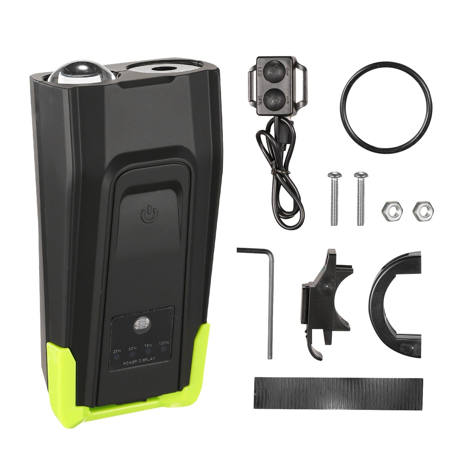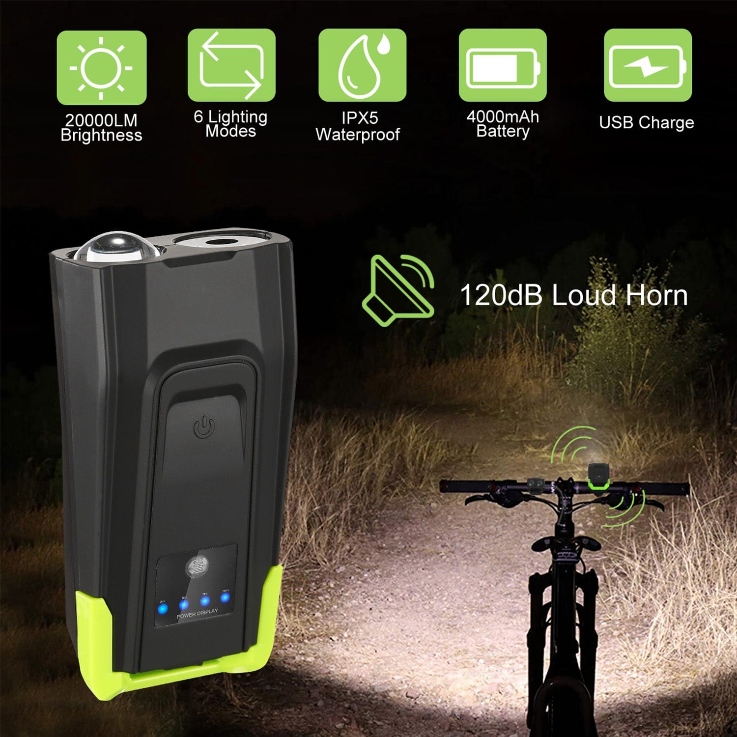Our IPX5 rated waterproof bike headlight is equipped with two high-performance LED chips—one dedicated to an exceptional floodlight lens and the other for a focused spotlight lens—producing an impressive brightness of 20,000 lumens. It offers 6 distinct lighting modes to meet different illumination needs and includes a powerful 120dB horn with 5 selectable sound options to alert cyclists and pedestrians effectively. The integrated 4000mAh lithium battery operates for approximately 8 hours on maximum brightness and 16 hours at a lower setting, fully recharging in just 3.5 hours. Furthermore, installation is a breeze, requiring no tools, and it can be easily released. It accommodates most handlebars with a diameter of 0.78 to 1.2 inches (20 mm-30 mm).