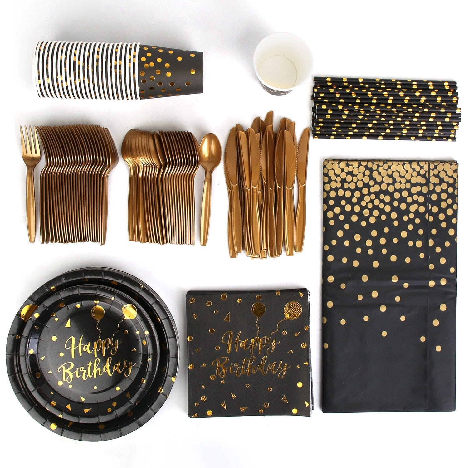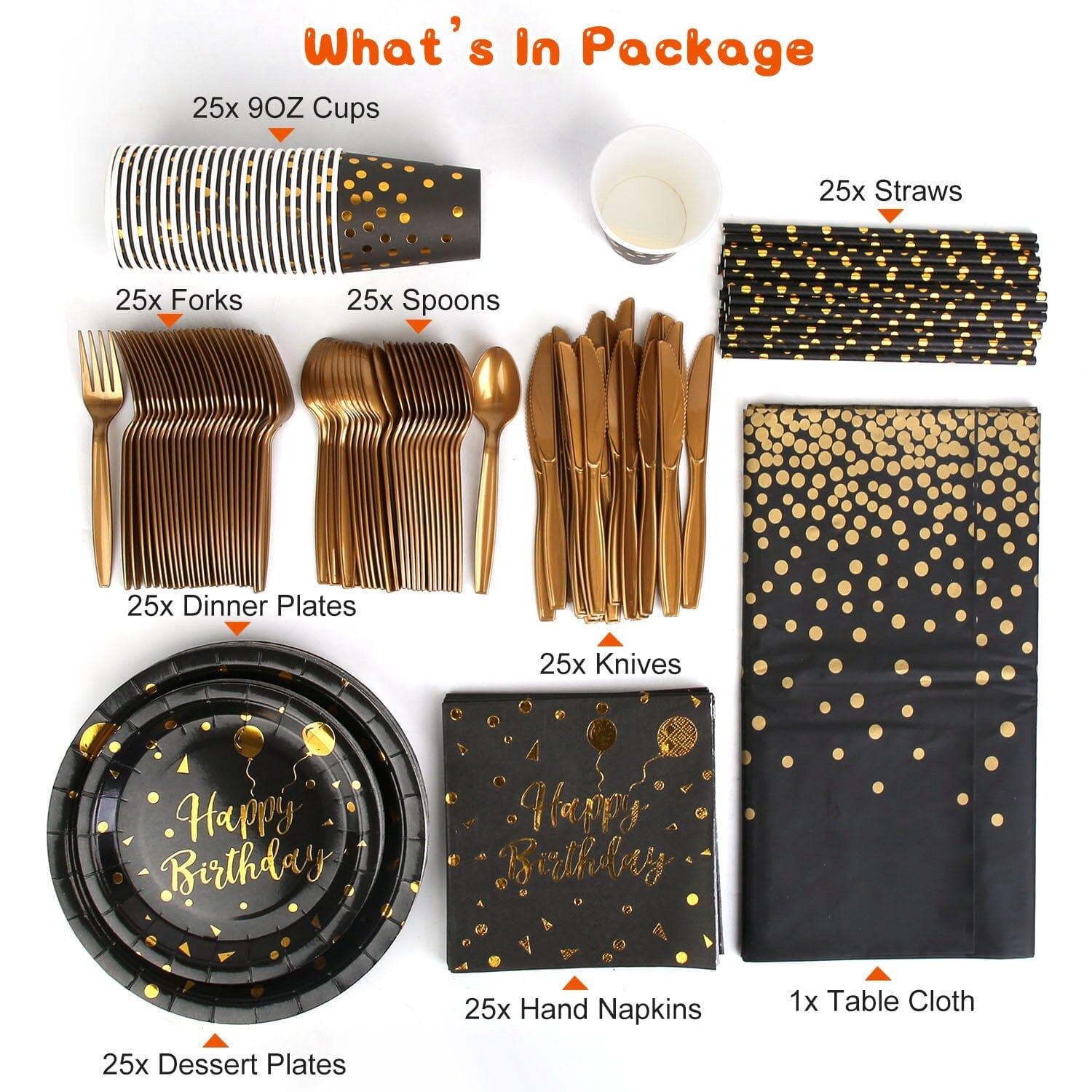 A remarkable birthday party requires elegant tableware that perfectly embodies the occasion. Our 201-piece birthday collection in elegant black and gold includes plates, forks, spoons, knives, napkins, cups, straws, and a tablecloth, designed to accommodate 25 guests seamlessly. The black plates feature stylish golden dots, triangles, balloons, and a delightful "Happy Birthday" message that enhances the celebratory vibe. These captivating and timeless designs foster a festive and refined atmosphere for your birthday gathering. Constructed from recycled paper and food-safe plastic, these disposable items ensure safety, and once the festivities conclude, you can effortlessly dispose of them to save time and avoid the hassle of cleaning. Opt for our sophisticated disposable birthday tableware and relish more joyful moments with your loved ones.