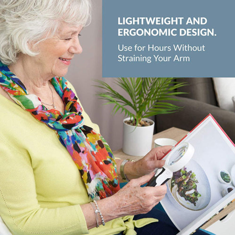 The 20X magnifying glass is ideal for reading magazines, books, and even product packaging! The integrated LED lights significantly improve your viewing capability.
