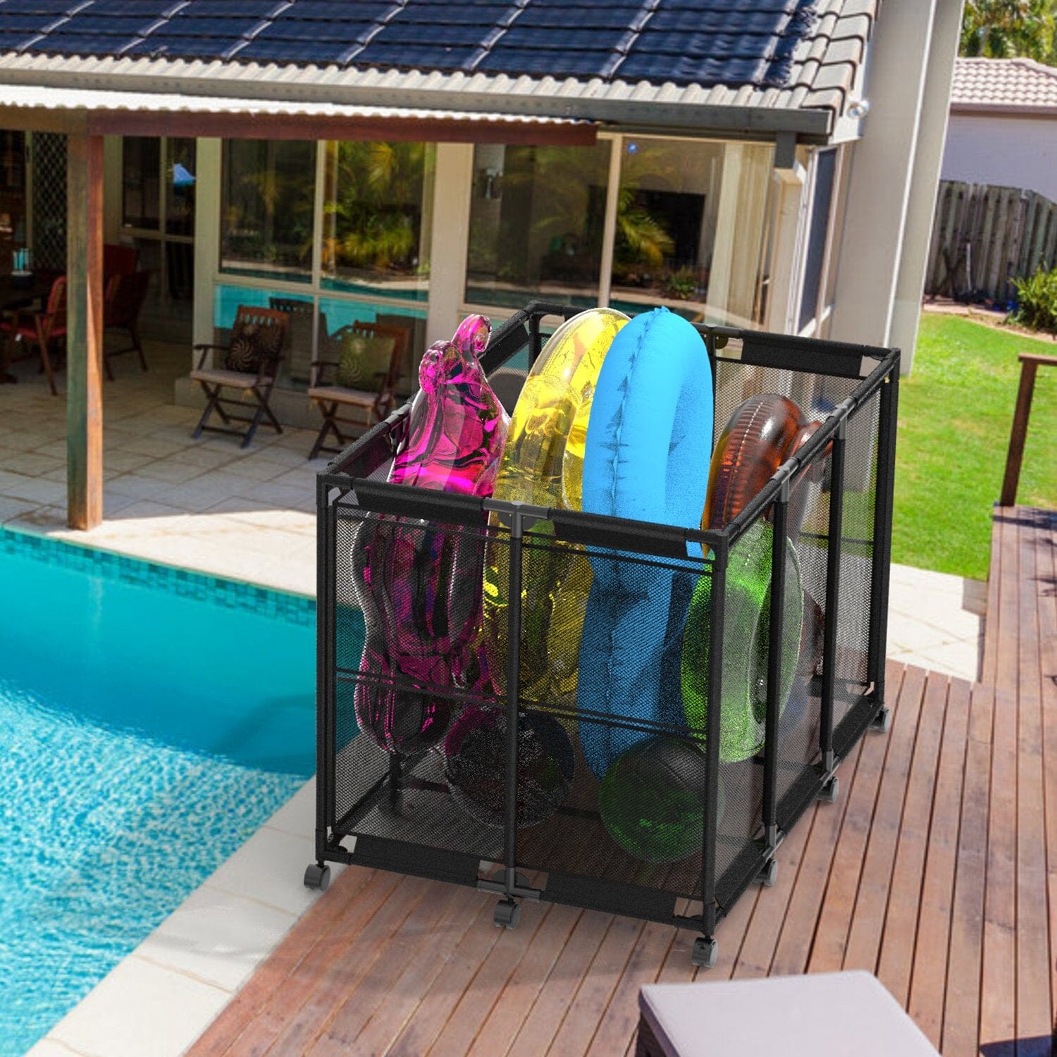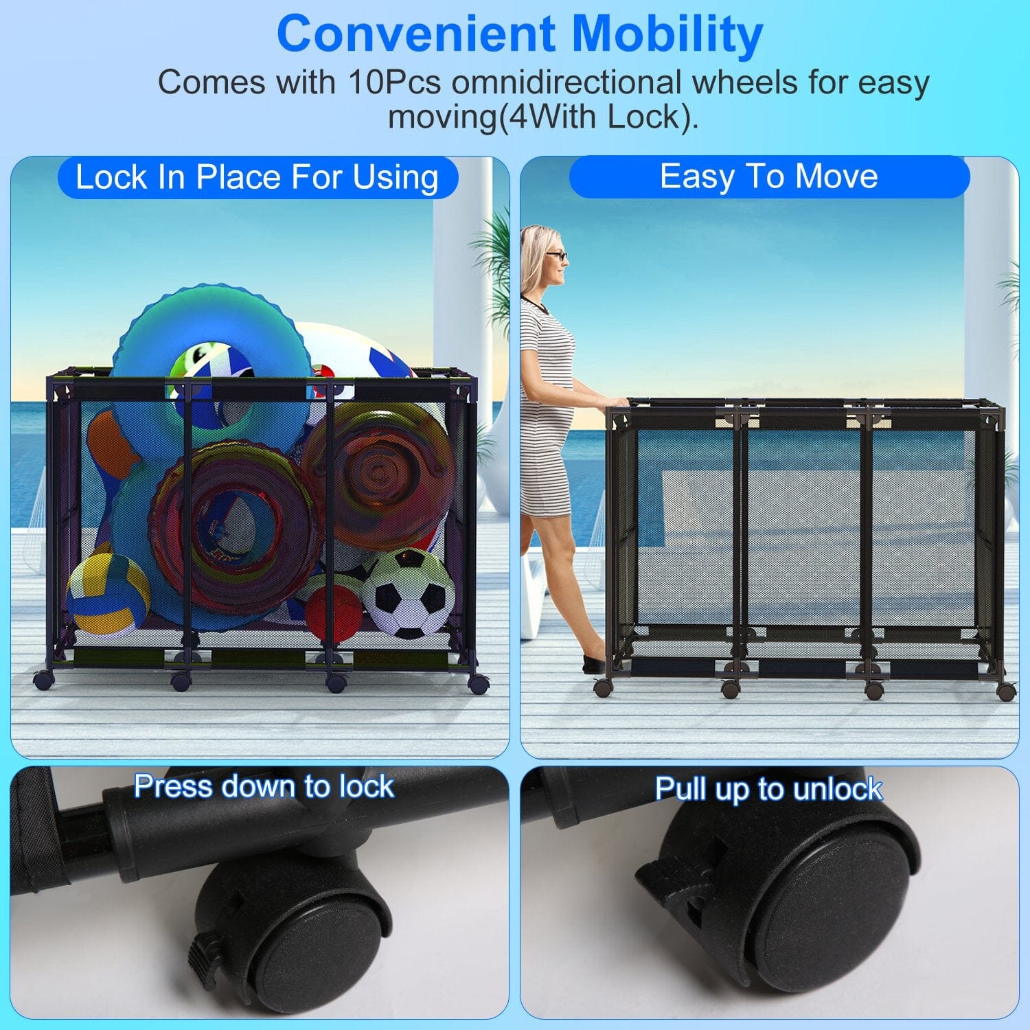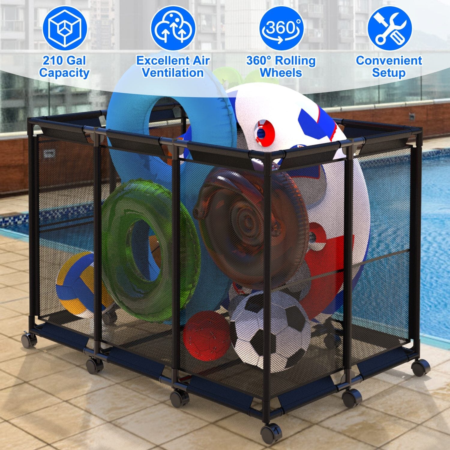Our roomy 210-gallon pool storage unit is a fantastic option for those wanting to organize their swimming equipment at home! Built with sturdy iron pipes and a mesh basket, it’s perfect for neatly storing water balloons, surfboards, swim rings, noodles, and floating loungers, while promoting rapid drying of your accessories and preventing the growth of mold and unpleasant smells due to its excellent ventilation. Furthermore, it includes 6 side pockets for smaller items. Transporting it is a breeze with its rolling wheels, and it can be securely positioned with 4 locking casters. Assembly is simple and does not require tools for quick setup. Perfect for family pools, public swimming facilities, water activity centers, and various other places needing organization.