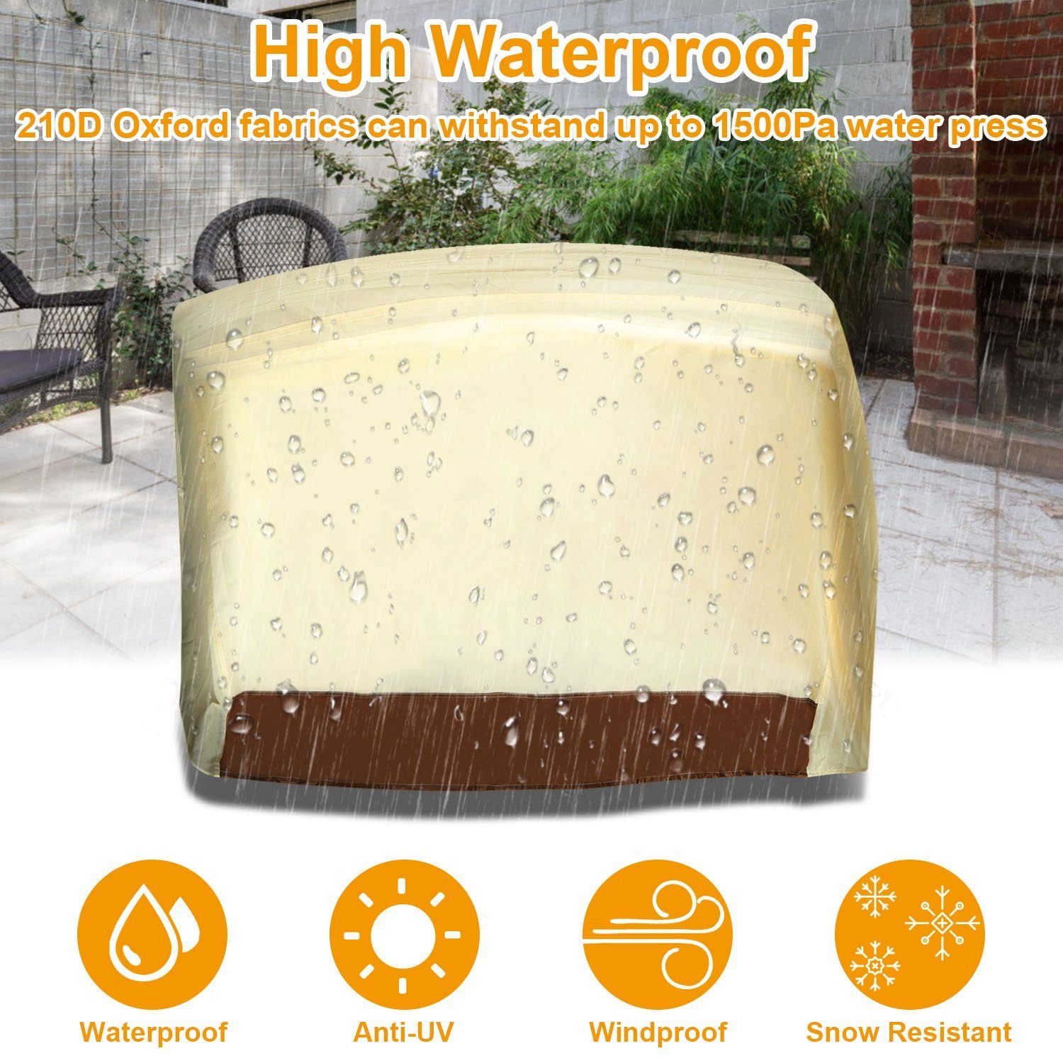 Our outdoor furniture cover is made from 210D Oxford fabric, lined with a PU coating and silver on the inside, effectively blocking 80% of harmful UV rays. It offers both breathability and waterproof capabilities, protecting our outdoor BBQ grill from fading and deterioration. Enhanced with advanced Nano materials and thorough stitching, this cover provides remarkable strength and longevity. It is widely utilized for the protection of outdoor furniture and BBQ grills in gardens.