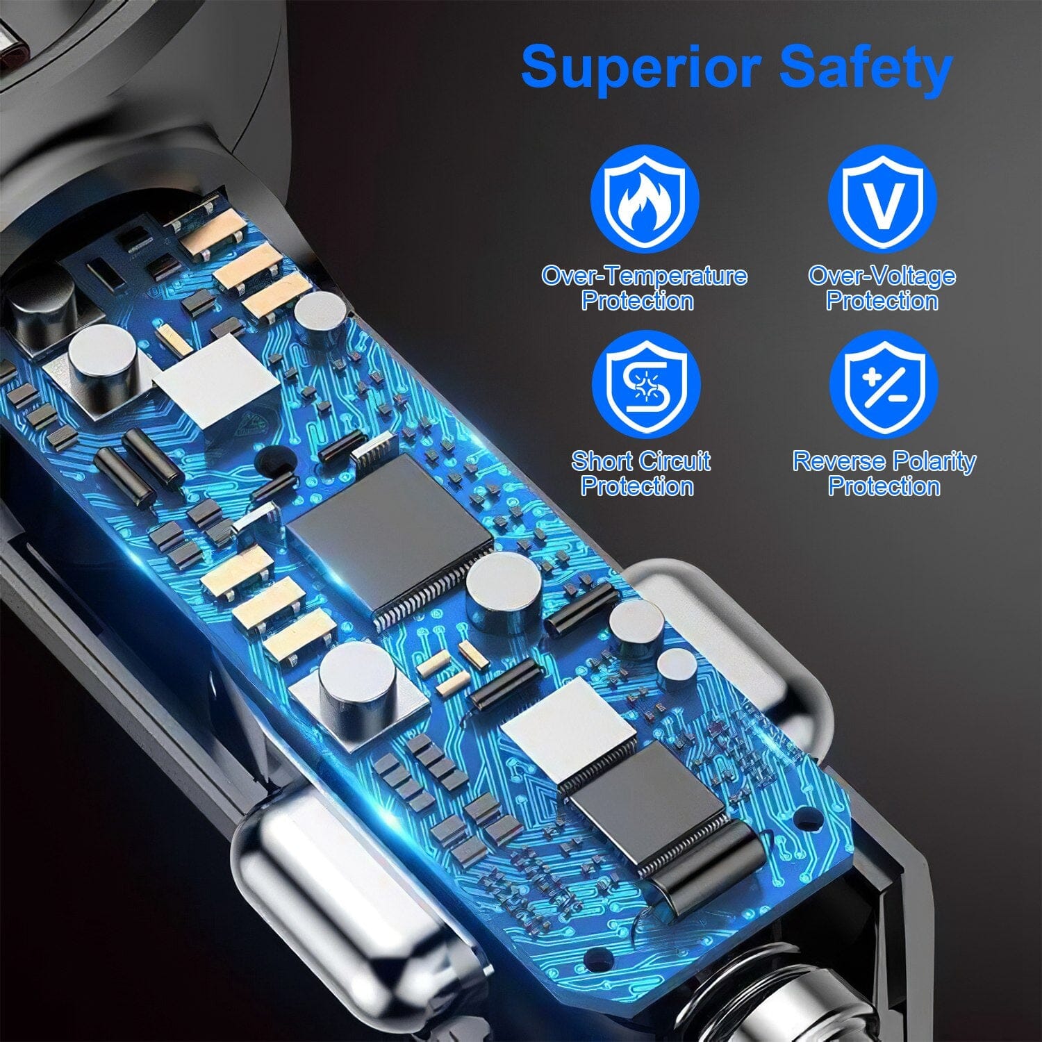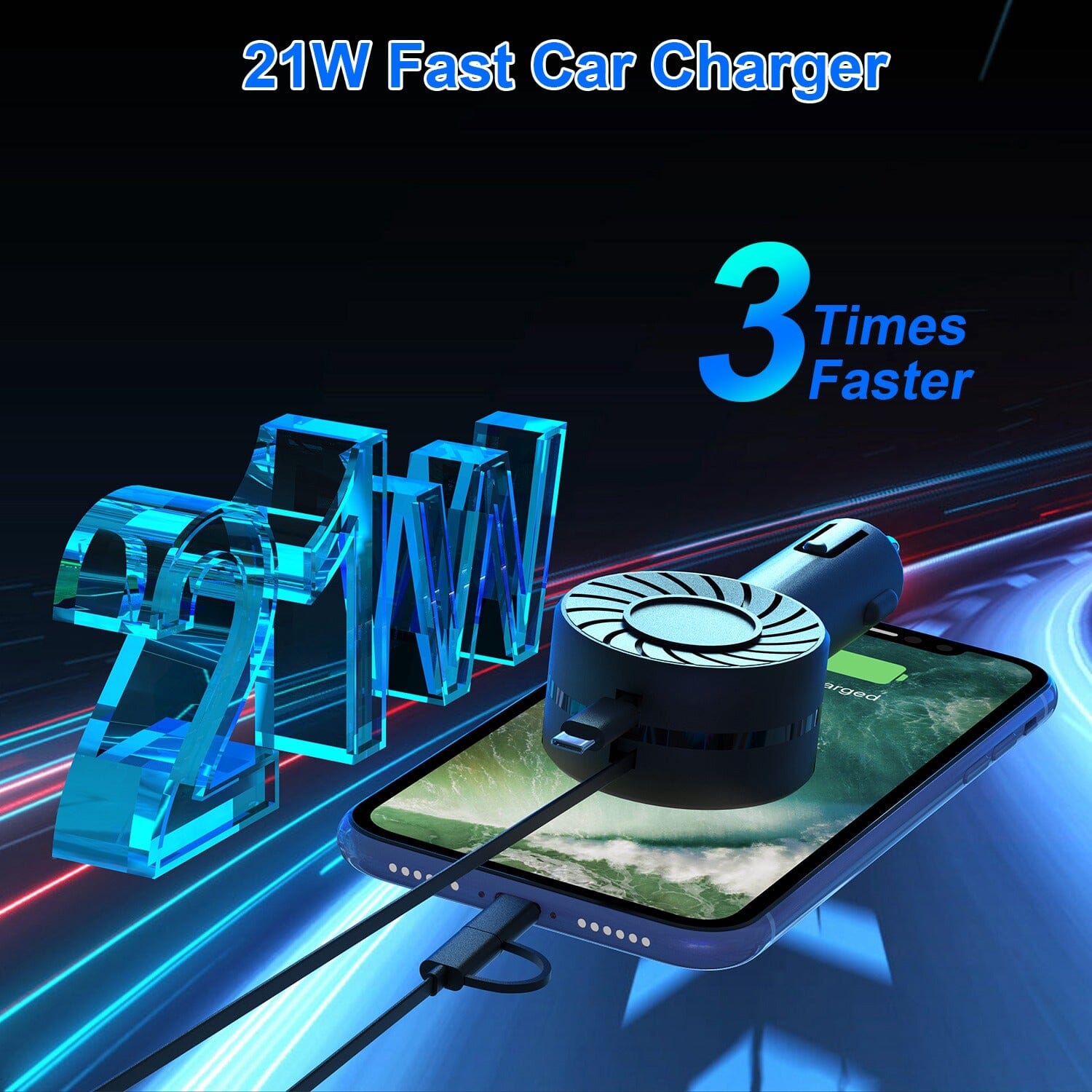 Our foldable car charger, equipped with 4 charging interfaces (Type-C, USB, LT, Micro), enables the simultaneous charging of up to 3 devices at a swift charging speed of 21W. This caters to your varied charging requirements and allows you to share with your passengers. It includes shock protection and is designed to fit most popular car brands. Our car phone charger is powered by an intelligent chip that offers protection against overheating, overloading, short-circuiting, and reverse polarity. With a 50% reduction in size, it’s easy to take along, making it ideal for those who are frequently on the road!