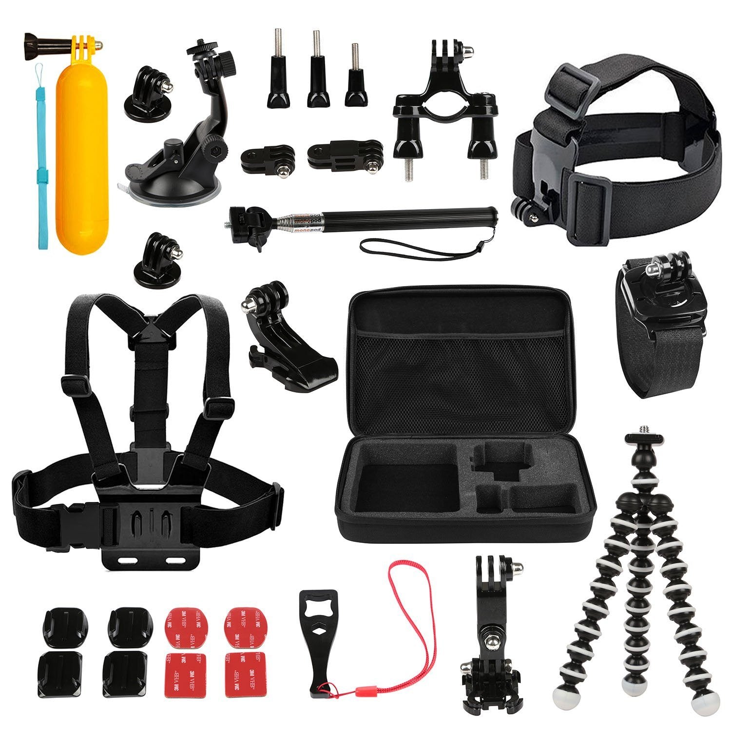 This mounting kit contains everything required to secure your camera for taking extraordinary photos, whether you're in a vehicle, cycling, enjoying the beach, or exploring the great outdoors. The kit encompasses all the necessary mounting accessories, including a monopod, tripod, handlebar mount, suction cup mount, chest strap, head strap, wrist strap, floating grip, and more, all crafted for user-friendliness and portability, complemented by the included carrying case.