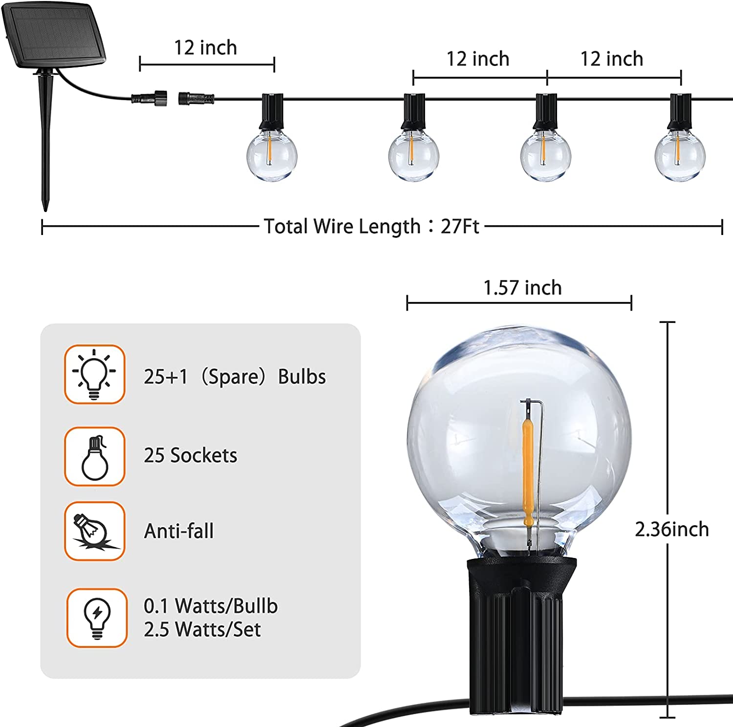 Skorter | 27Ft G40 Solar String Lights Outdoor Waterproof Globe Lights With 4 Lighting Modes Shockproof LED Bulbs
