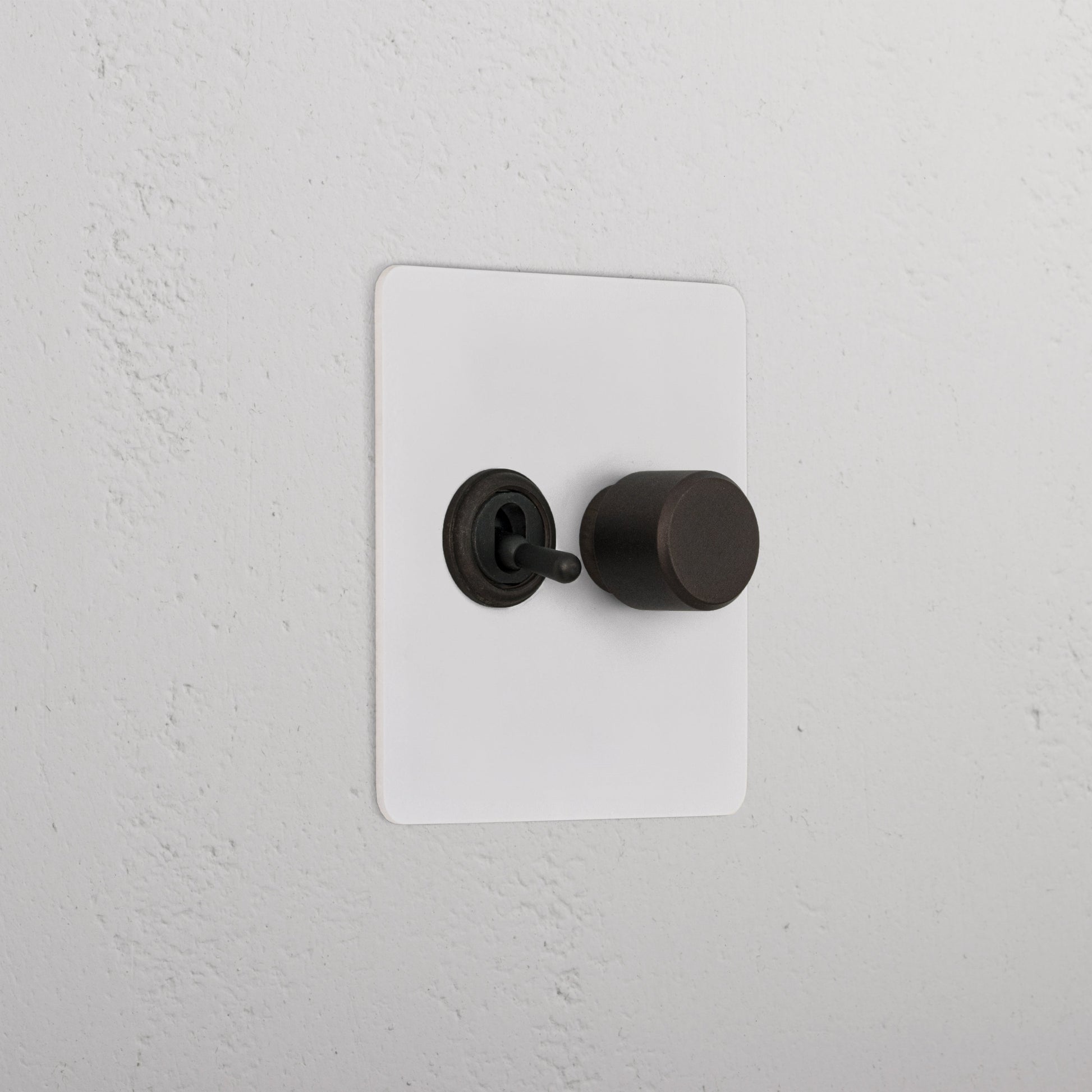 This innovative switch combines a traditional two-way toggle with a rotary dimmer on a single plate.