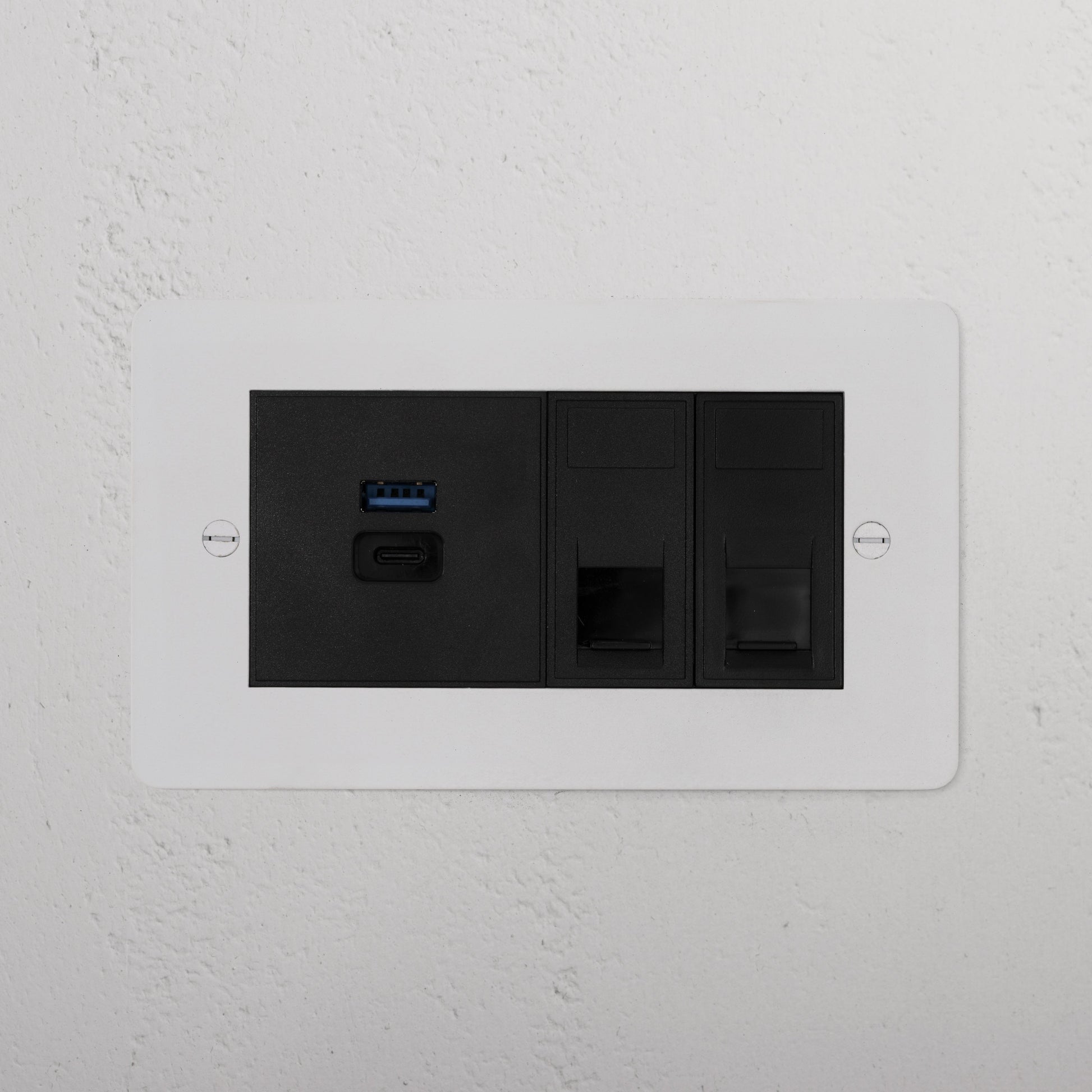 The surrounds of the connectors are made from low-gloss black plastic or white materials with a gently textured finish.