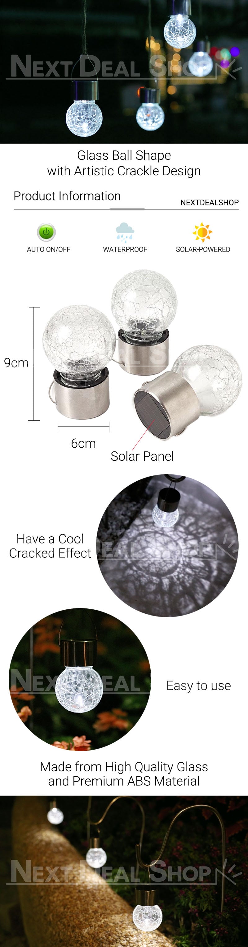 | Package Contents | 3 x Glass Sphere Solar Lights |