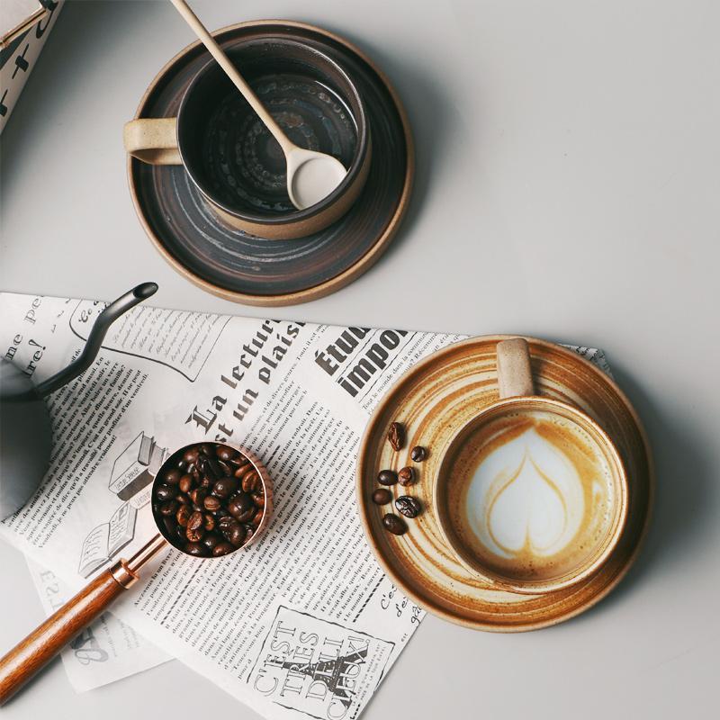 Chic and refined, this collection of mugs and plates embodies a charming and unique character. The robust plate is designed to resemble a placemat, while the inset pattern on the plate forms a wide edge that helps reduce spills. The intricate design of the plate features graceful curves, reminiscent of the movement of coffee swirling in the mug. This swirling theme is replicated in the decoration of the mug, creating a cohesive aesthetic. The outer surface of the mug is richer in color at the rim, further emulating the appearance of a café latte. Additionally, a spoon is conveniently included for coffee beans or grounds. An undeniably striking and distinctive piece.