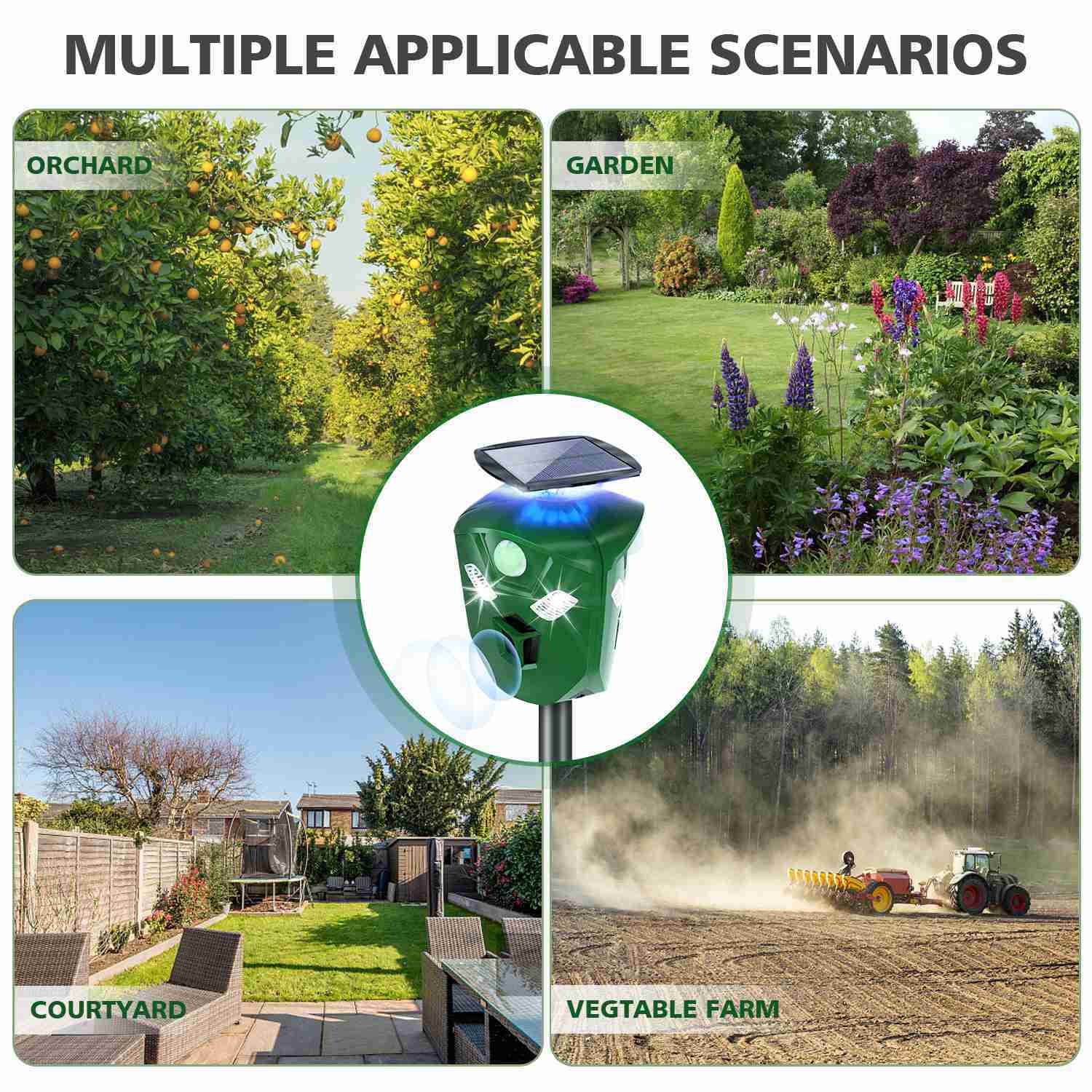 - Humane & Versatile: It operates without traps, poses no threat to people or pets, and contains no chemicals. You can effectively deter cats, dogs, deer, squirrels, raccoons, skunks, foxes, wild boar, and other creatures from your lawn and garden through ultrasonic sounds and flickering LED lights.