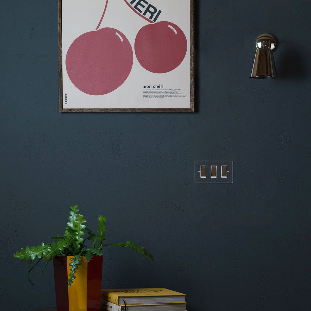 The transparent plate is made of thin polycarbonate. It includes a paper template that you can either trace or cut from wallpaper, allowing the switch to integrate smoothly with the wall.