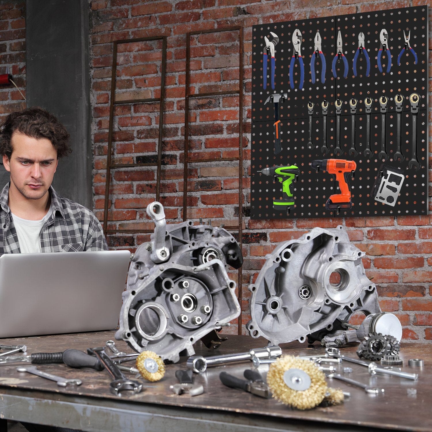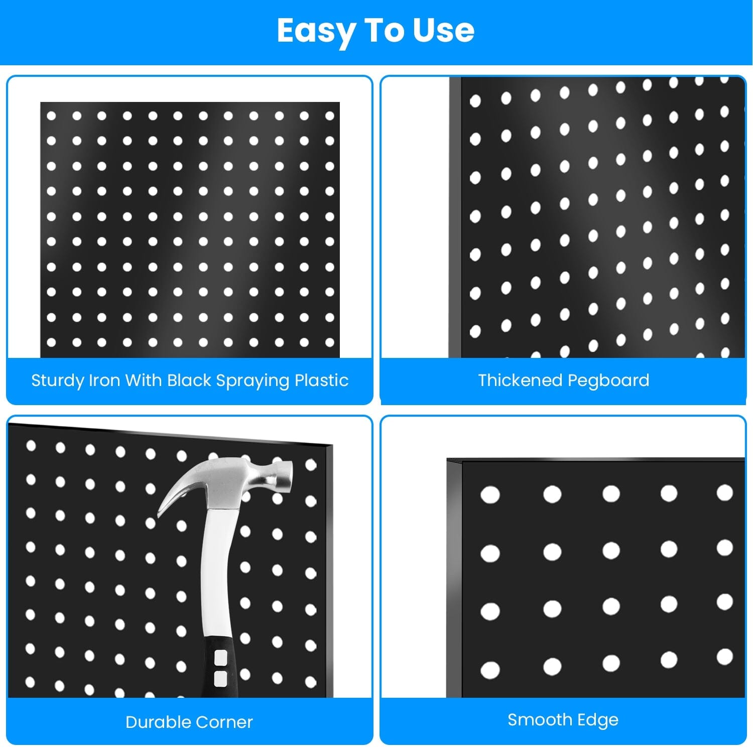 This pegboard panel, made from robust and heavy-duty iron, comes coated in a sleek black spray plastic, ensuring it can handle the weight of numerous items up to 30 kg. Featuring 2.5 cm hole spacing with a diameter of 6 mm, it is compatible with all standard 1/4 inch or 1/8 inch pegboard hooks and accessories. The collection includes 4 pegboards that can be merged to form a spacious 61x61 cm shelf or placed in separate areas to organize various items. It’s perfect for use in garages, basements, offices, workshops, or any setting that requires additional storage.