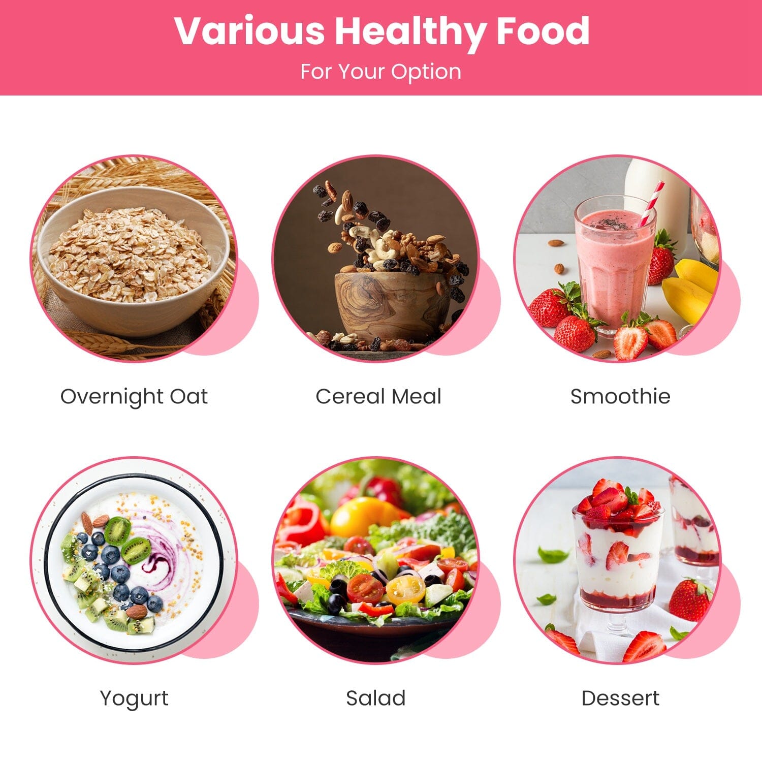 Each oats container is specifically constructed to accommodate around 600ML/20OZ of your homemade overnight oats. This 4Pack oats container collection, made from high-quality PC material, serves as an excellent choice for a nutritious and low-calorie breakfast for the entire family. The foldable spoon built into the lid allows for convenient eating on the move, eliminating the necessity of an extra utensil. Its secure closure is leak-proof, ensuring your meal stays fresh and flavorful while avoiding spills. It is suitable for overnight oats, yogurt, parfaits, simple salads, milk, smoothies, nuts, and beyond.