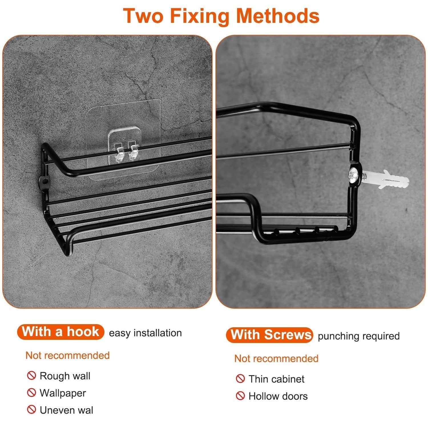 Our kitchen spice rack is designed to help you maintain an organized and tidy cooking environment. The innovative hollow space system provides easy access to your spices, thus saving you time and enhancing convenience. You have the option to select from two mounting techniques that are appropriate for different surfaces. For a straightforward and clean attachment, you can use the hooks. Alternatively, if you prefer a sturdier installation, screws are included as well. It's effortless to mount the shelves discreetly or to display them as a striking design element on your wall. Efficiently organize your kitchen essentials with the four functional, space-saving spice racks designed for wall installation.