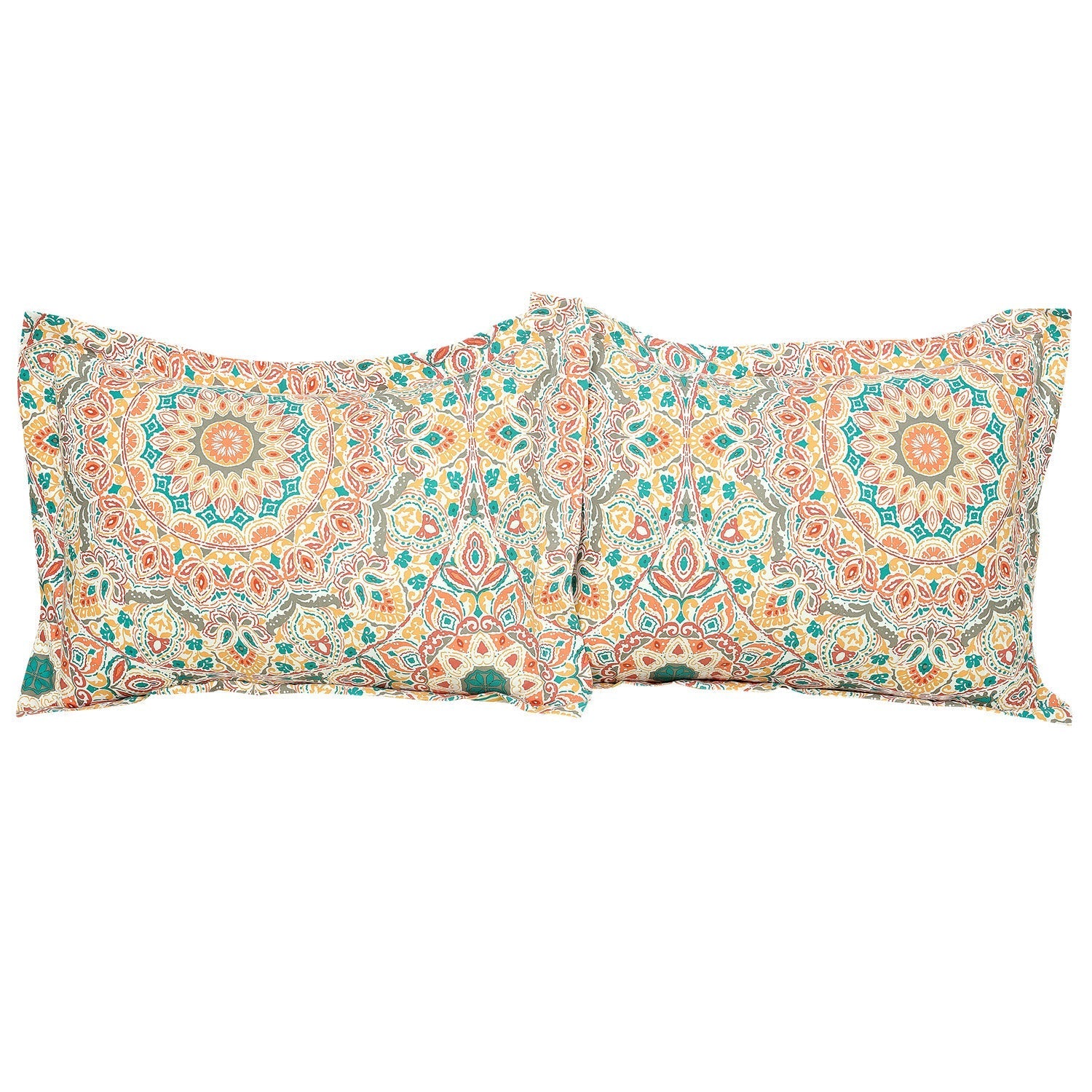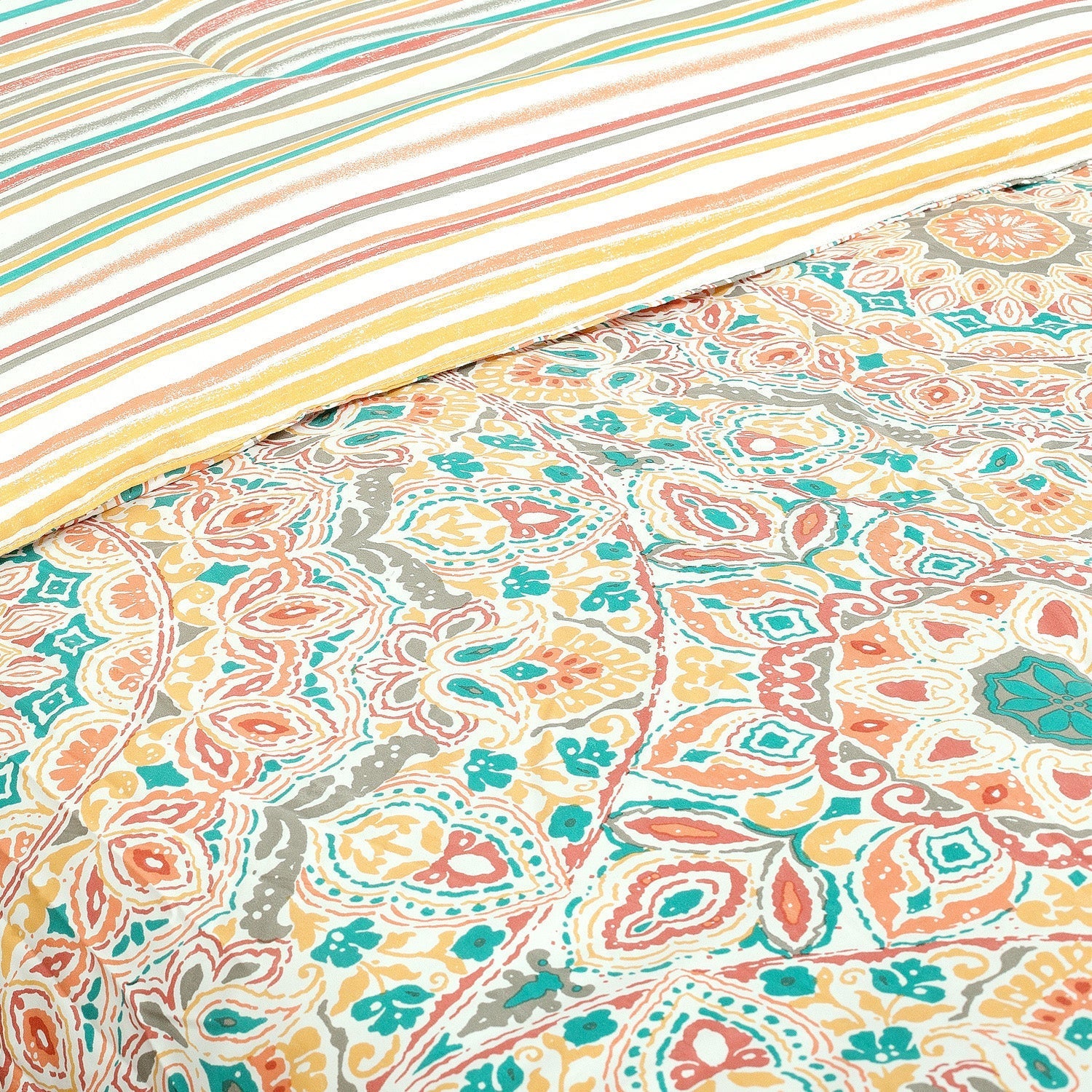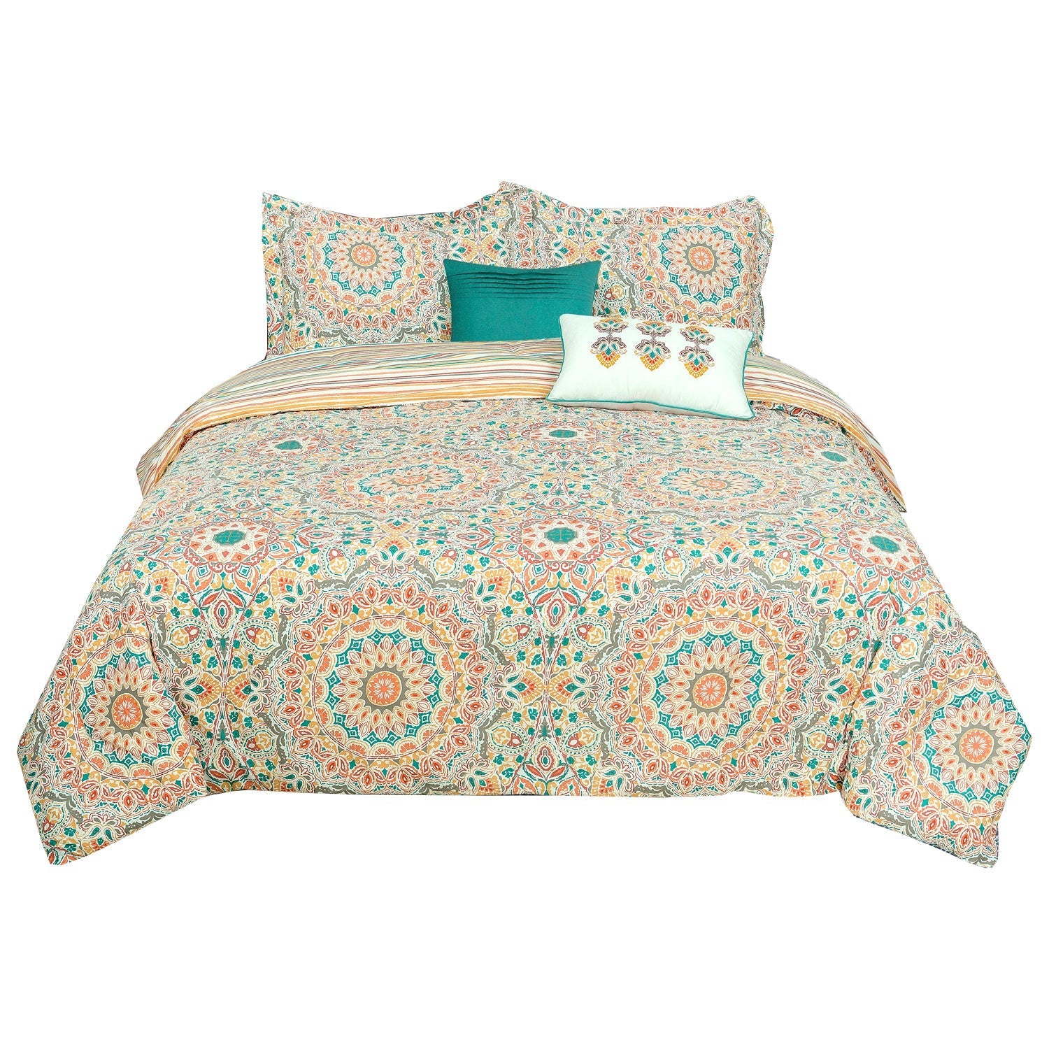 Revitalize any room with the Cozumel Medallion 5-Piece bedding collection, which embodies a worldly aesthetic. The duvet and pillowcases feature a lively medallion motif, enhanced by a matching horizontal stripe pattern. The 16” x 16” decorative cushion presents a solid aquamarine shade with pleated accents at both the top and bottom. Furthermore, the 12” x 16” decorative pillow is entirely white, bordered by an aquamarine piping and adorned with multi-hued embroidery on the front. This stylish mixture of colors and designs integrates seamlessly with almost any bedroom style. Each element is made from 100% polyester microfiber, providing comfort throughout the night, while the easy-care fabric makes laundering a breeze. The Cozumel Medallion 5-Piece bedding set is available in full/queen and king sizes and contains one comforter, two pillow shams, a square decorative pillow, and a rectangular decorative pillow. This set is ideal for anyone, catering to tweens, teens, and master bedrooms alike!