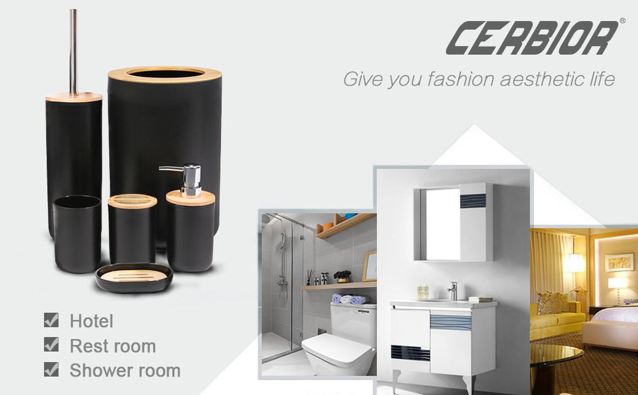 CERBIOR introduces an extensive array of bathroom accessories tailored for your home. From contemporary and minimalistic styles to timeless and chic designs, our offerings infuse a fresh and tidy ambiance into any bathroom. Description of the product: Elegant packaging. This collection features: 1 soap dispenser, 1 toothbrush holder, 1 tumbler, 1 soap dish, 1 toilet brush holder, 1 waste bin. 6-piece bathroom accessory collection. Constructed from premium-quality plastic, this bathroom set endures everyday use and retains its stylish look for years. Streamline the arrangement and enhancement of your bathroom with the CERBIOR accessory set, turning it from mundane to delightful!
