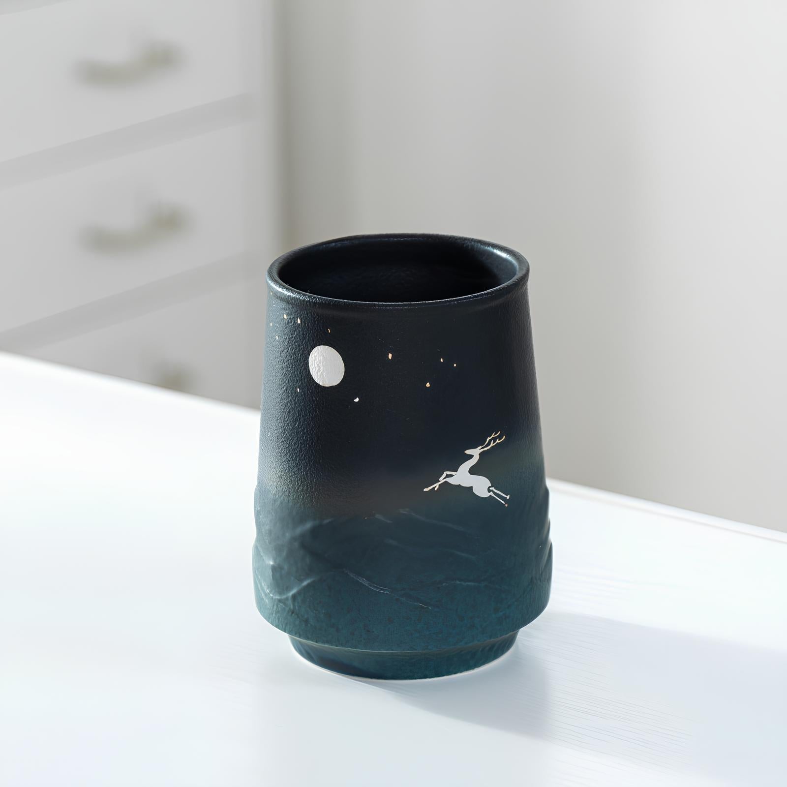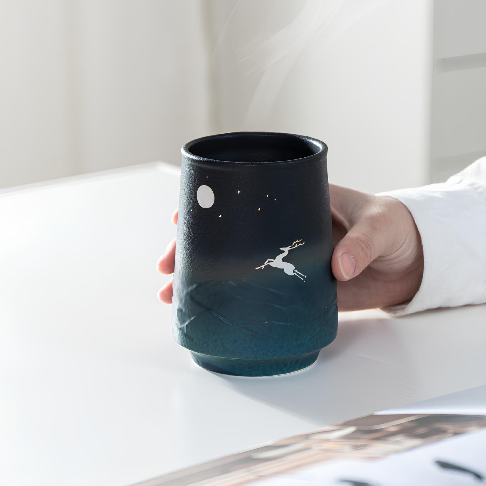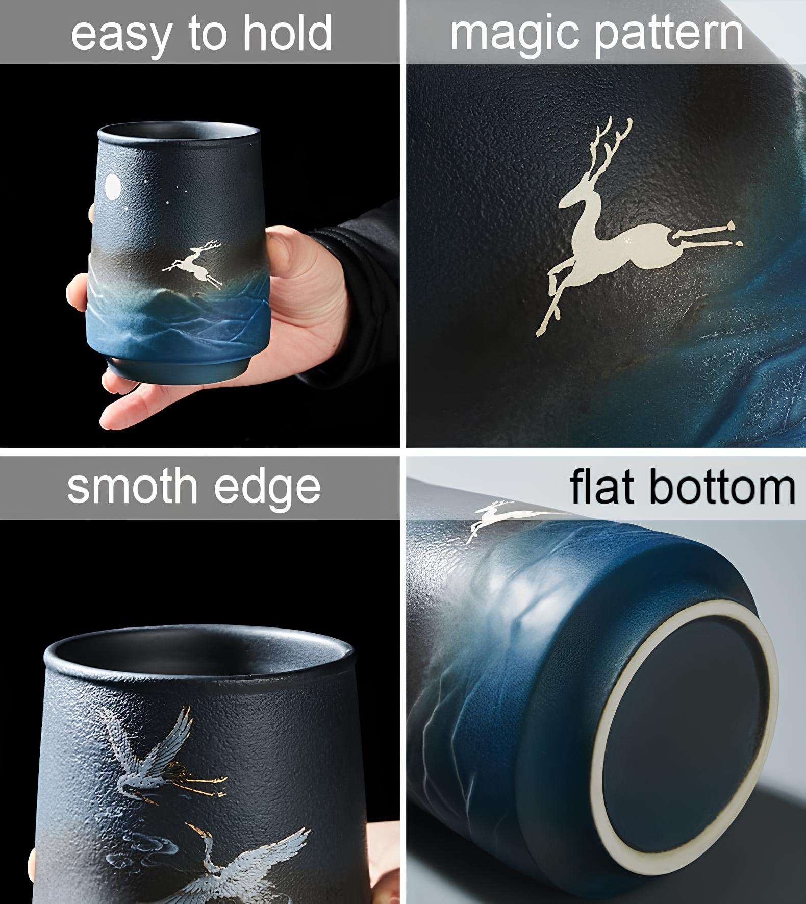 Discover the distinctive allure of our black ceramic mugs with blue gradient. Each Skorter is a masterpiece on its own. The first features a design of a dragonfly in the dark night sky, evoking a sense of freedom and escape.