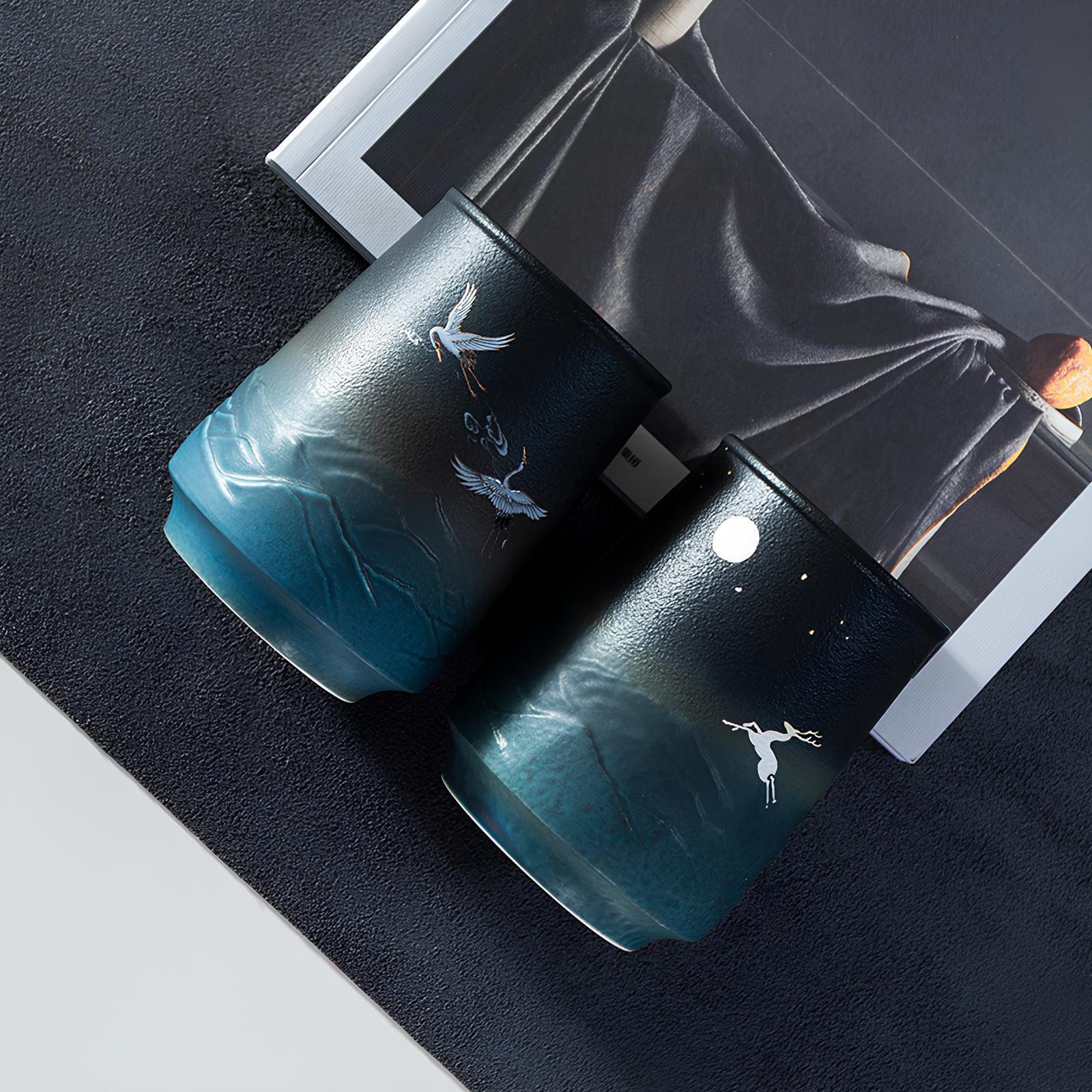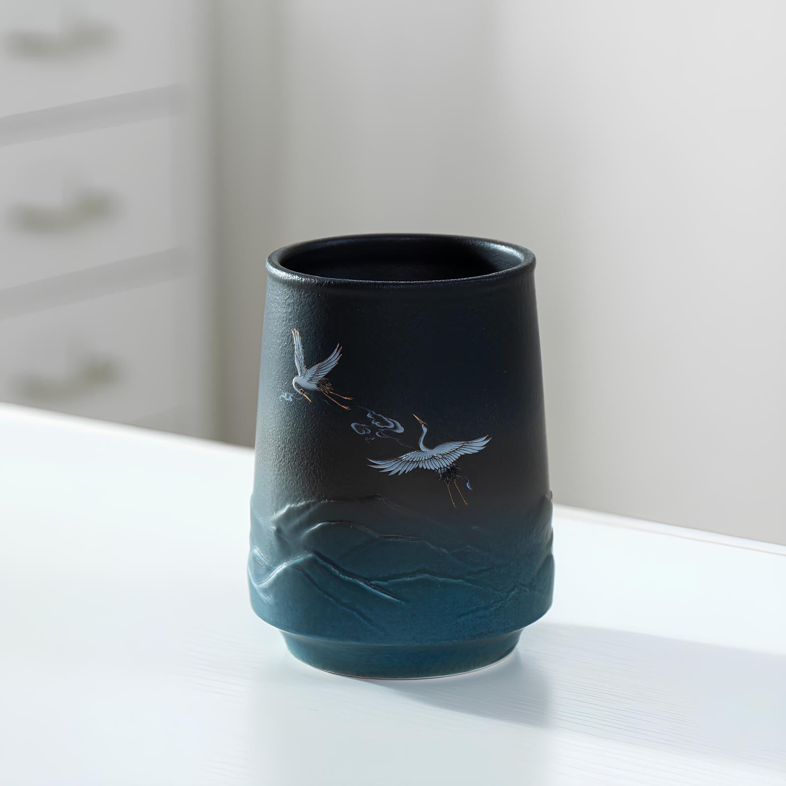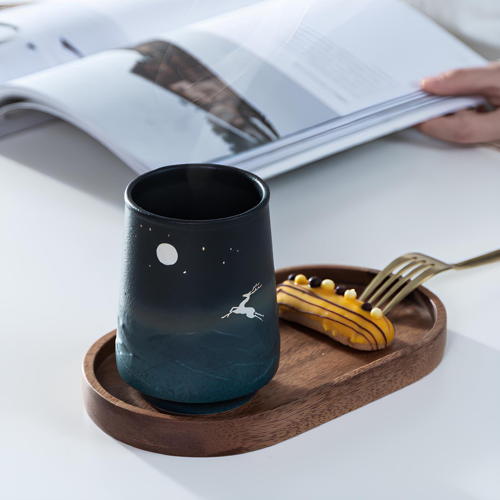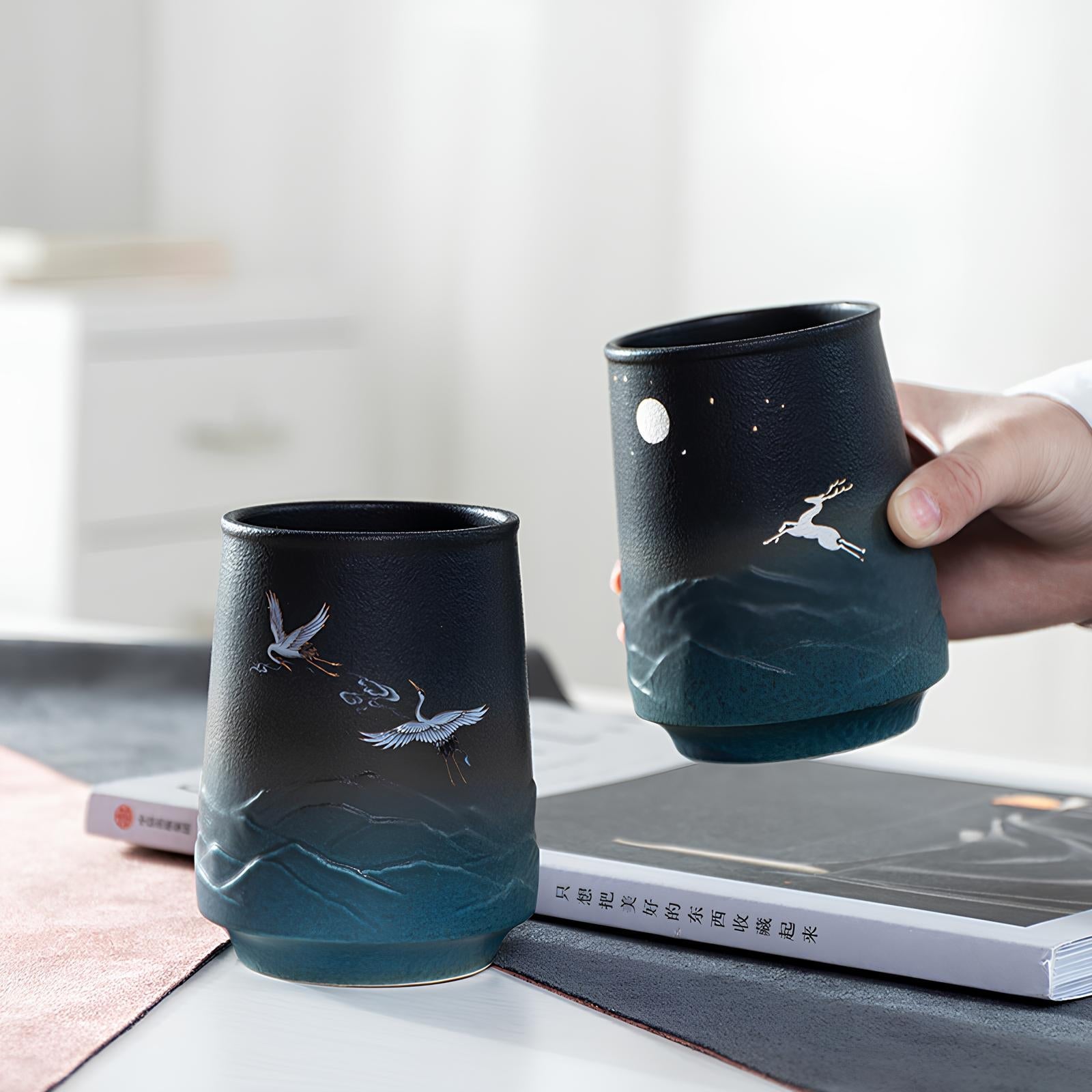 Discover the distinctive allure of our black ceramic mugs with blue gradient. Each Skorter is a masterpiece on its own. The first features a design of a dragonfly in the dark night sky, evoking a sense of freedom and escape.