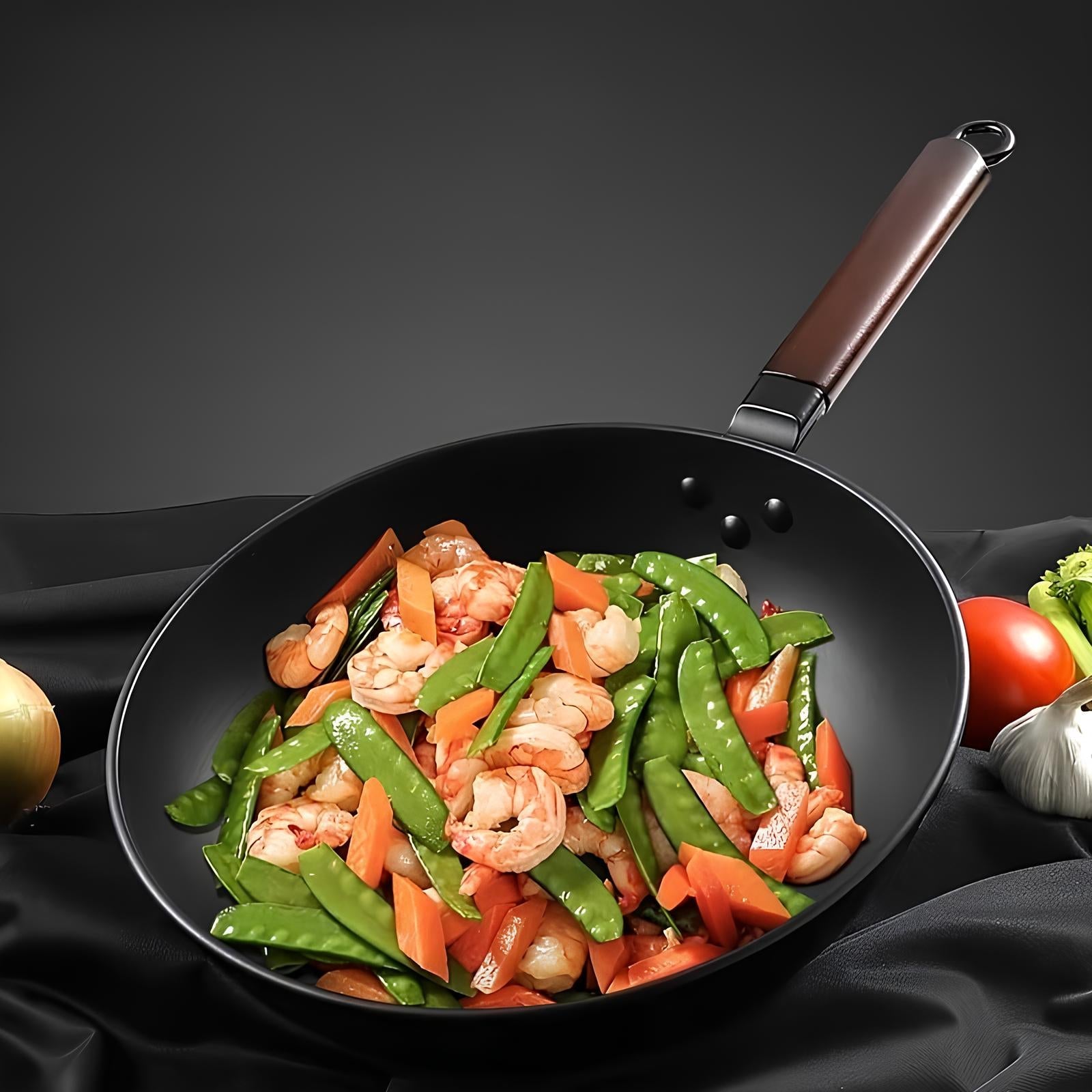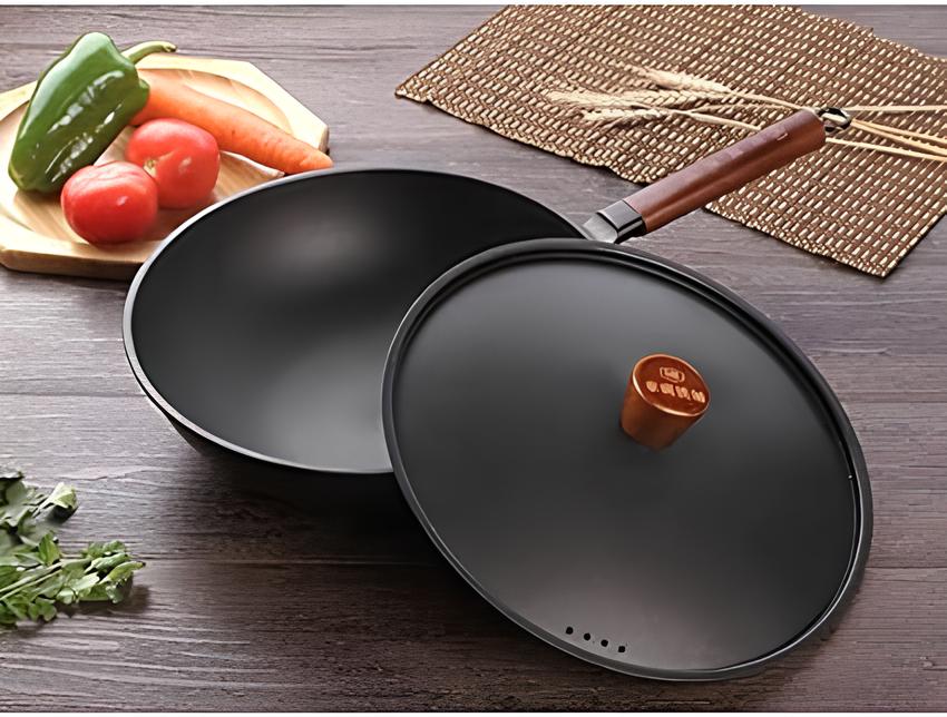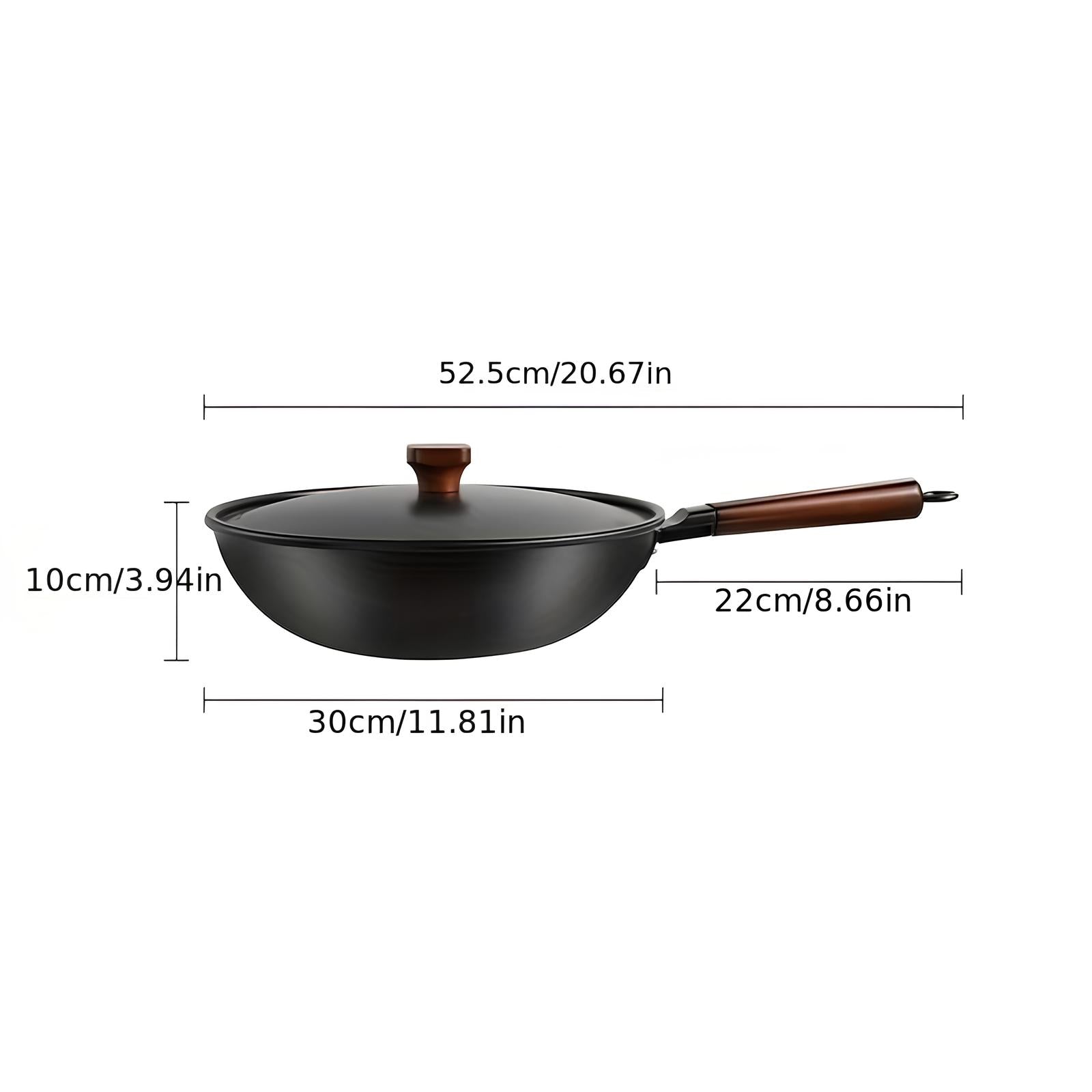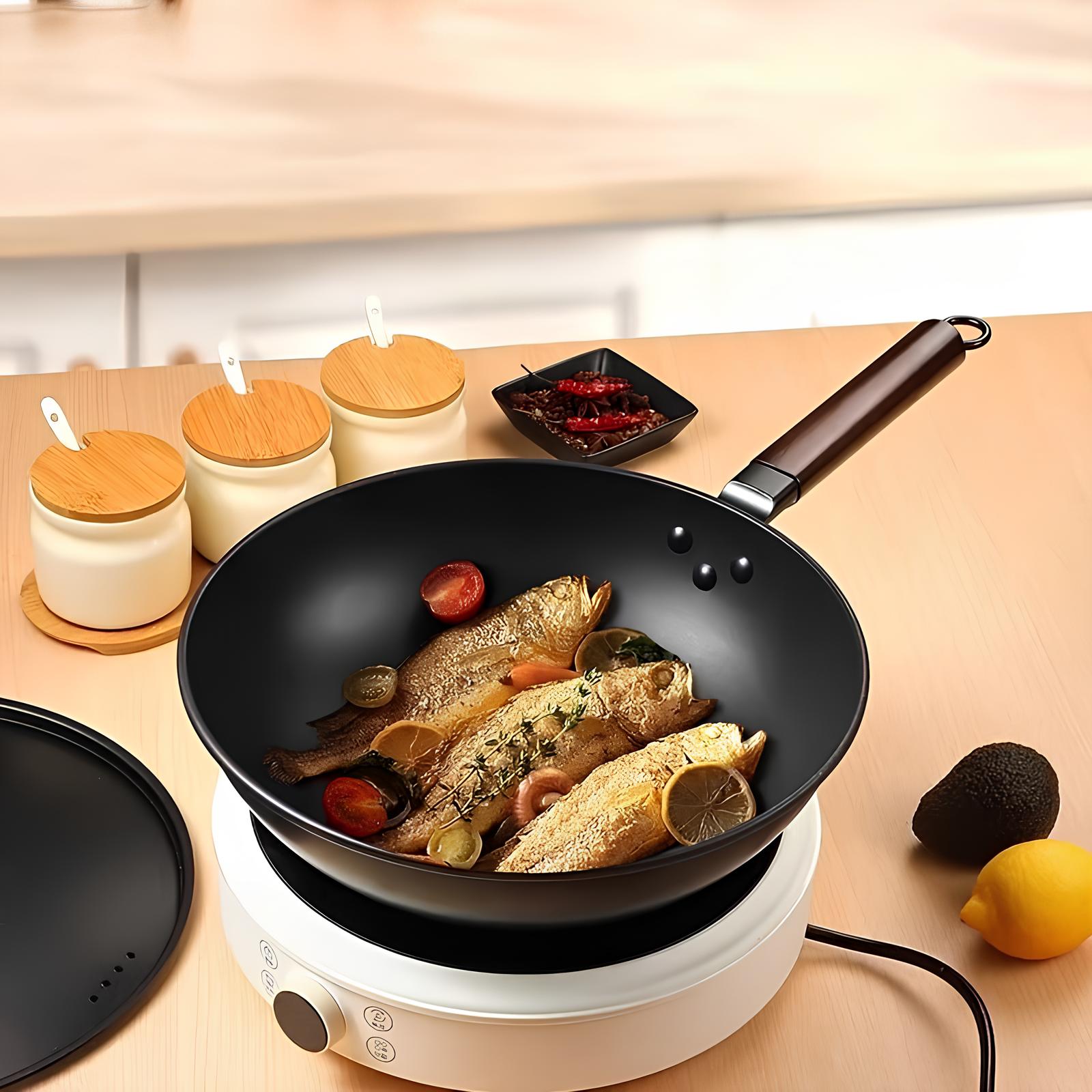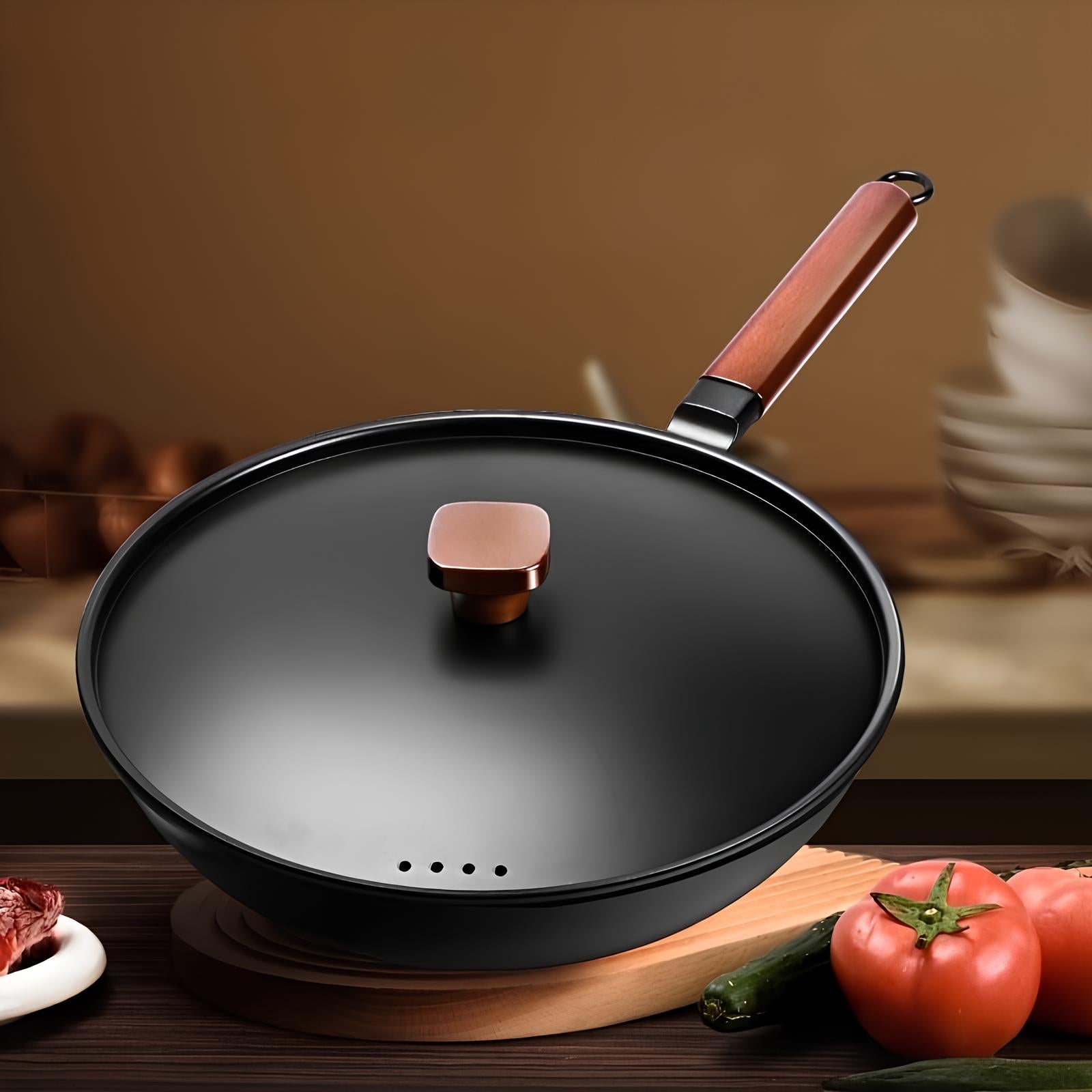 Explore our Skorter black non-stick cast iron, perfectly designed for gas or electric stoves. It features a wooden handle lid, adding a chic flair to your kitchen space.
