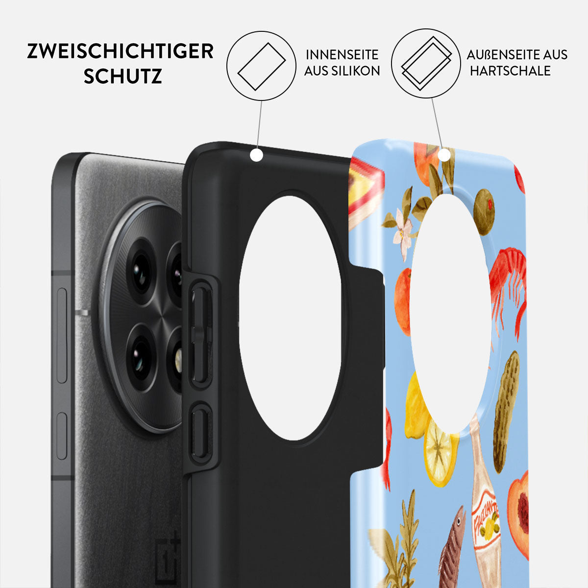 This design features: river crayfish, citrus fruits, picnic, lemon, egg, pickle, fresh vegetables, beach themes, peach, flower, olive.