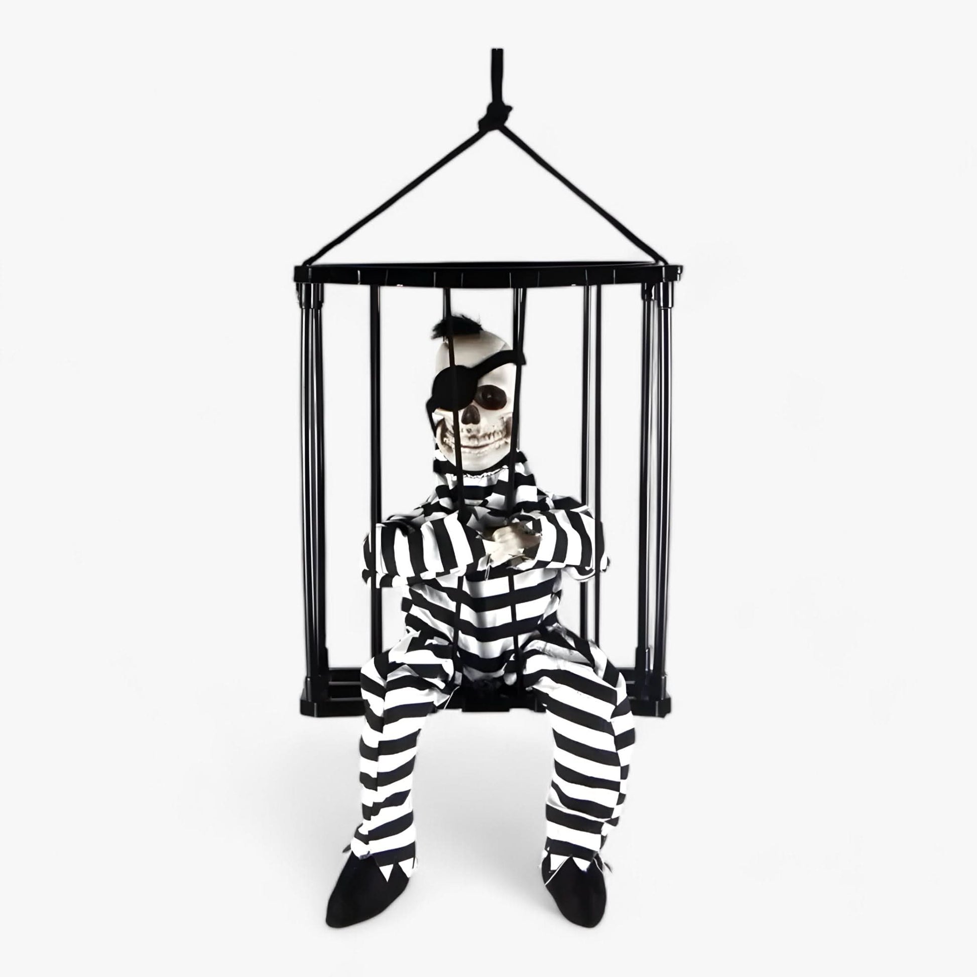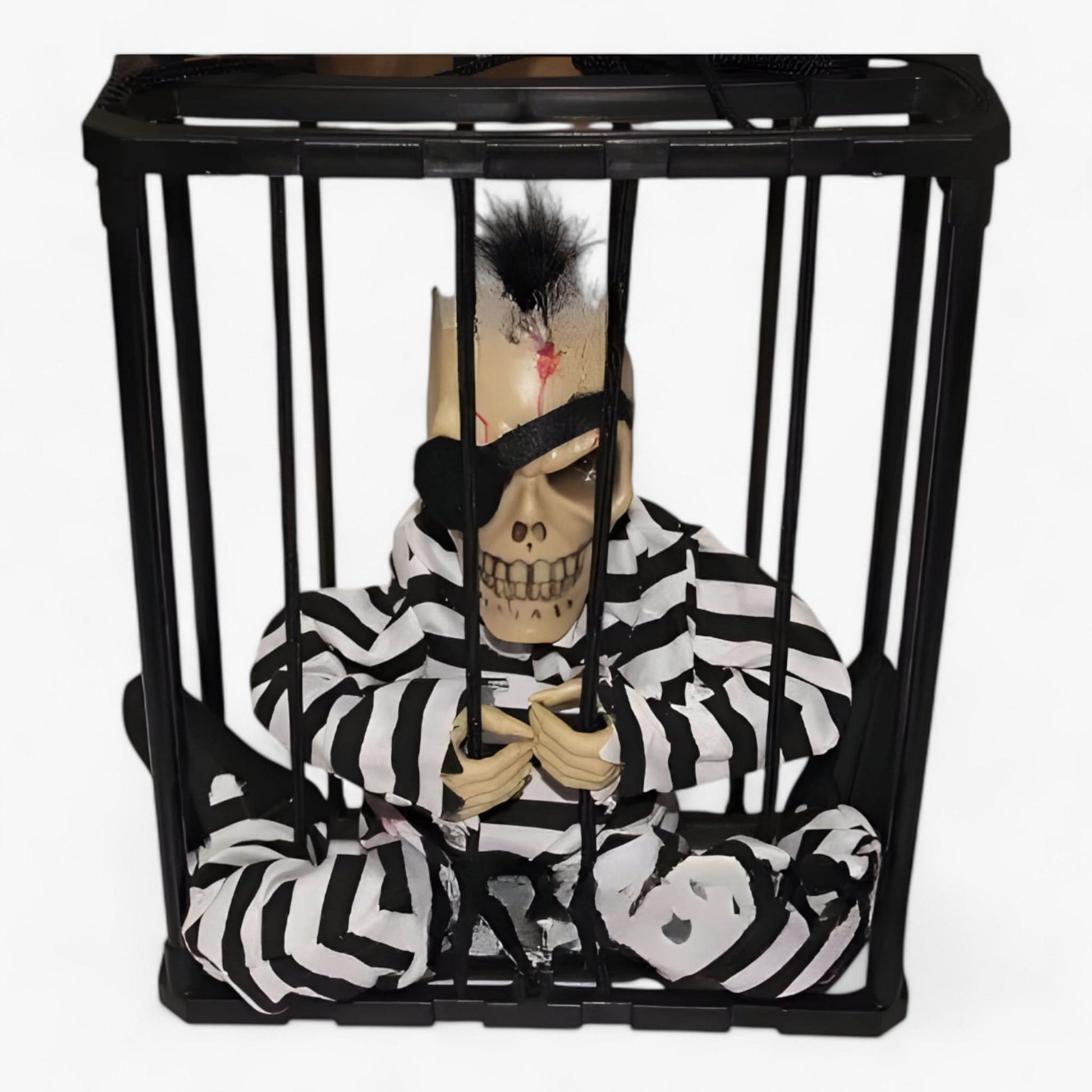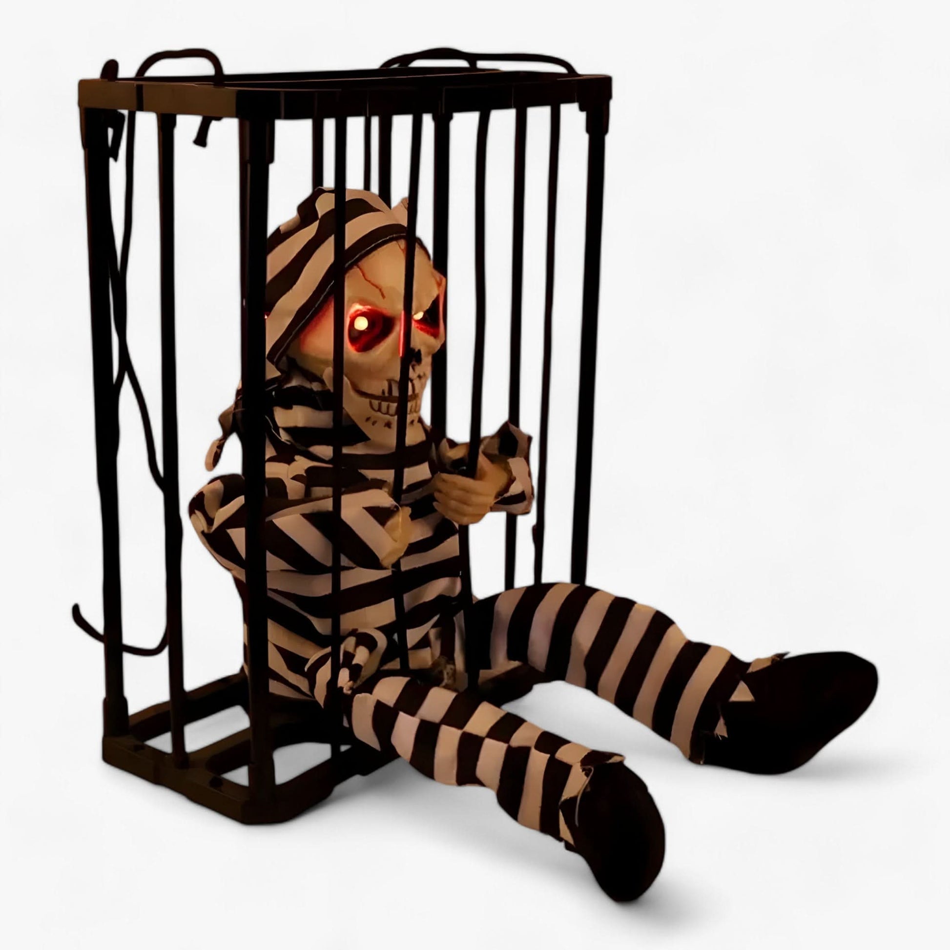 Watch as the prisoner's eyes light up and his mouth moves while he utters chilling phrases, sending shivers down the spine of anyone who dares to get too close. The lifelike movements and frightening voice make it the ultimate eye-catcher for any haunted house or Halloween party.