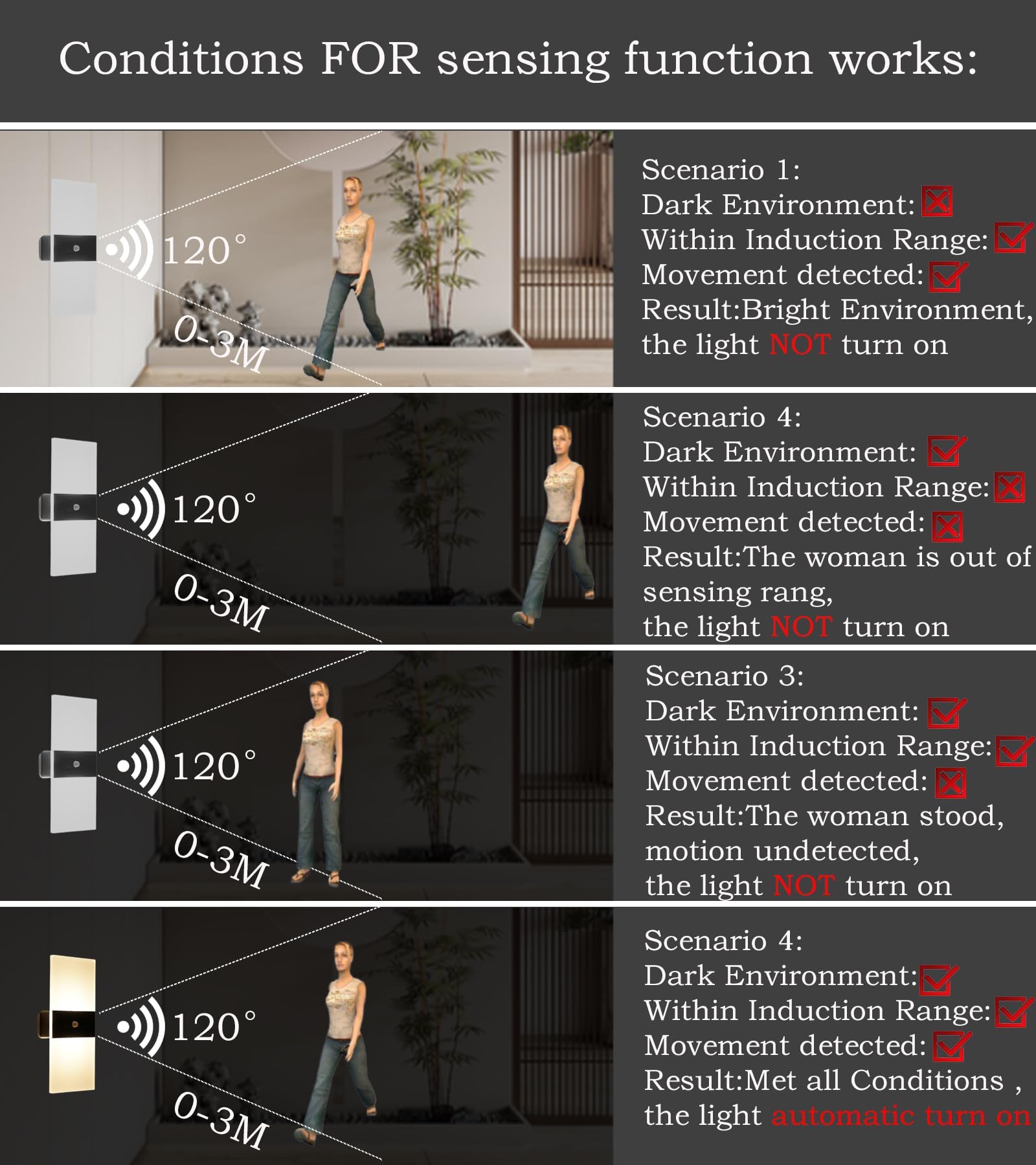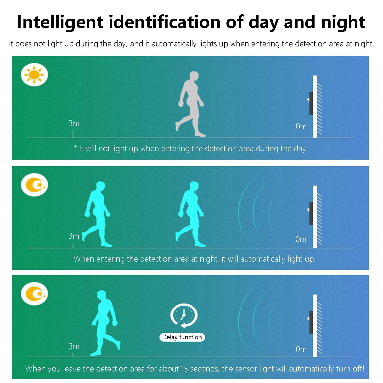 - **Two light modes**: Choose between "AUTO" mode for automatic activation upon motion within 0-3 meters, or "Always On" mode for constant light. The lights automatically turn off after 15 seconds in auto mode, helping to save energy.