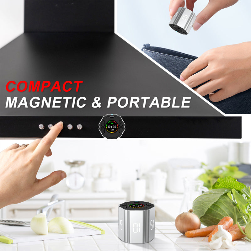 Portable, magnetic, and rechargeable. The timer includes a magnetic base that can stick to refrigerators or other metallic surfaces, allowing you to keep your hands available while tracking the time.