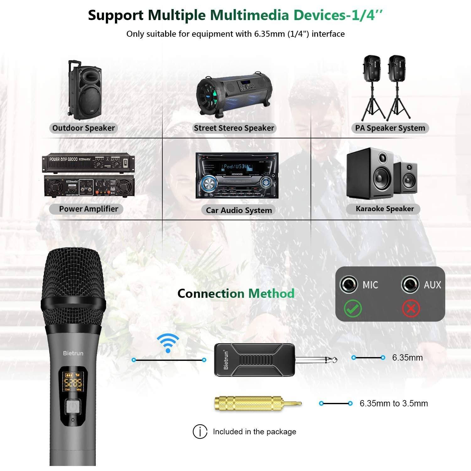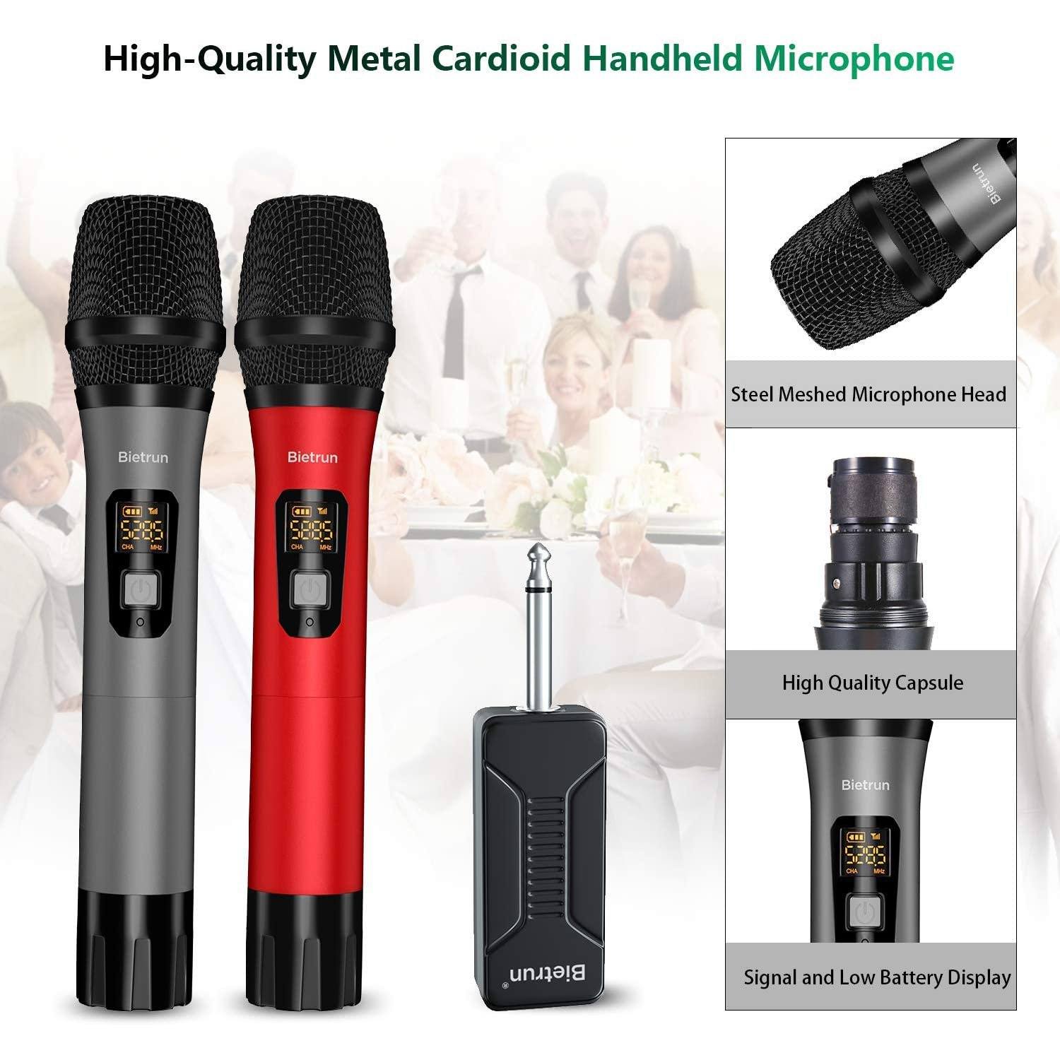 Bietrun wireless microphone system offers an impressive 160-foot range using UHF technology, featuring a dual handheld dynamic microphone ideal for karaoke. It includes a rechargeable receiver and has both 1/4’’ and 1/8’’ outputs, making it perfect for amplifiers, PA systems, singing events, church activities, and karaoke performances.