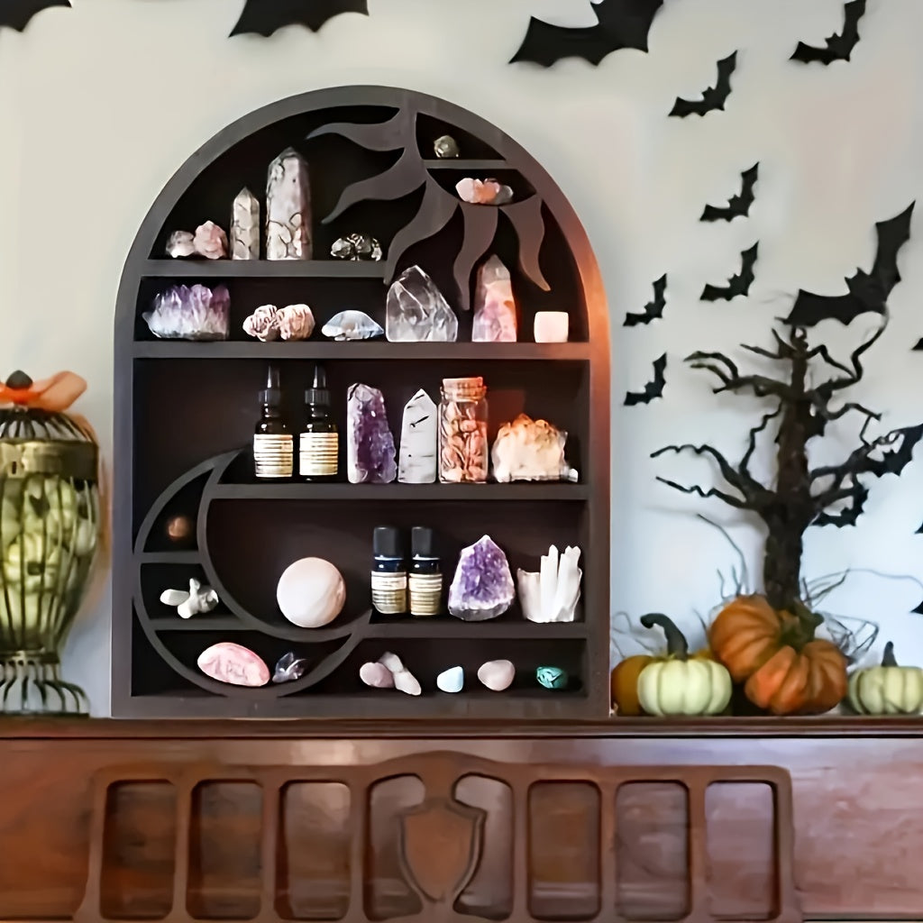Enhance your environment with this beautiful bohemian moon and sun wall shelf. Ideal for displaying crystals, scented candles, or other cherished items, this striking rack adds a boho flair to any interior. It serves as a perfect adornment for bedrooms, living rooms, or meditation spaces.