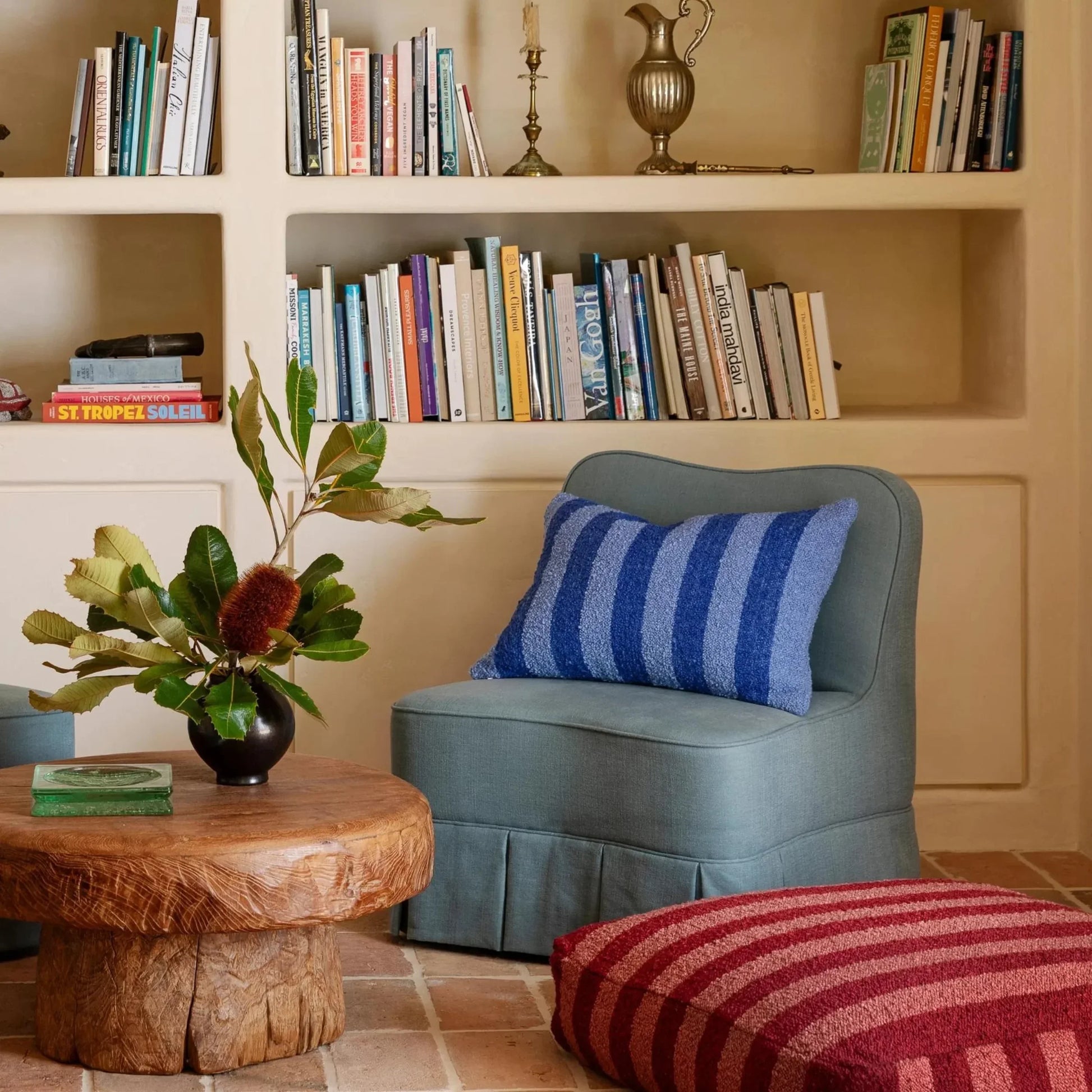 Crafted by hand using structural boucle, our Boucle Stripe Blue Cushion combines modern design with comfort. Adorned with striking stripes in deep ocean tones, this blue boucle pillow serves as an ideal choice for patterns influenced by seaside living and nautical stripes in your bedroom or lounge area.
