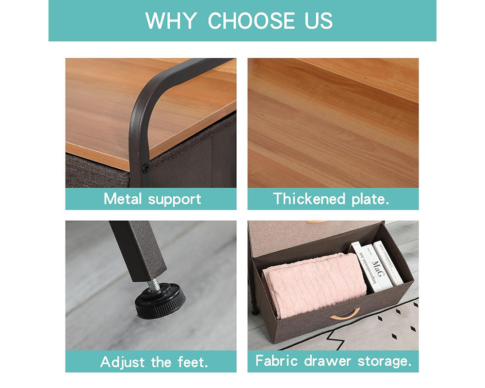 Made from a strong metal frame, eco-friendly MDF top, and non-woven fabric drawers, this 5-drawer storage unit is built to endure and designed for everyday use. Each drawer features wooden handles that provide easy access and convenience.