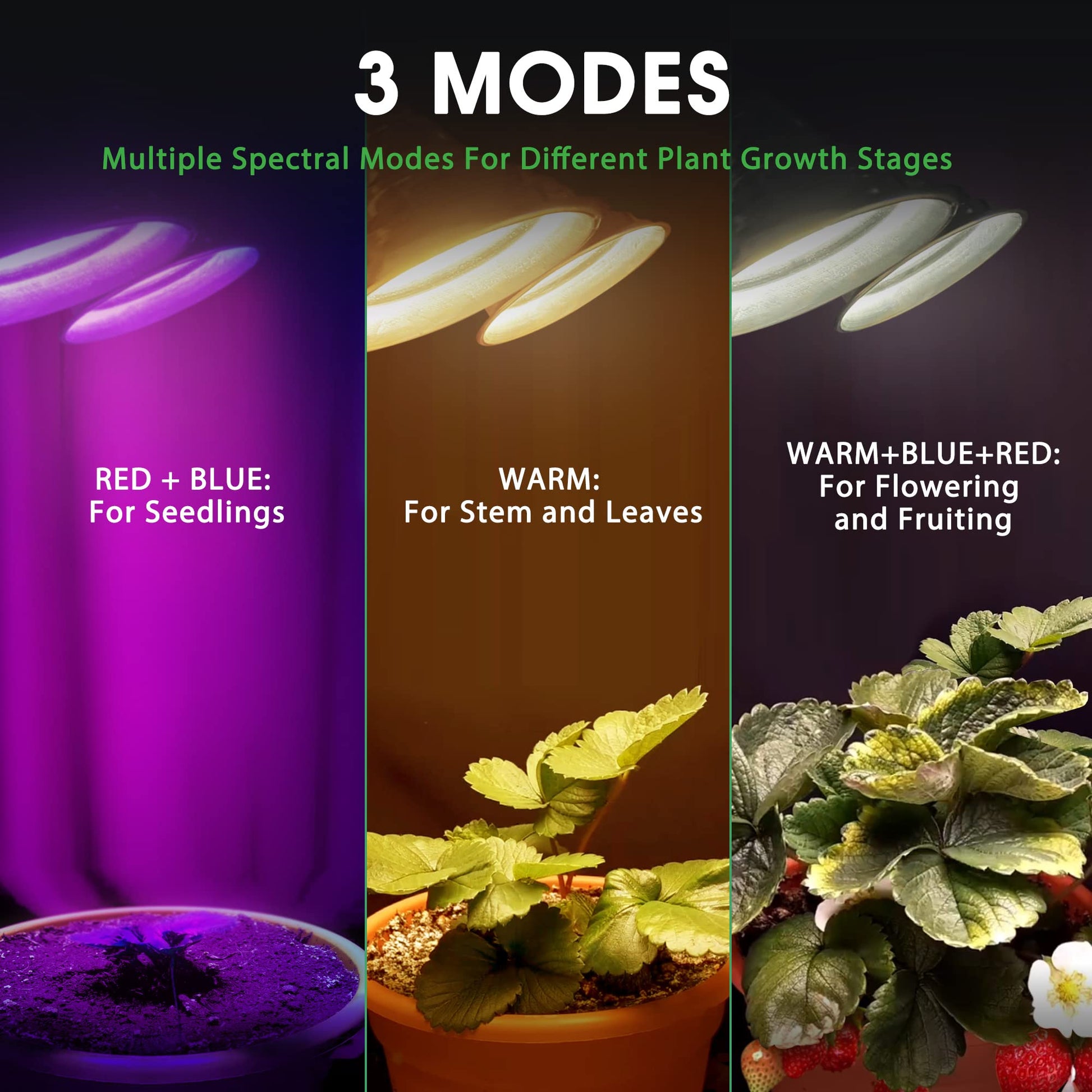 • 3 SPECTRUM MODES & 10 BRIGHTNESS SETTINGS: Choose from three spectrum modes: Purple light for seedlings, Warm white light for stalks and leaves, and Natural light (Full Spectrum) for flowering and fruiting. You can also adjust the brightness from 10% to 100% to suit your plants' specific needs.