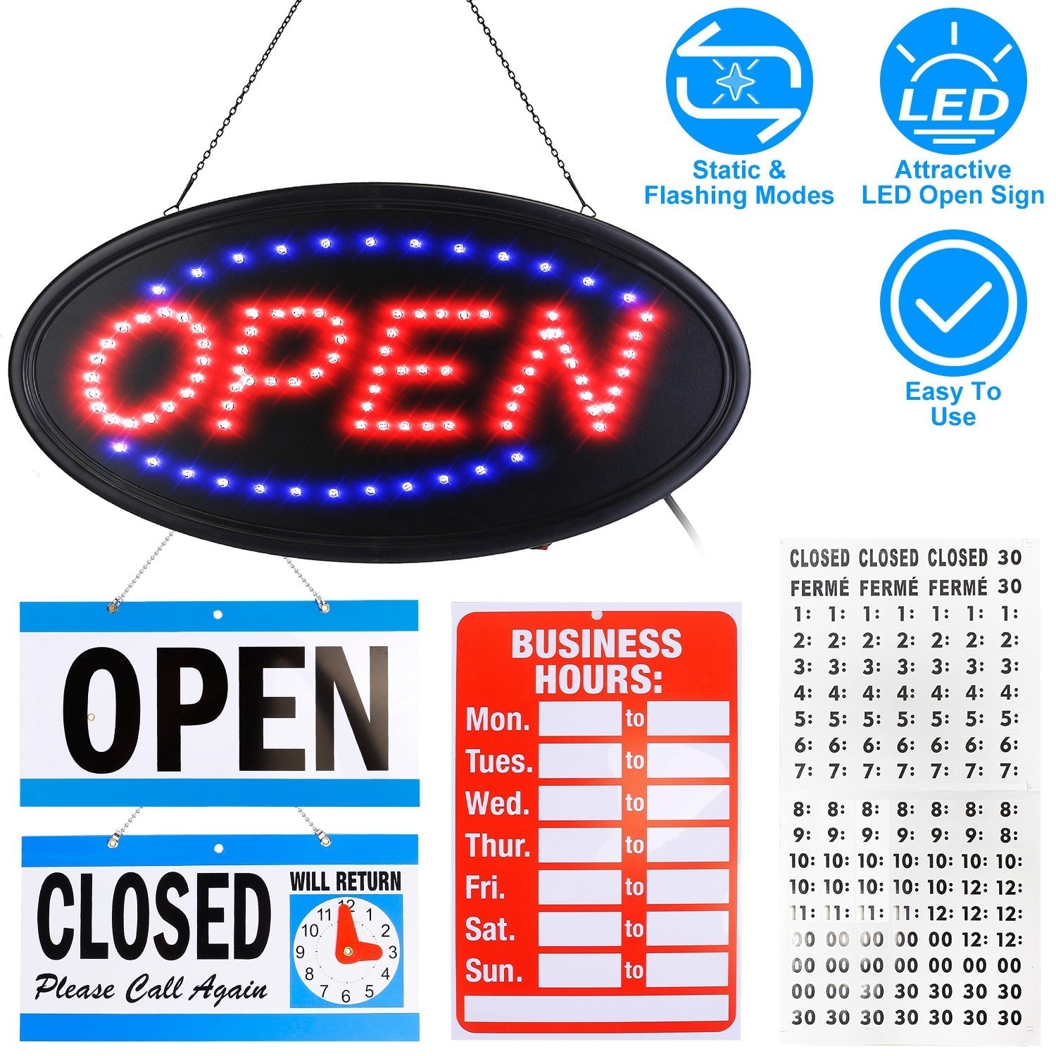 Our LED "Open" neon sign boasts eye-catching red and blue LED lights and comes equipped with two lighting options (static and sporadically flashing) that effortlessly captivate the attention of potential clients from afar. This sign is crafted for long-lasting use while maintaining low energy consumption, making it environmentally friendly. Furthermore, it is designed for easy installation, suitable for a range of retail environments, including shops, bars, hotels, restaurants, and beyond. Simply mount it in your desired location and you're ready to go.