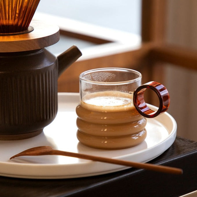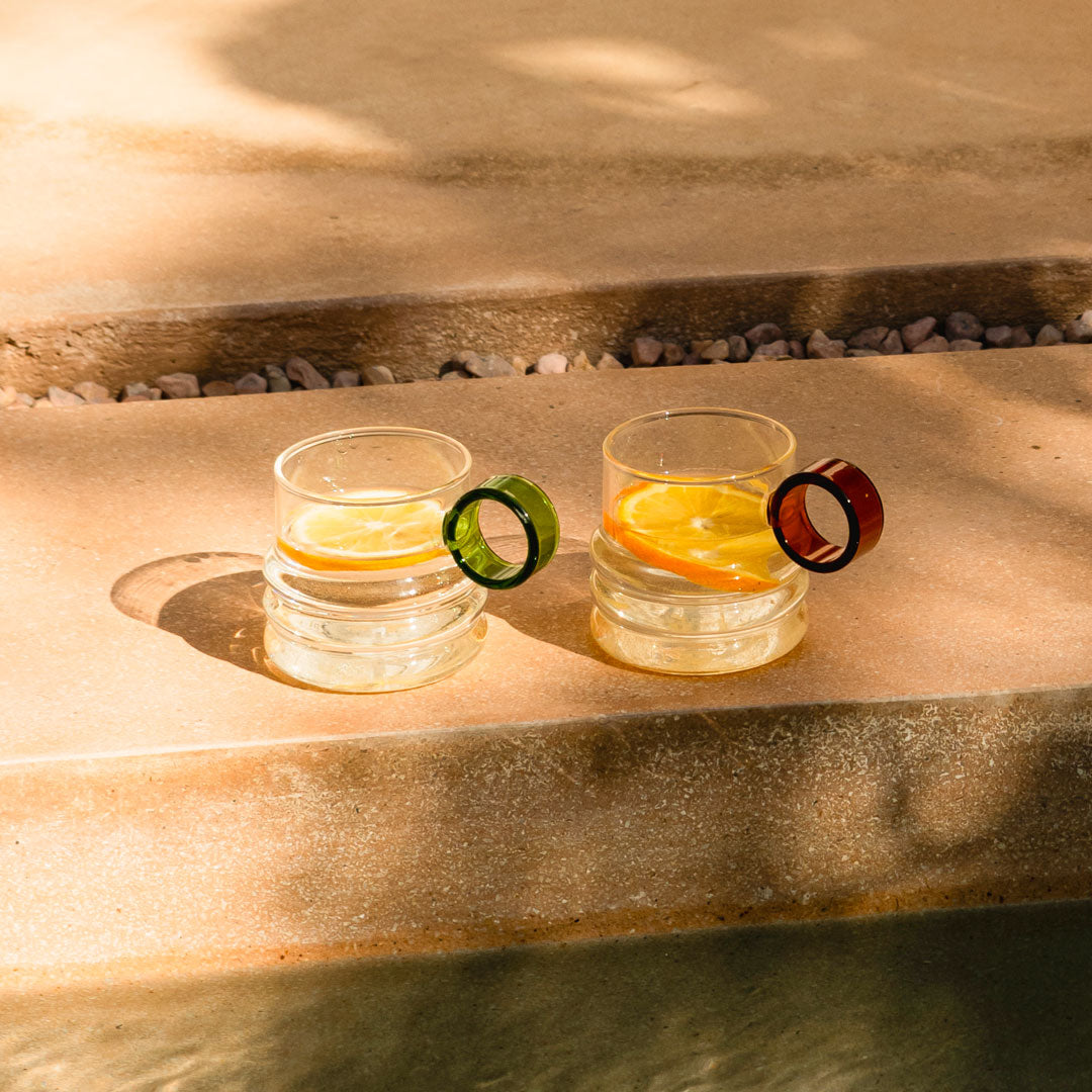 This glass is available in three attractive shades: Blue, Green, and Brown. Its round handle embodies the essence of the brand. With a volume of 300 ml, it is ideal for enjoying your coffee or taking a quick pause.