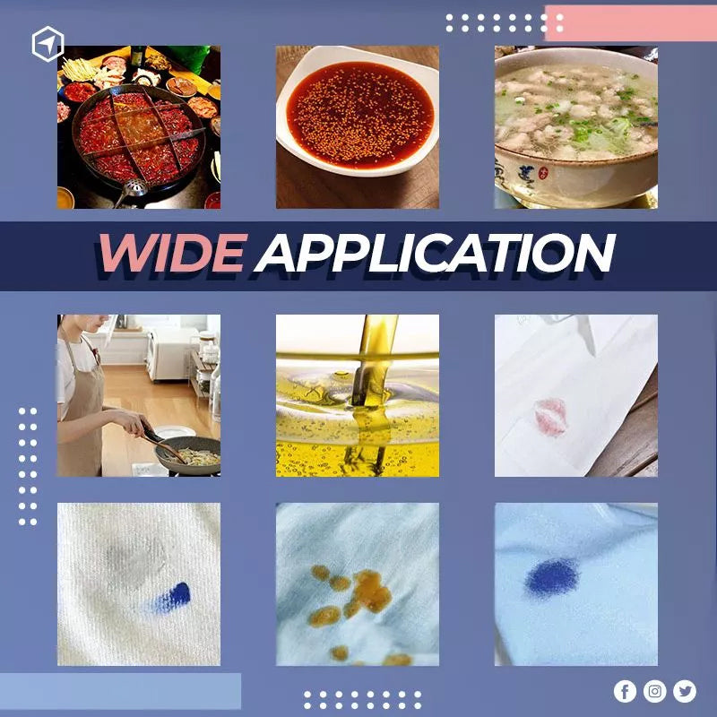 Powerful?oil stain elimination:?It has been specifically formulated to?target oil marks.?Moreover, it also proves effective against blood, food stains, beverages (coffee, tea, wine, milk, cola, etc.), chalk, uncured latex paint, chocolate, raw eggs, candle wax, tough residues, ketchup, grease, lipstick, makeup, and much more.