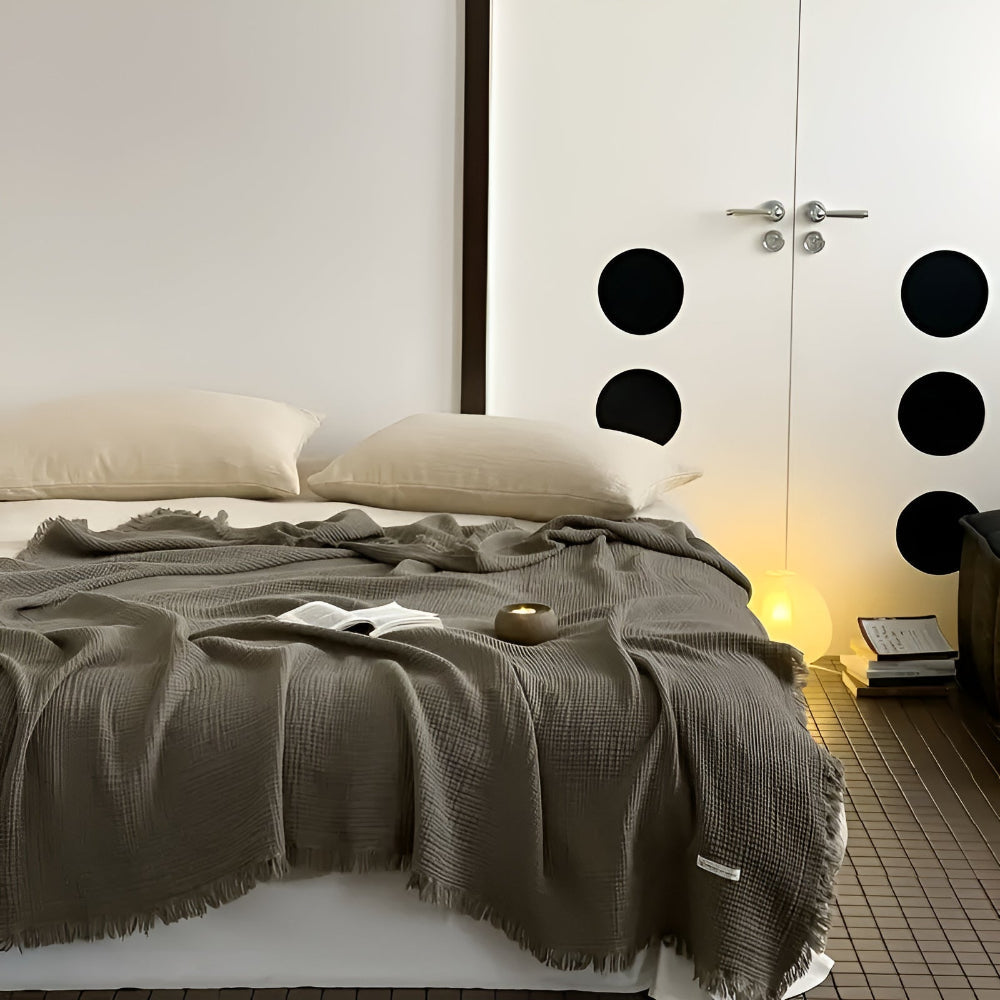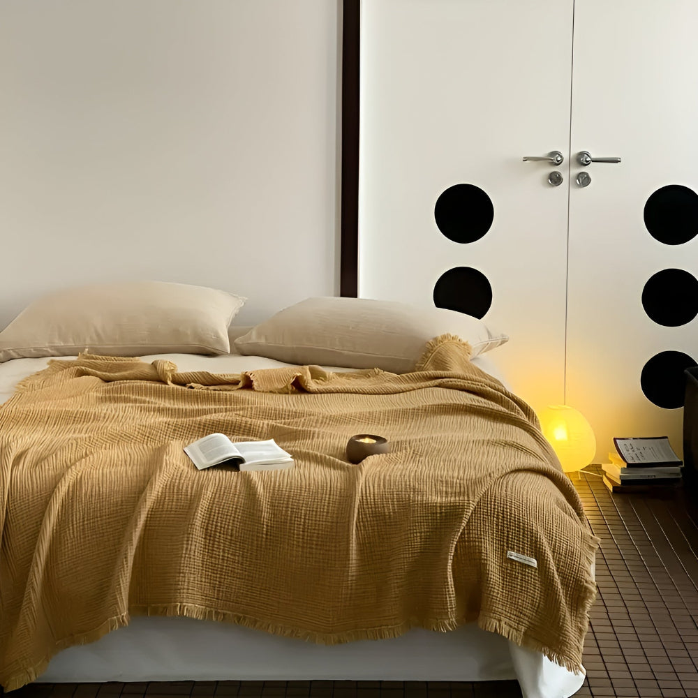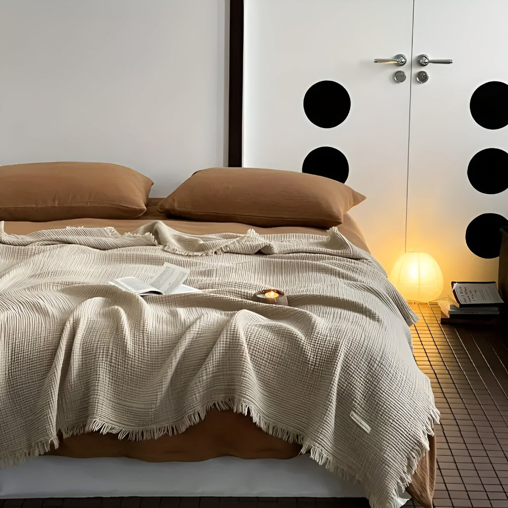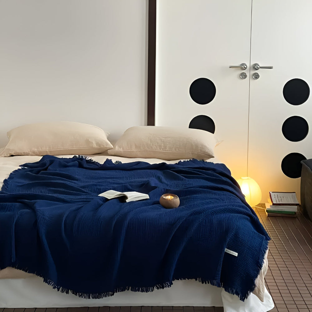 Experience the essence of comfort with this Cotton Crinkle Tassel Blanket, made from 100% cotton featuring a delightful crinkled finish. This piece is designed to blend style with practicality, making it an excellent addition to your home aesthetic or for lounging during travel, relaxing moments, or short naps.