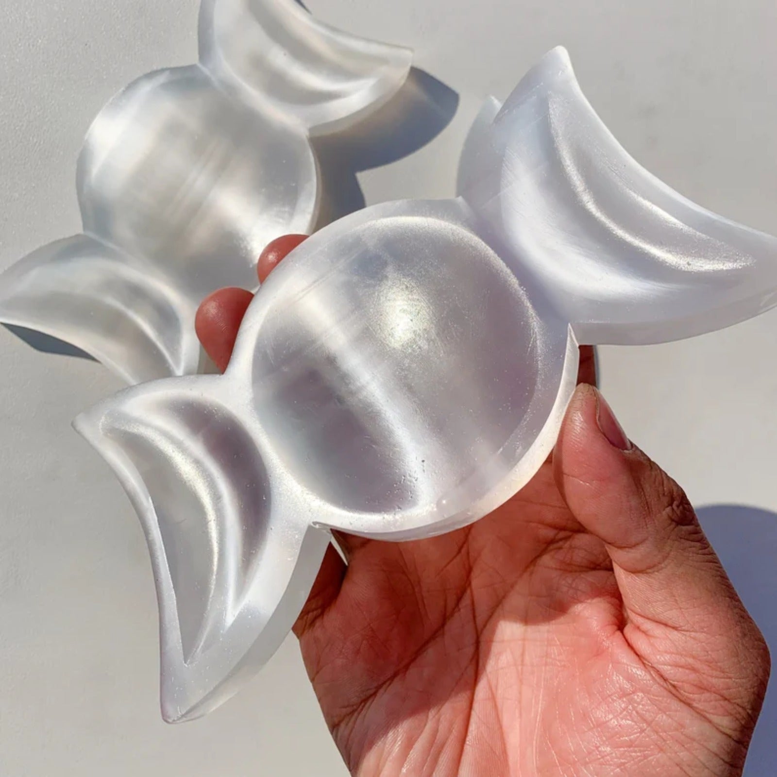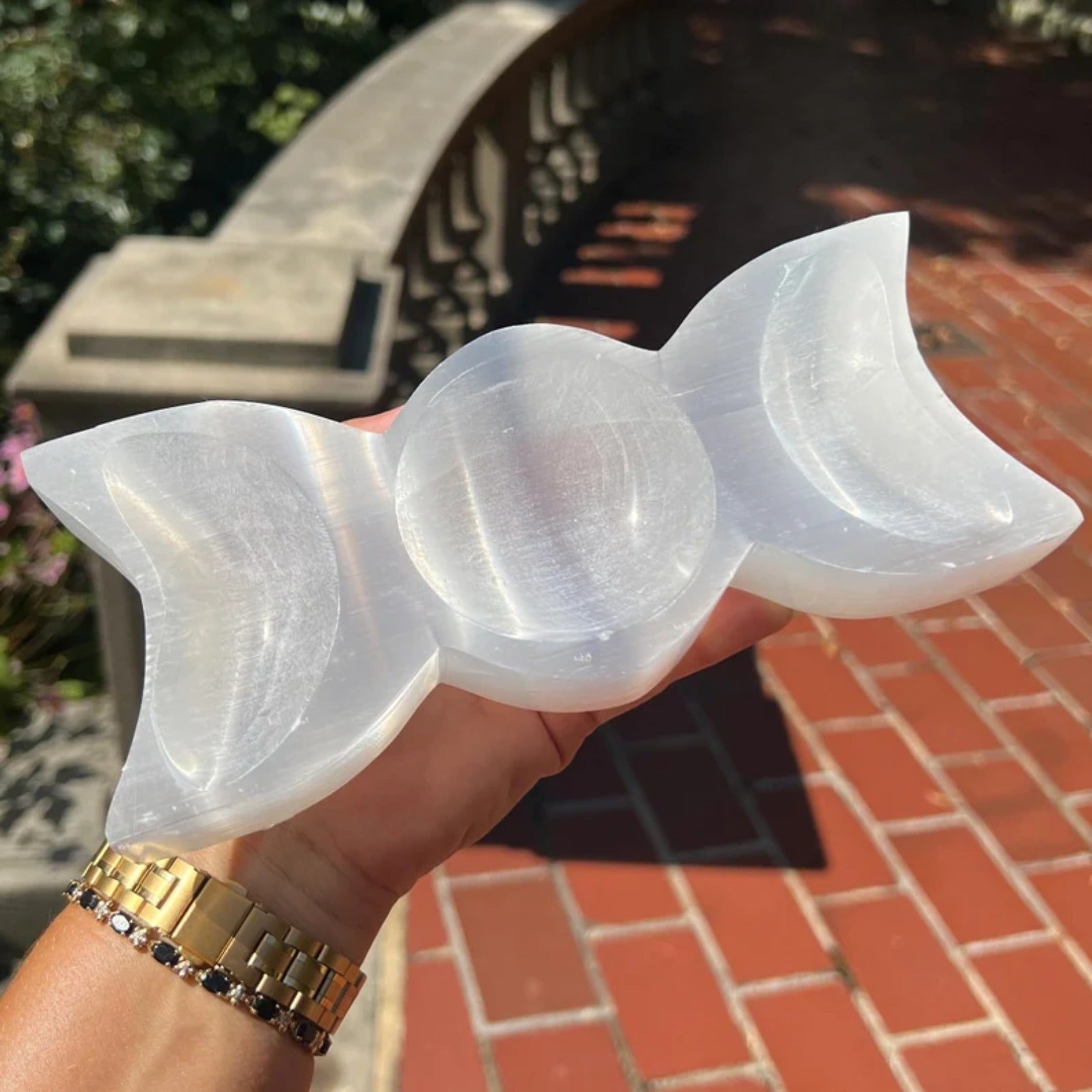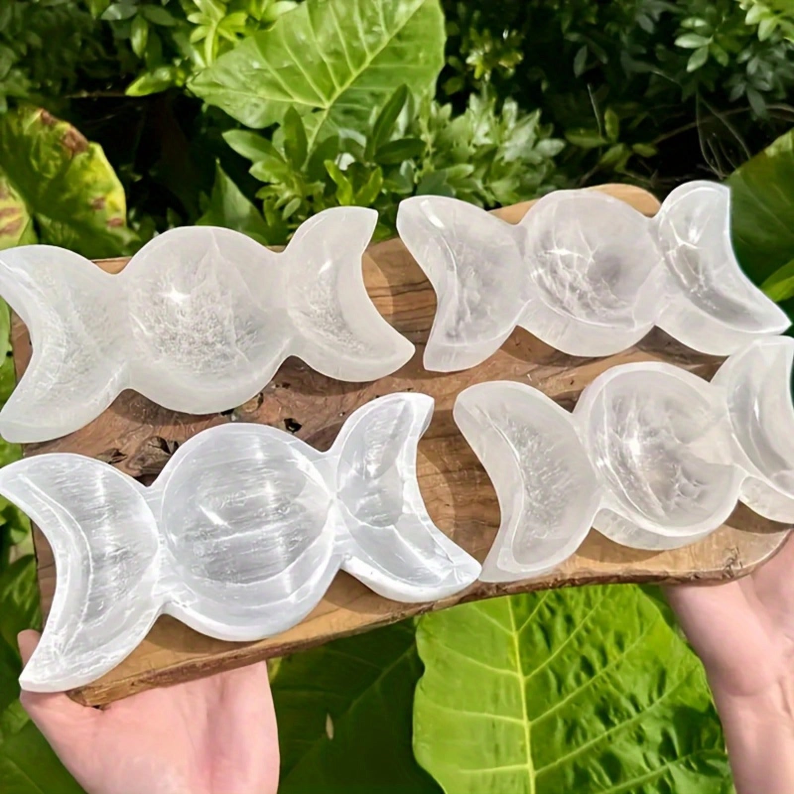 The CrystalHola moon bowl embodies a charming boho chic aesthetic, crafted from gypsum. This distinctive decorative piece combines beauty and functionality effortlessly. Adorned with exquisite crystal accents, it's perfect for showcasing candies, jewelry, or various small keepsakes. With its bohemian flair and crystalline stone finish, this bowl enhances the tranquil and sophisticated vibe of any room in your house.