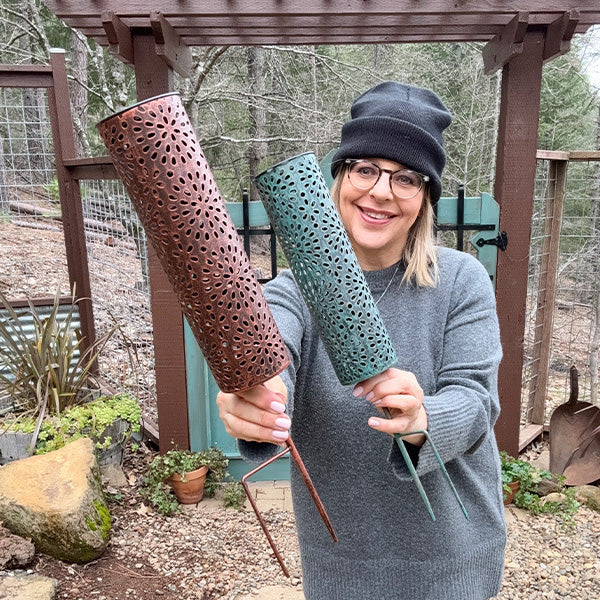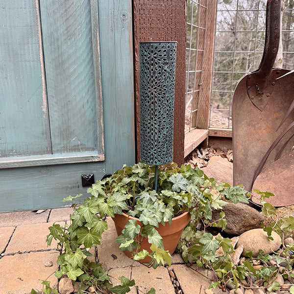 Give your garden a special glow with our cylindrical metal solar light garden stakes, conveniently sold in sets of two! These stunning lights not only bring brightness to your garden – they create a captivating play of shadows at dusk thanks to their intricately designed floral cutouts. As the sun sets, you can watch as they cast mesmerizing patterns that transform your outdoor space into a magical retreat. One shines in a rich copper tone, while the other delights with a patinated bluish-green surface – a perfect duo in farmhouse style. No cords, no hassle, just pure solar-powered charm to light up your nights!