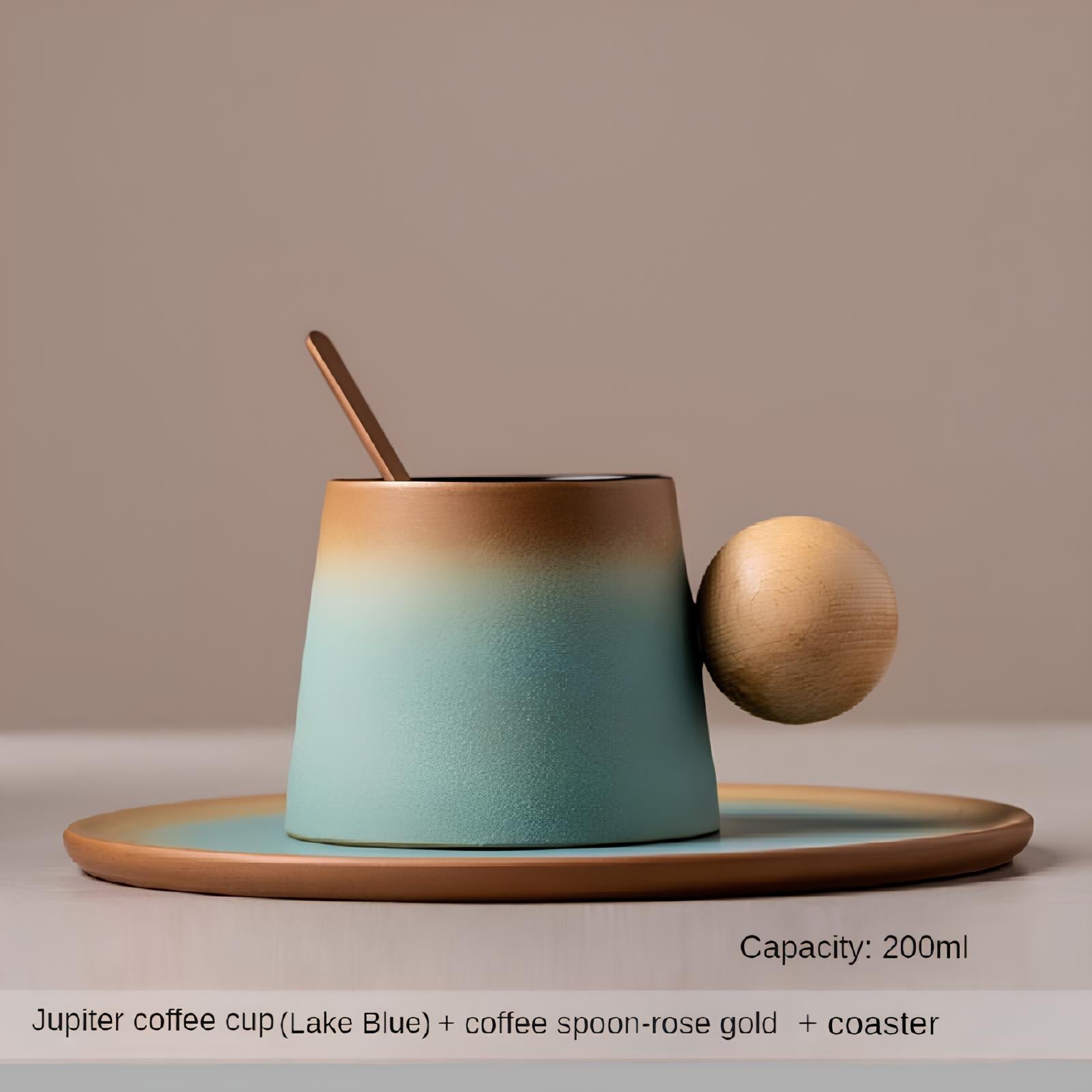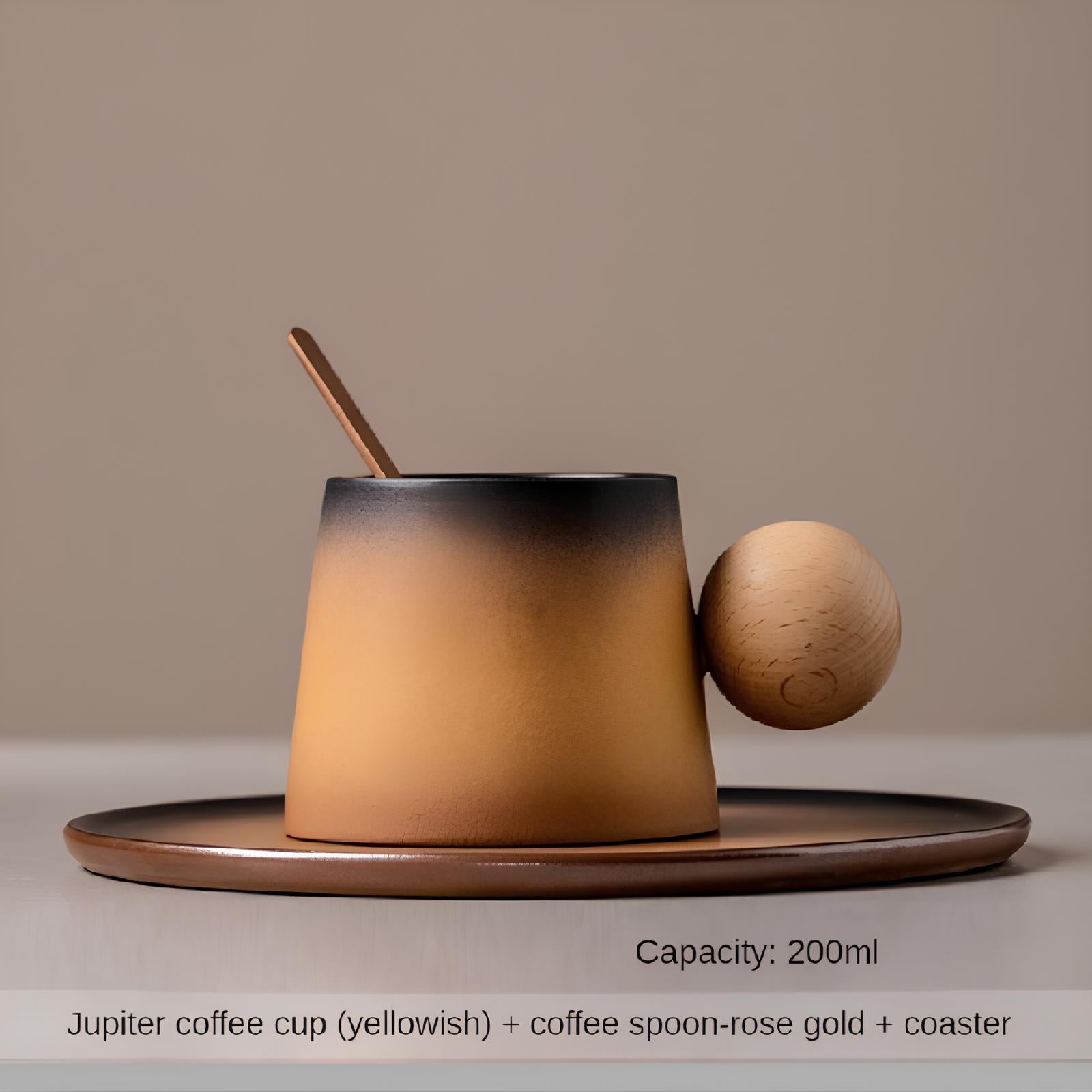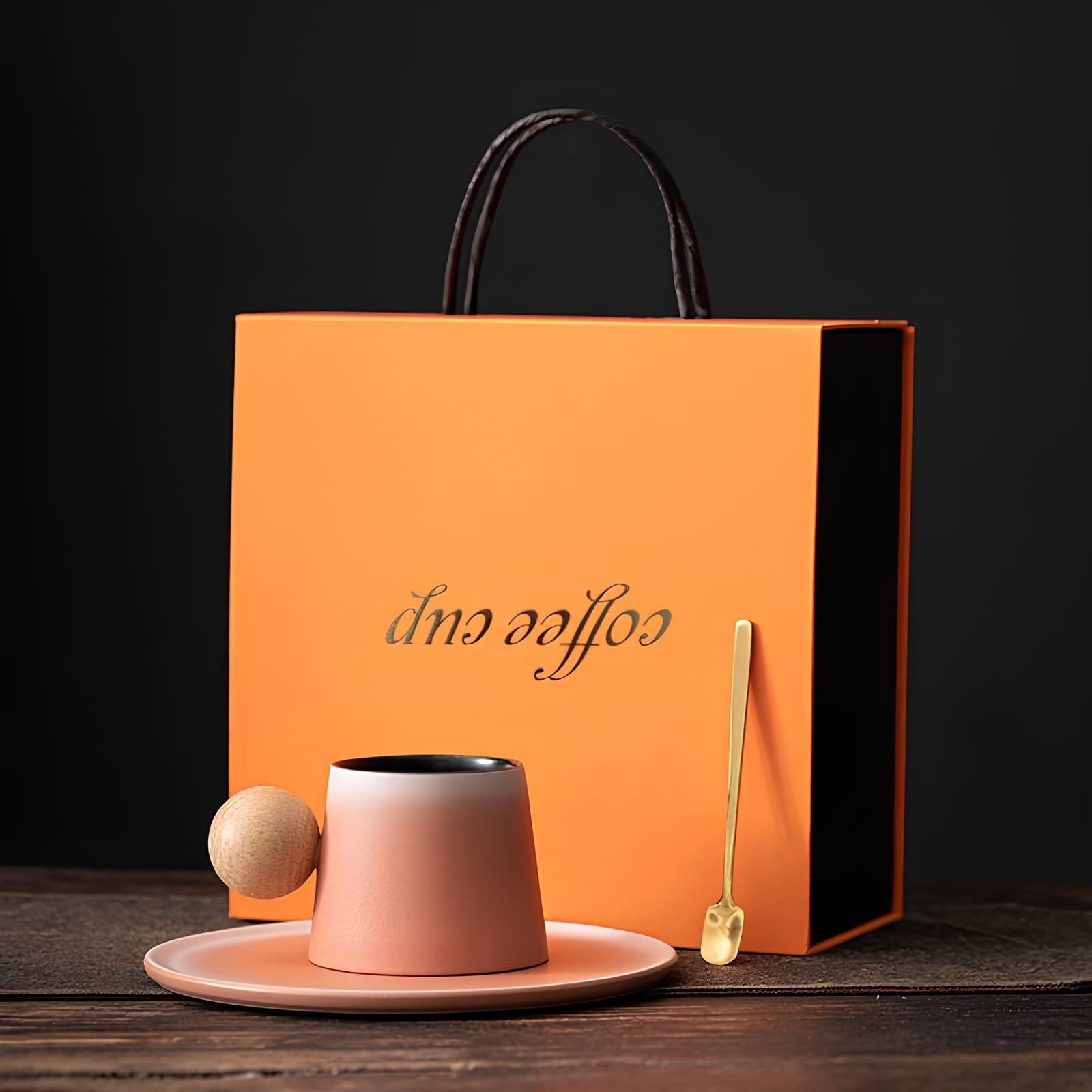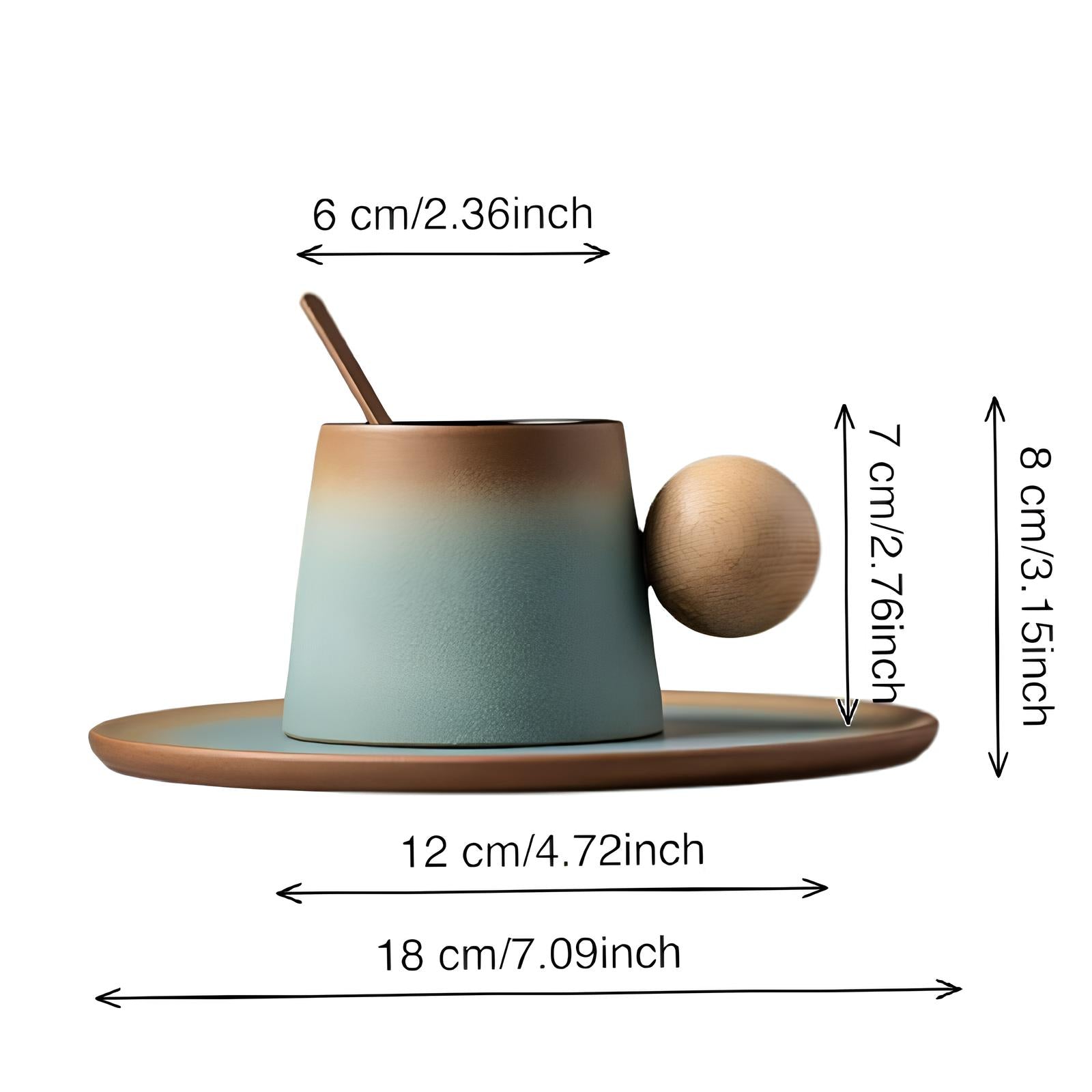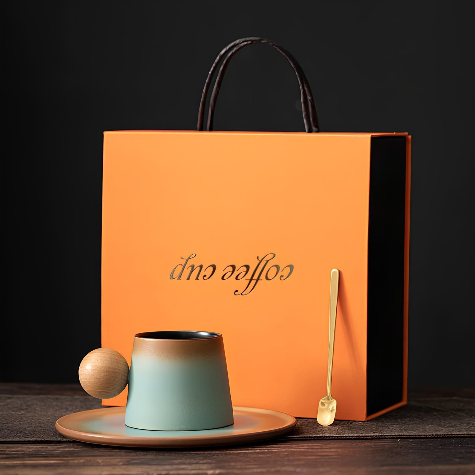 Discover our ceramic coffee set, the ideal blend of elegance and functionality. Each set includes a stunning coffee cup with a wooden handle for a comfortable grip, a matching plate, and a sleek spoon.