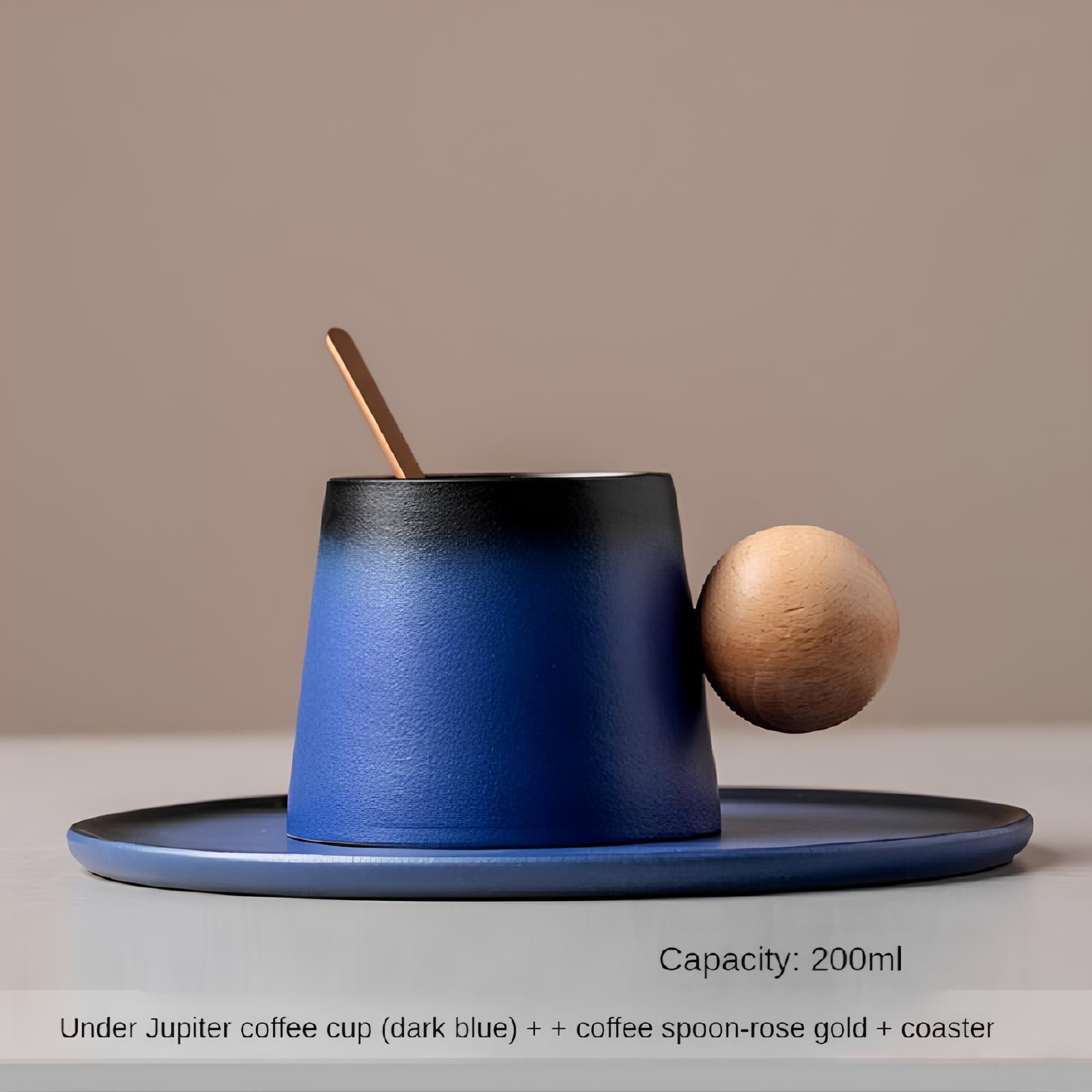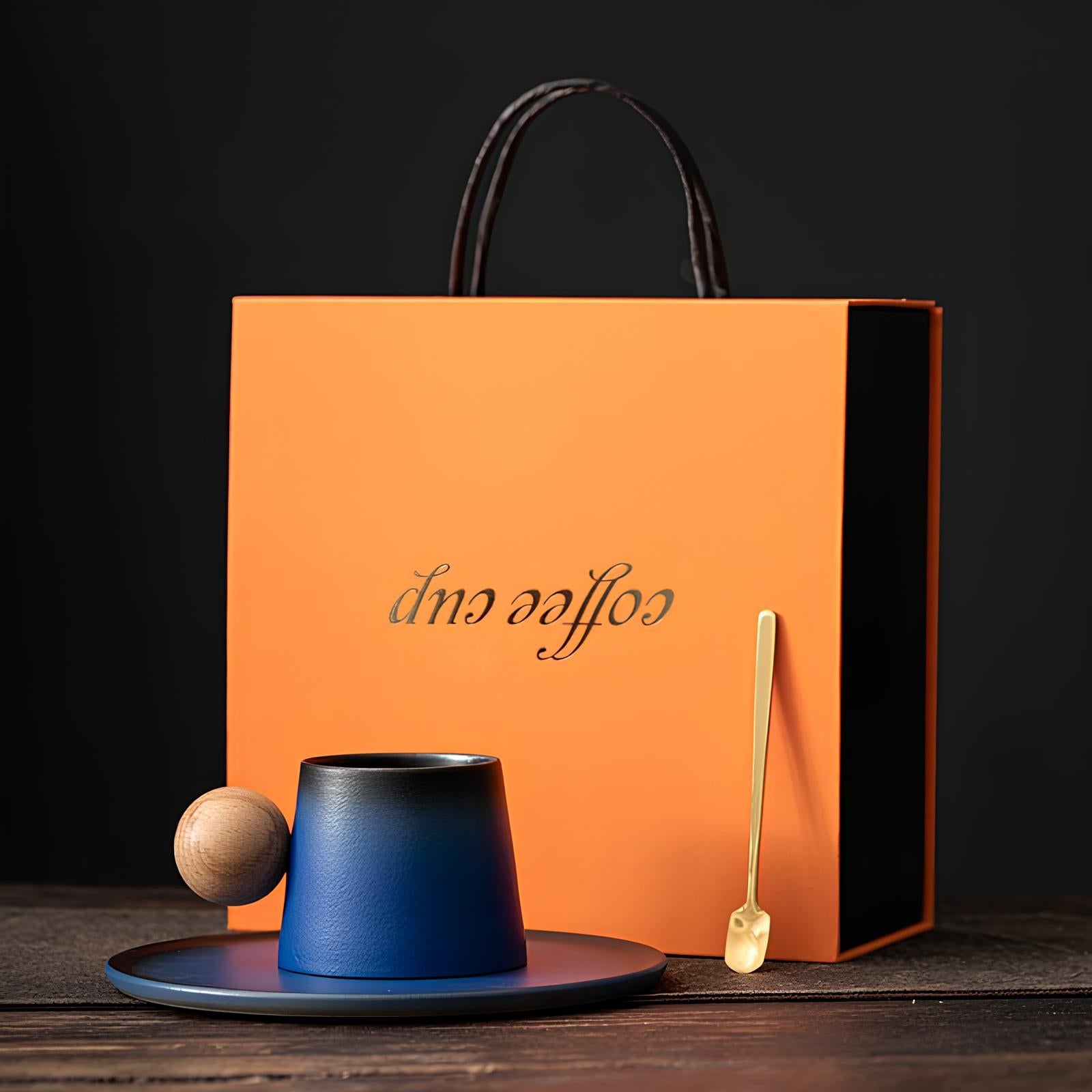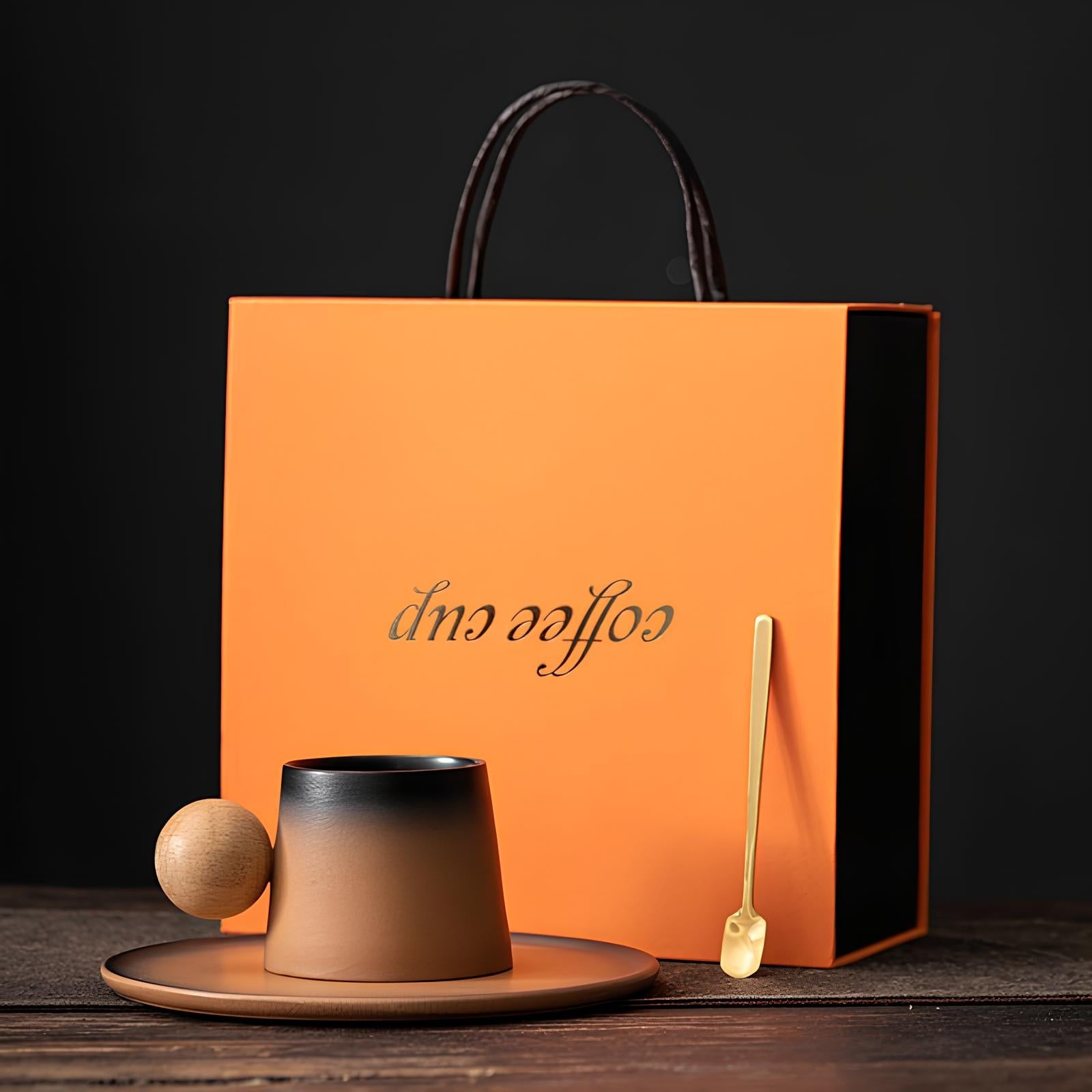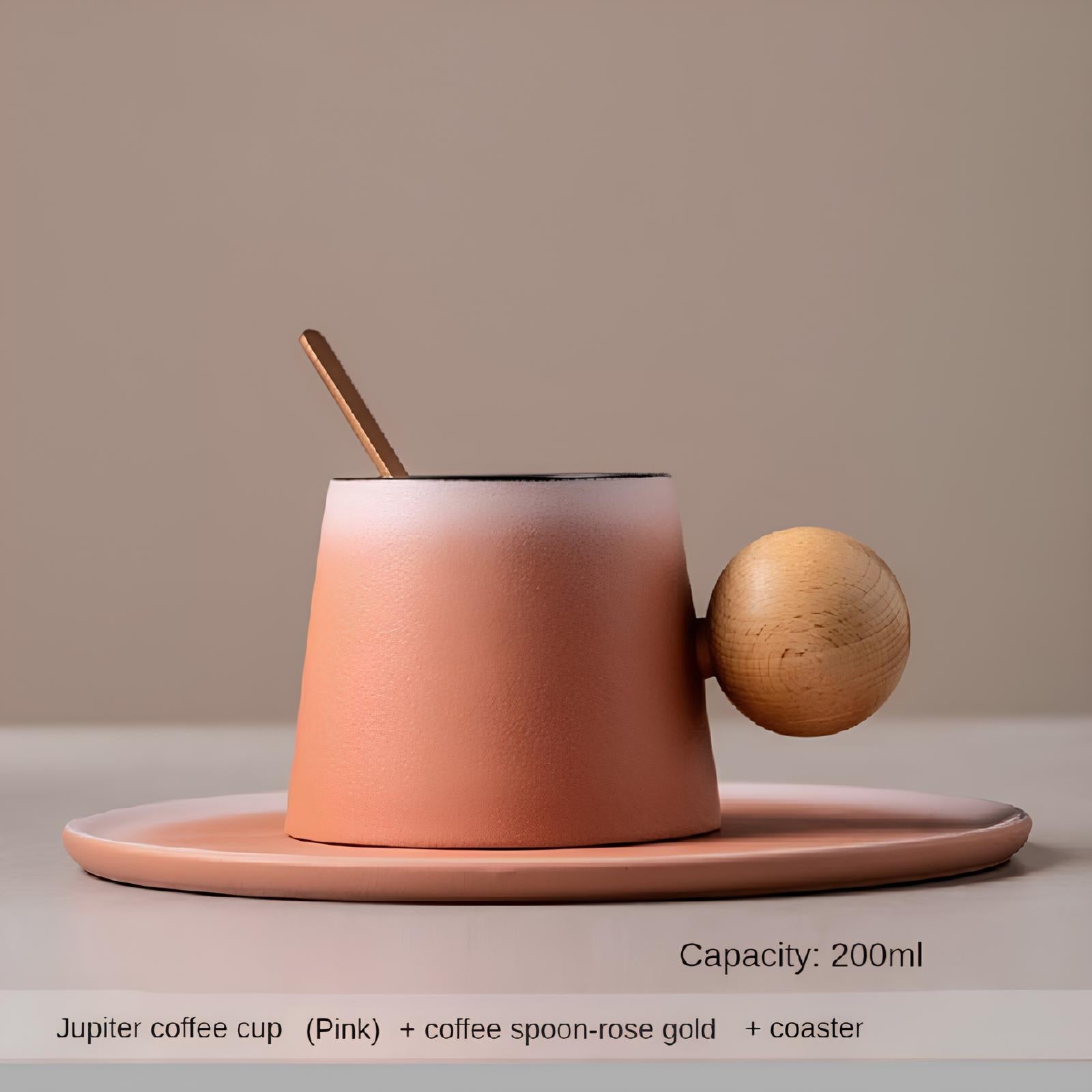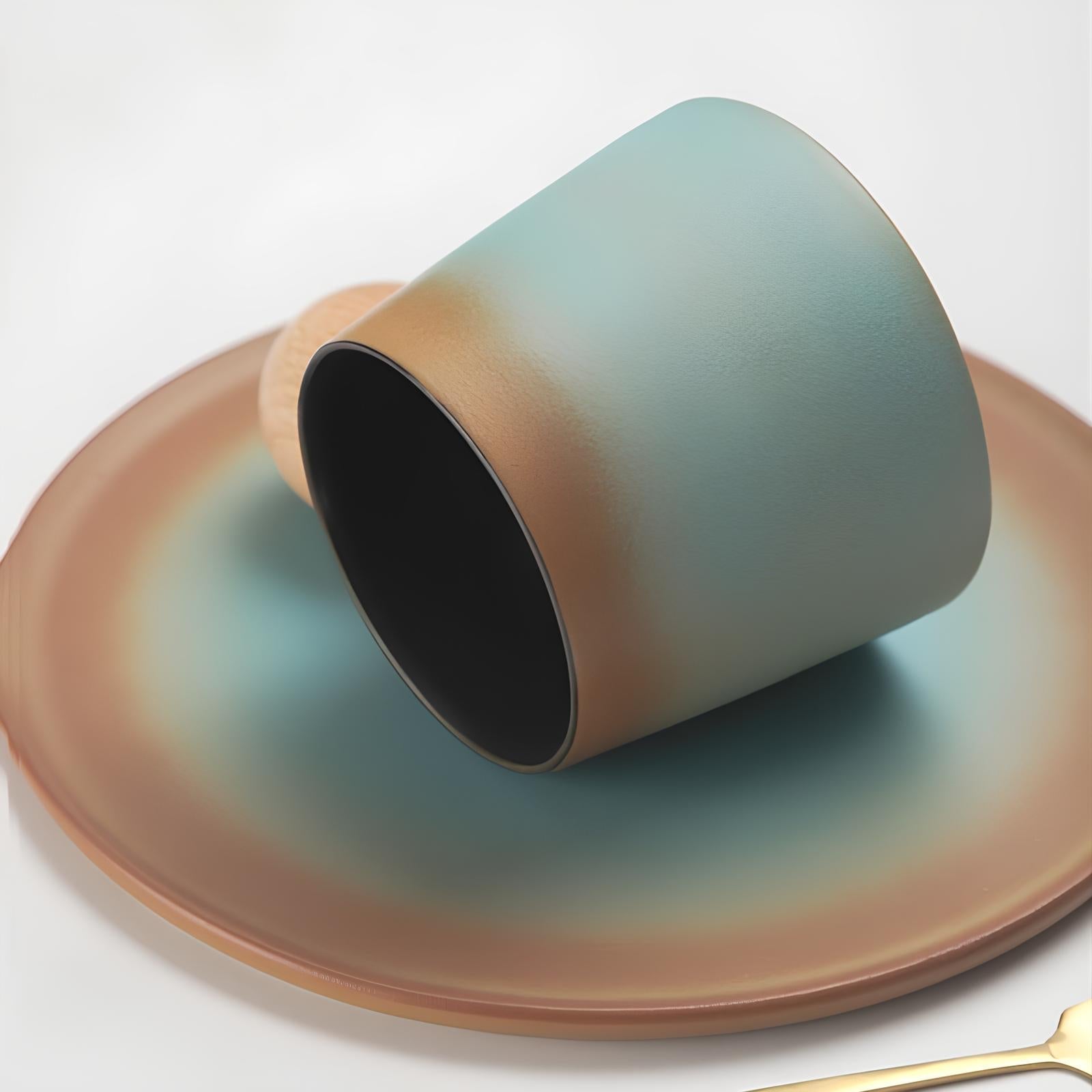 Discover our ceramic coffee set, the ideal blend of elegance and functionality. Each set includes a stunning coffee cup with a wooden handle for a comfortable grip, a matching plate, and a sleek spoon.