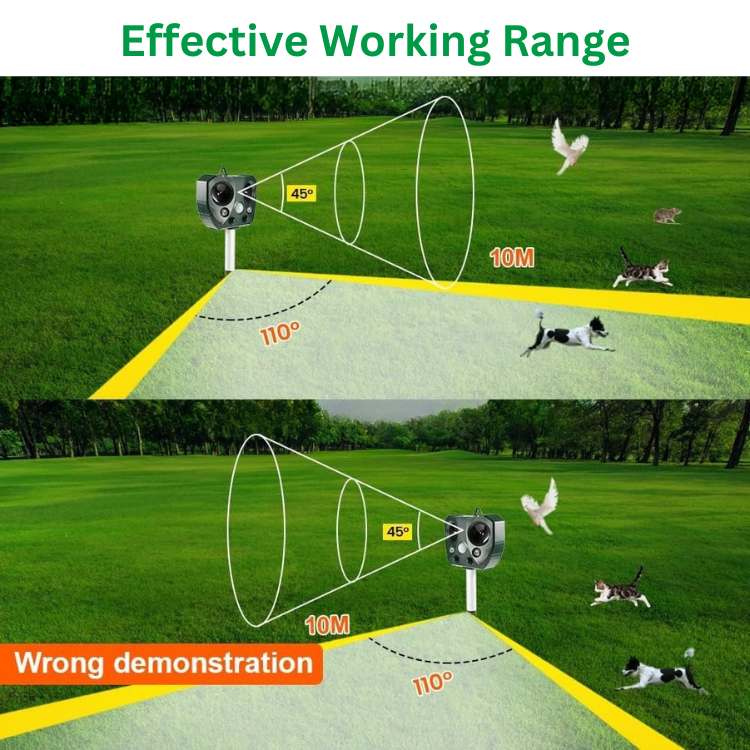 The EcoSonic Guard provides a safe and practical way to deter animals from gardens, patios, or fields. Using high-frequency sound waves that are inaudible to humans, it activates automatically when motion is detected by the PIR sensor, which covers up to 110° and a range of 9 meters. With IPX4 weatherproof certification, the device operates reliably in rain or snow. Flexible power options include solar charging or USB connection, making it suitable for various locations. Easy to install with ground spikes or wall mounting, the EcoSonic Guard is a versatile choice for outdoor protection without chemicals.